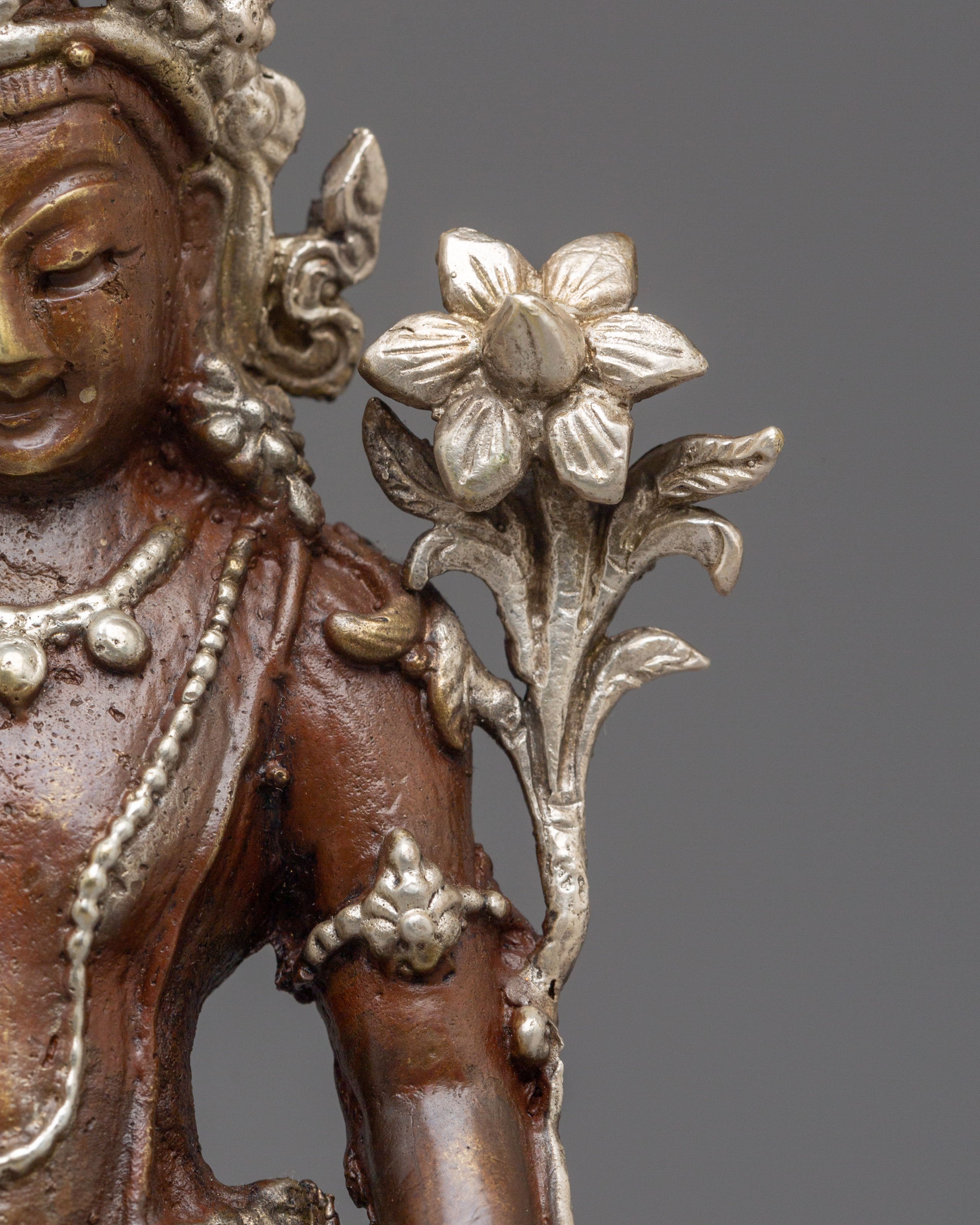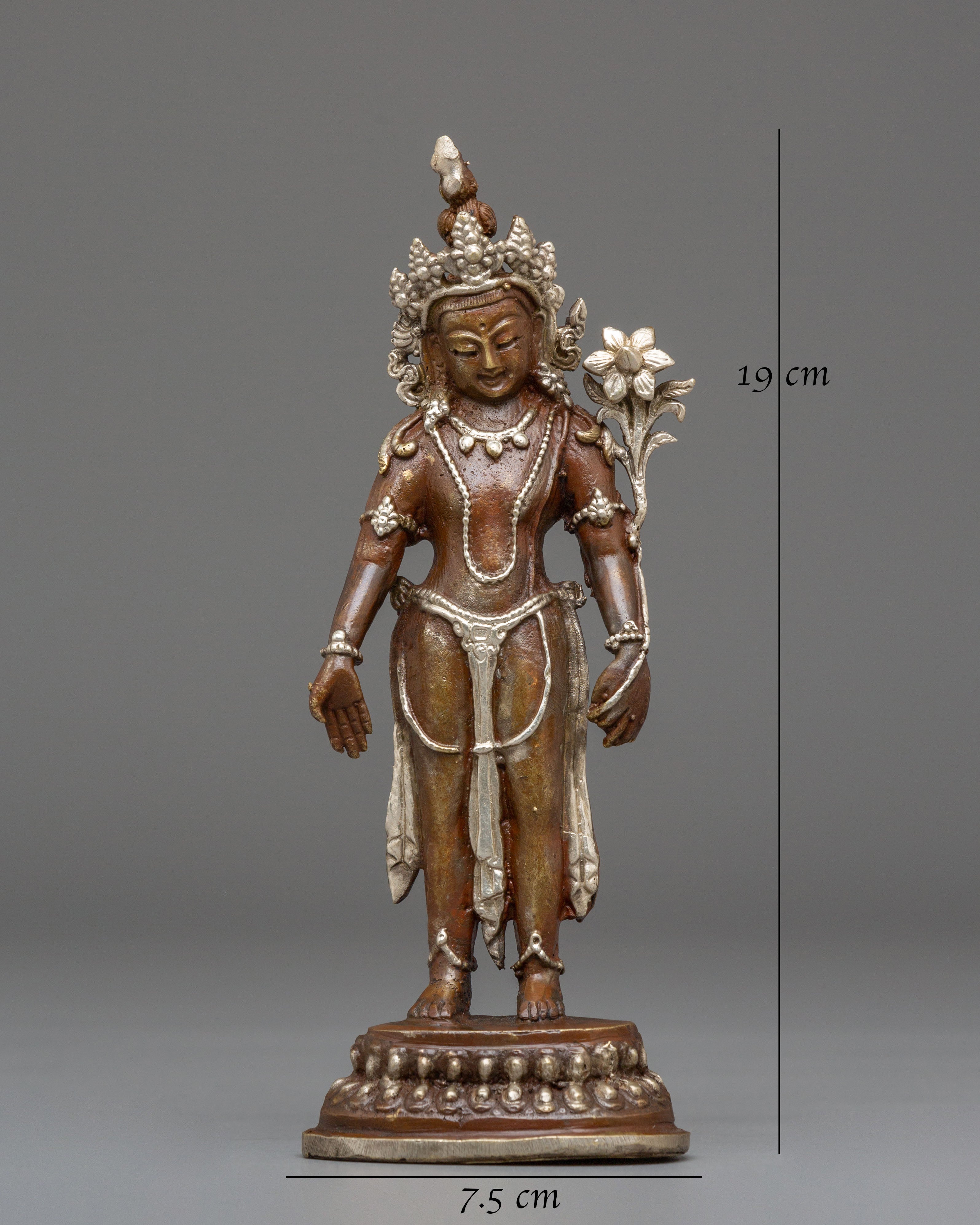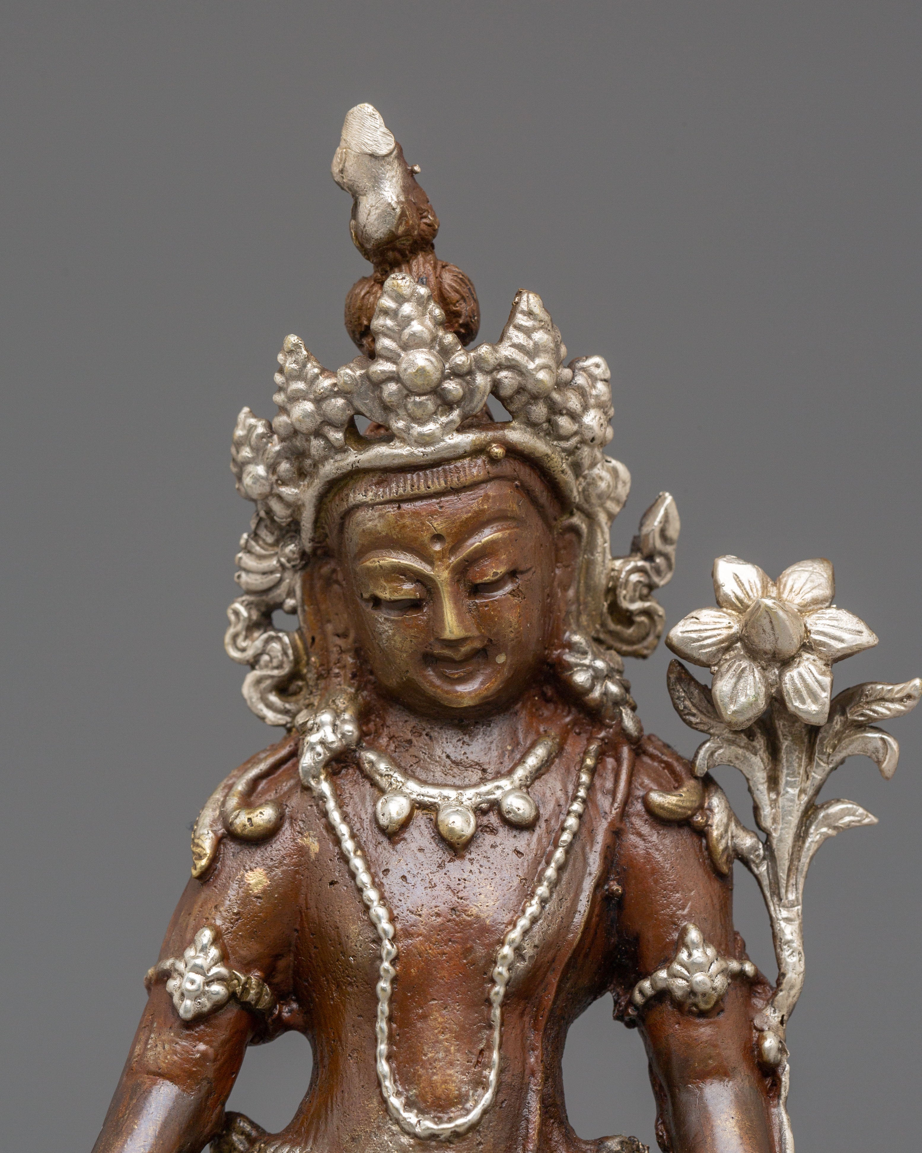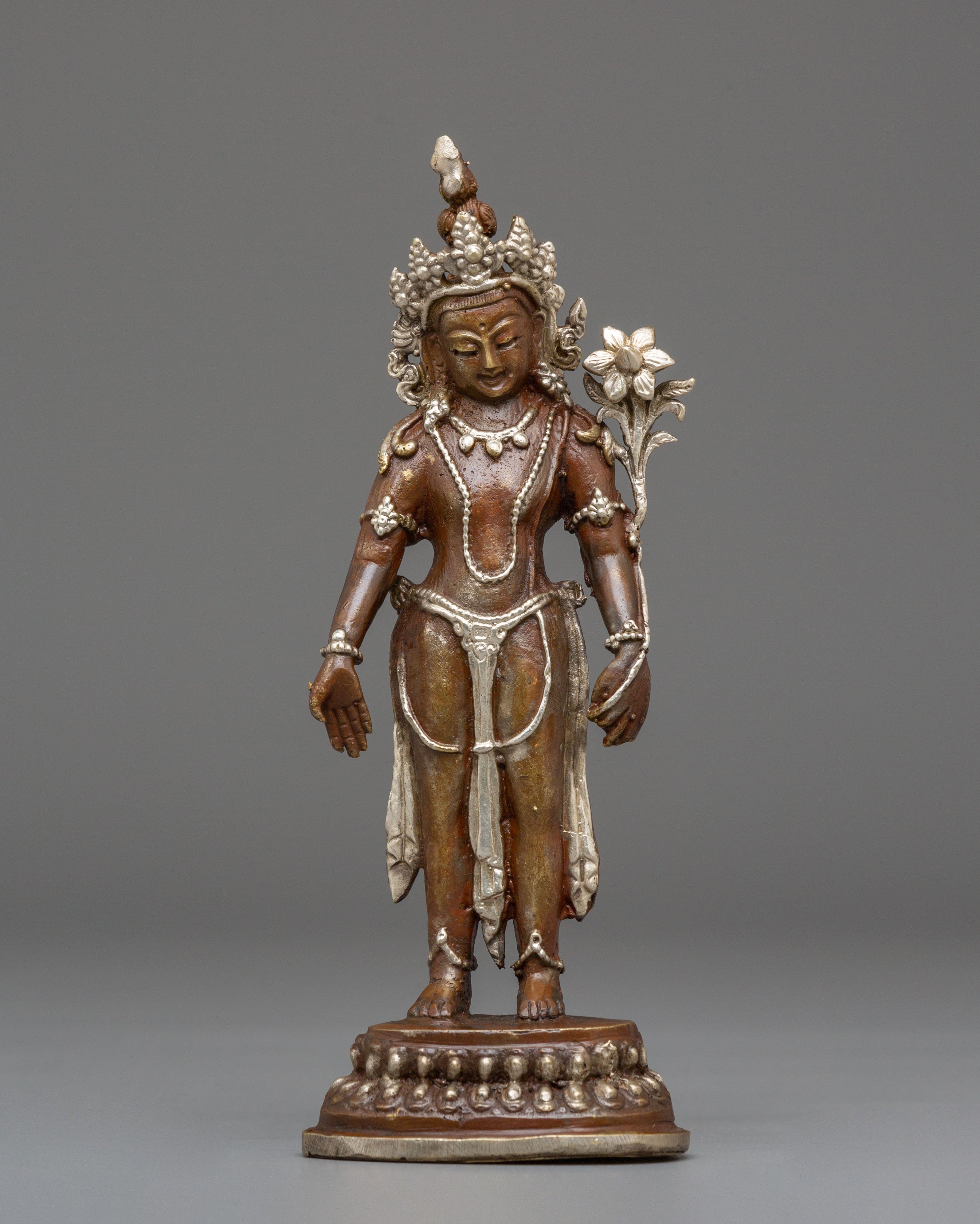 The oxidized copper body of the statue gives it a timeless, ancient look, while the silver plating provides a modern touch of refinement. Lokeshwor's gentle and peaceful demeanor is captured with exquisite artistry, evoking a sense of tranquility and spiritual protection. This statue invites positive energy and compassion into your home, enhancing your meditation or prayer space with its divine presence. Display it on your altar or in your living room to invite blessings of peace, wisdom, and protection from this compassionate deity.