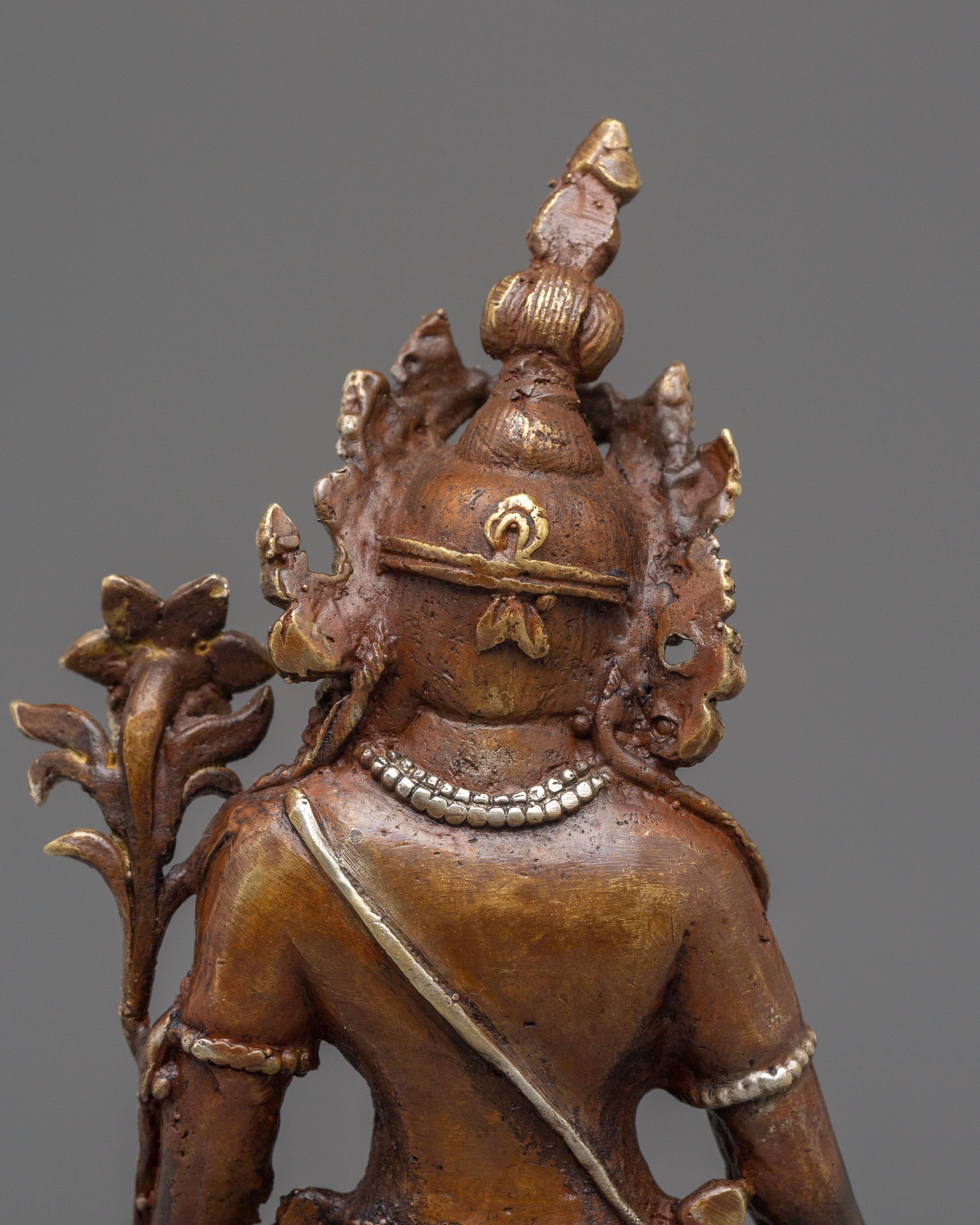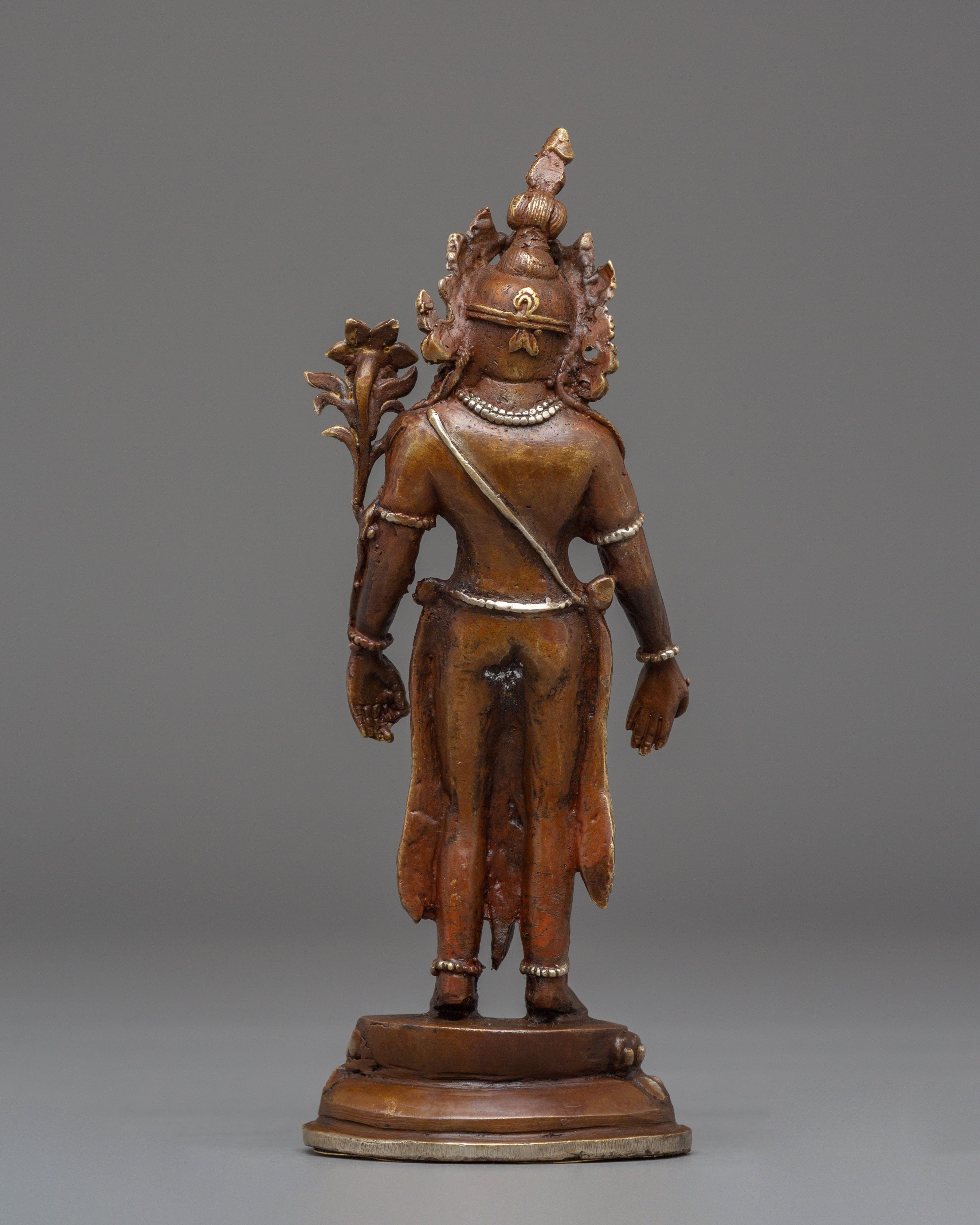 This Handcrafted Lokeshwor Copper Statue is a stunning representation of Lokeshwor, the Buddhist deity symbolizing compassion, protection, and wisdom. With a height of 19cm and a width of 7.5cm, this statue is meticulously crafted from oxidized copper and adorned with a silver-plated finish that highlights the divine elegance of this revered figure. Lokeshwor, often depicted with multiple arms and a serene expression, is a protector of all sentient beings, embodying the deep compassion and mercy of the Buddha. The intricate details and craftsmanship bring forth the power and grace of this deity, making this piece a perfect addition to your sacred space or altar.