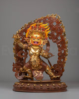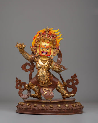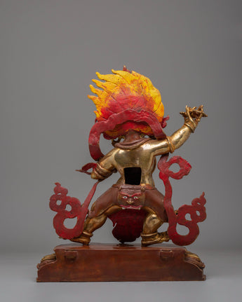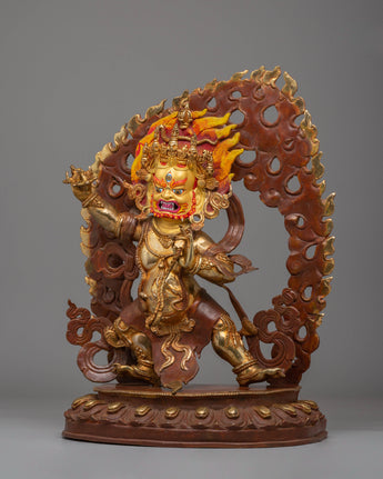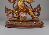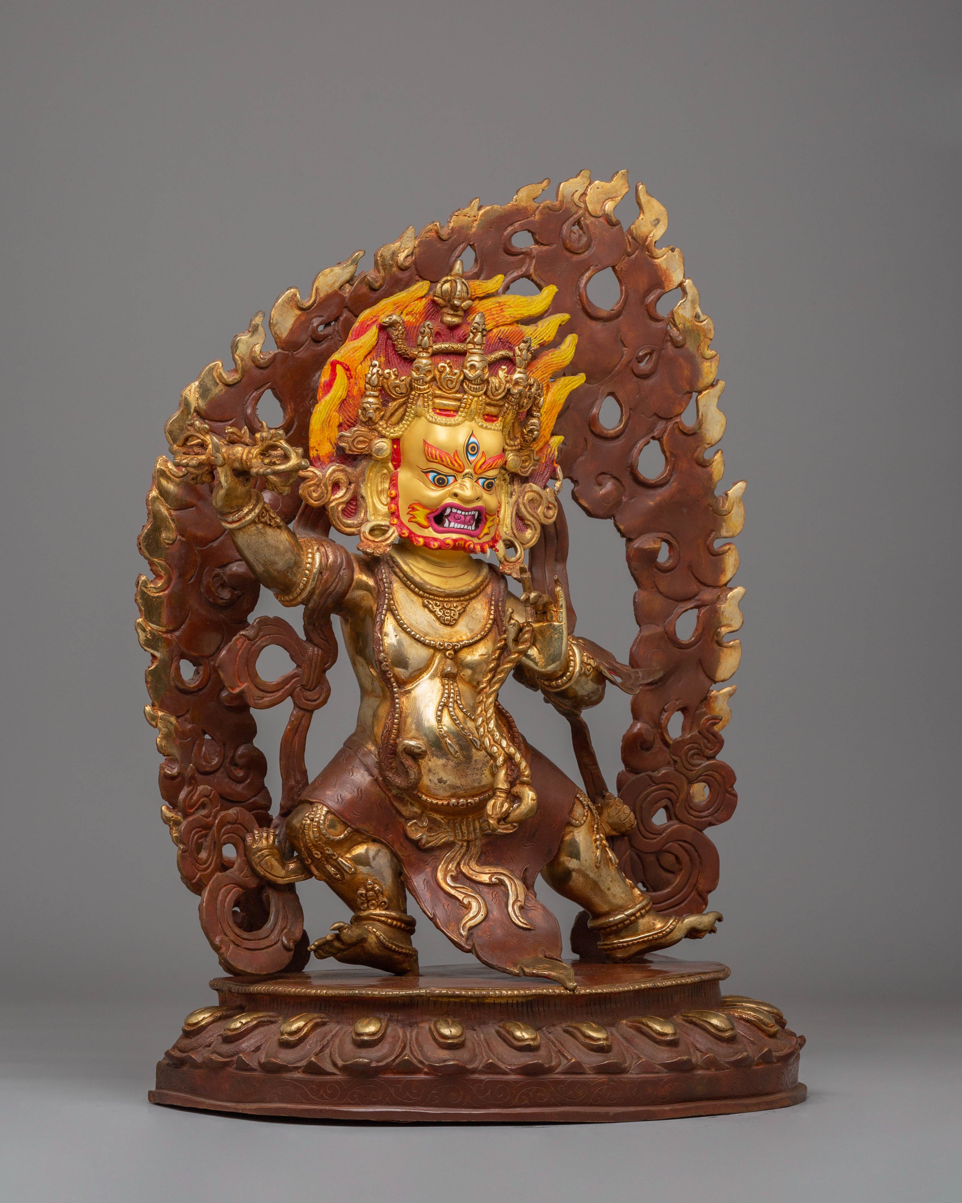 Vajrapani's dynamic posture, with one leg raised and the other firmly planted, conveys a sense of readiness to act and defend the Dharma. The statue's detailed features, from the flowing robes to the expressive facial markings, showcase the artisan's mastery in capturing the essence of this powerful deity. More than just a statue, this piece serves as a powerful symbol of protection, guidance, and spiritual empowerment, inviting practitioners to connect with Vajrapani's unwavering strength and compassionate energy.