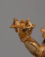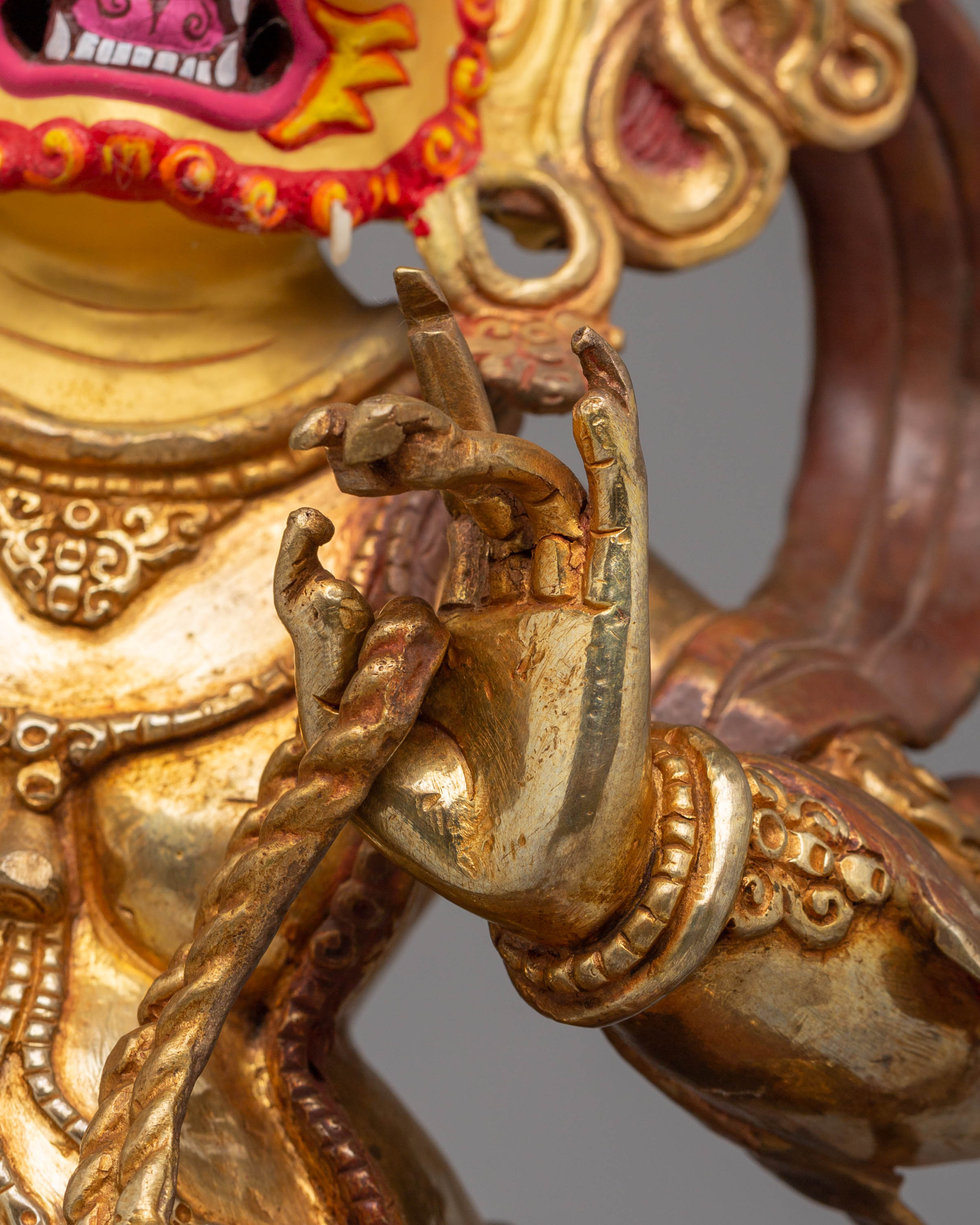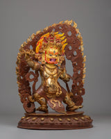 This Handcrafted Statue of Vajrapani embodies the strength and protection of Vajrapani, a prominent figure in Tibetan Buddhism known as the holder of the Thunderbolt. This statue, crafted from a copper body, exudes power and courage. It is adorned with 24k gold plating and acrylic color, enhancing its divine presence.
