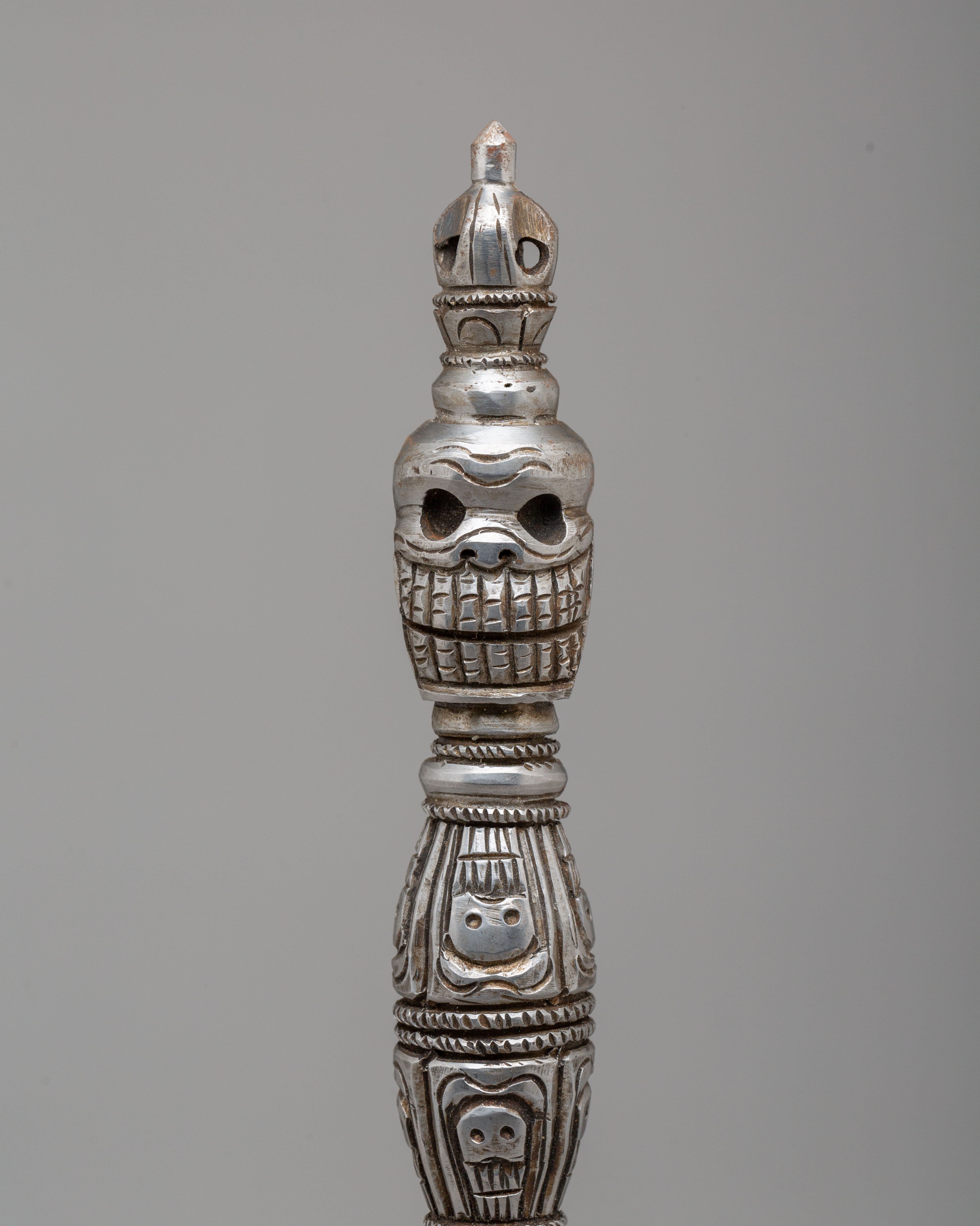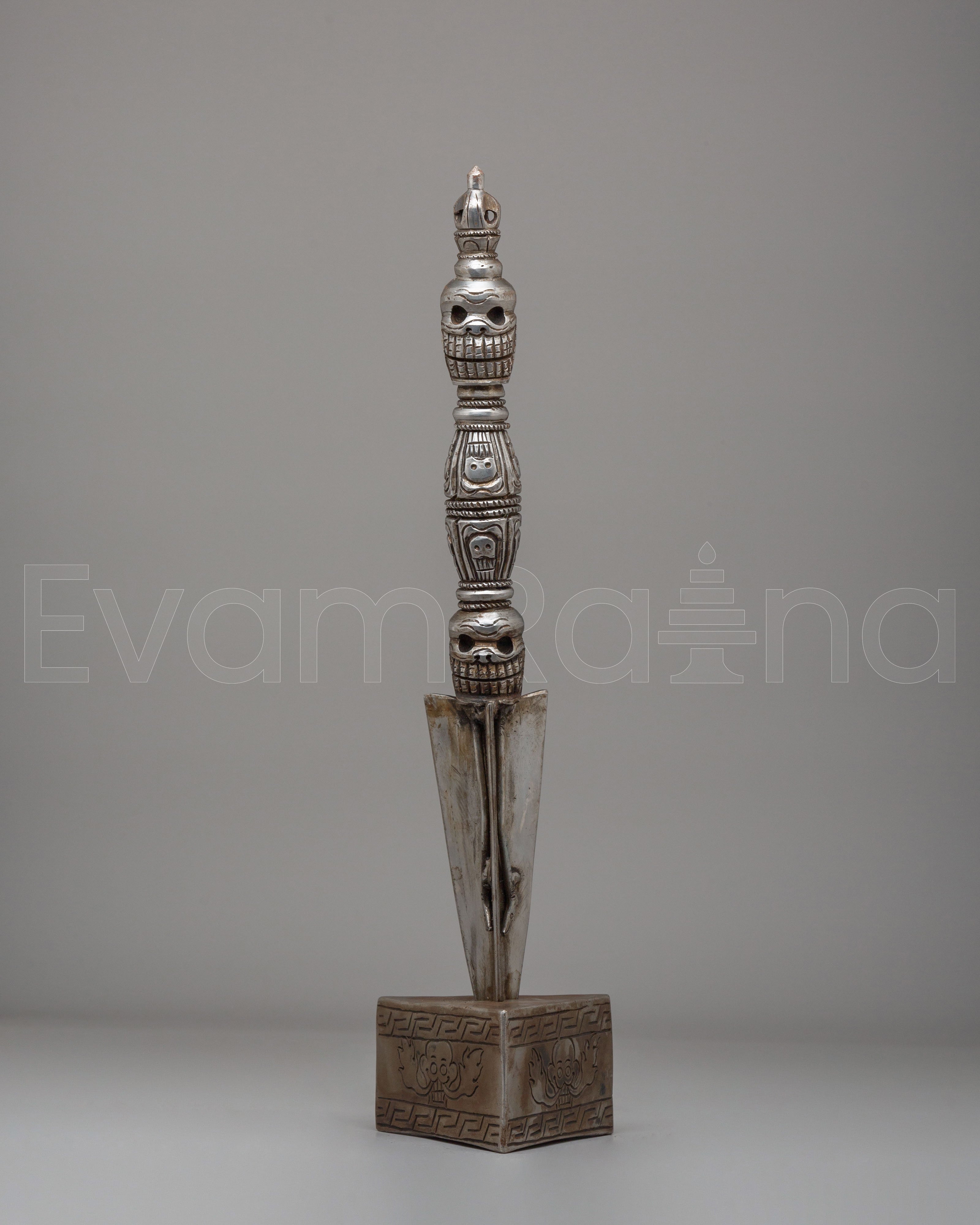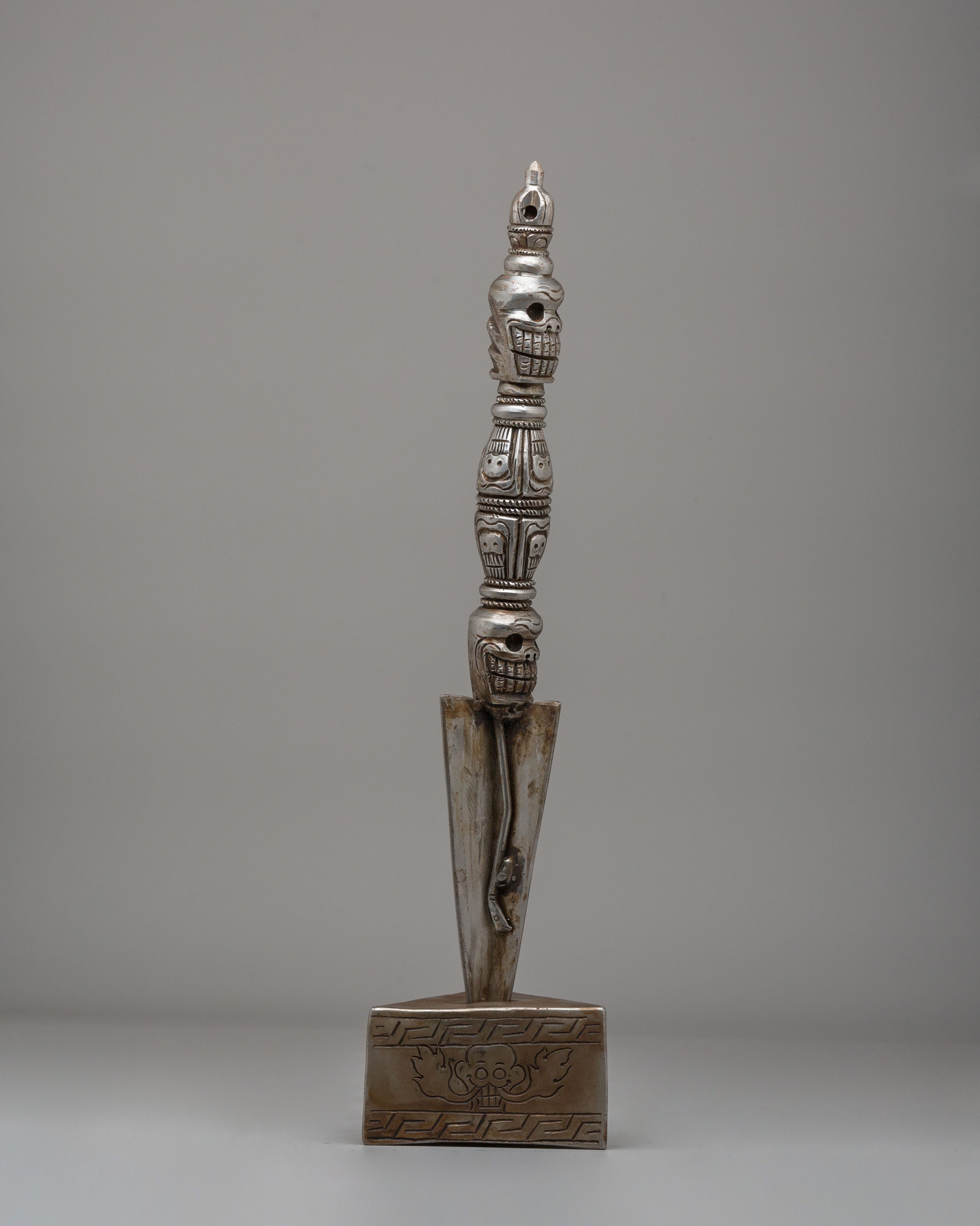 The Kila Ritual Dagger is traditionally used to remove obstacles, both physical and spiritual, and to symbolize the cutting away of ignorance and negative forces. Its triangular blade and unique design represent the three aspects of existence: creation, preservation, and destruction, embodying the balance of life. The Phurba is also associated with the empowerment of the practitioner's intentions and serves as a tool for invoking the protection of deities during meditation and rituals.
