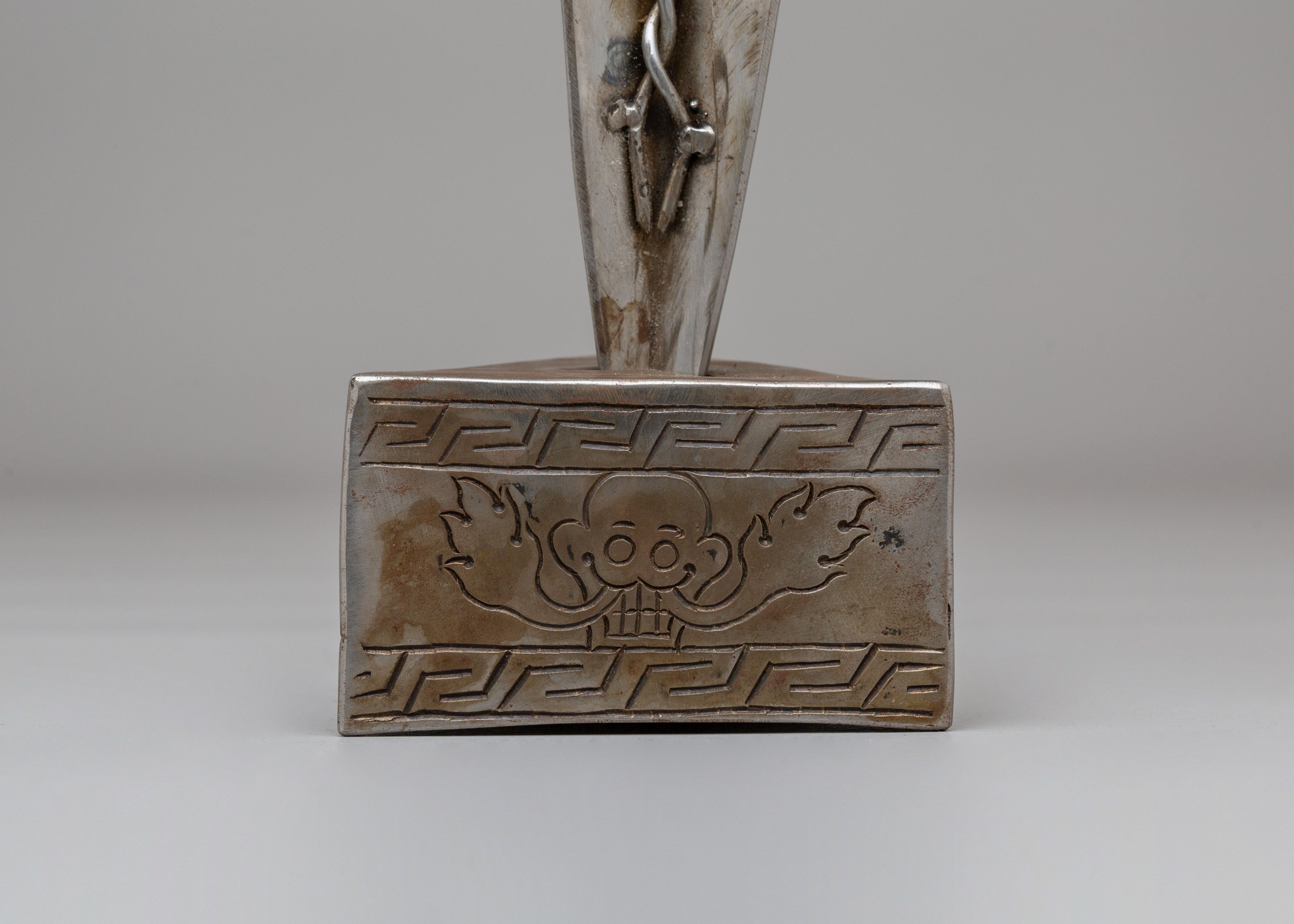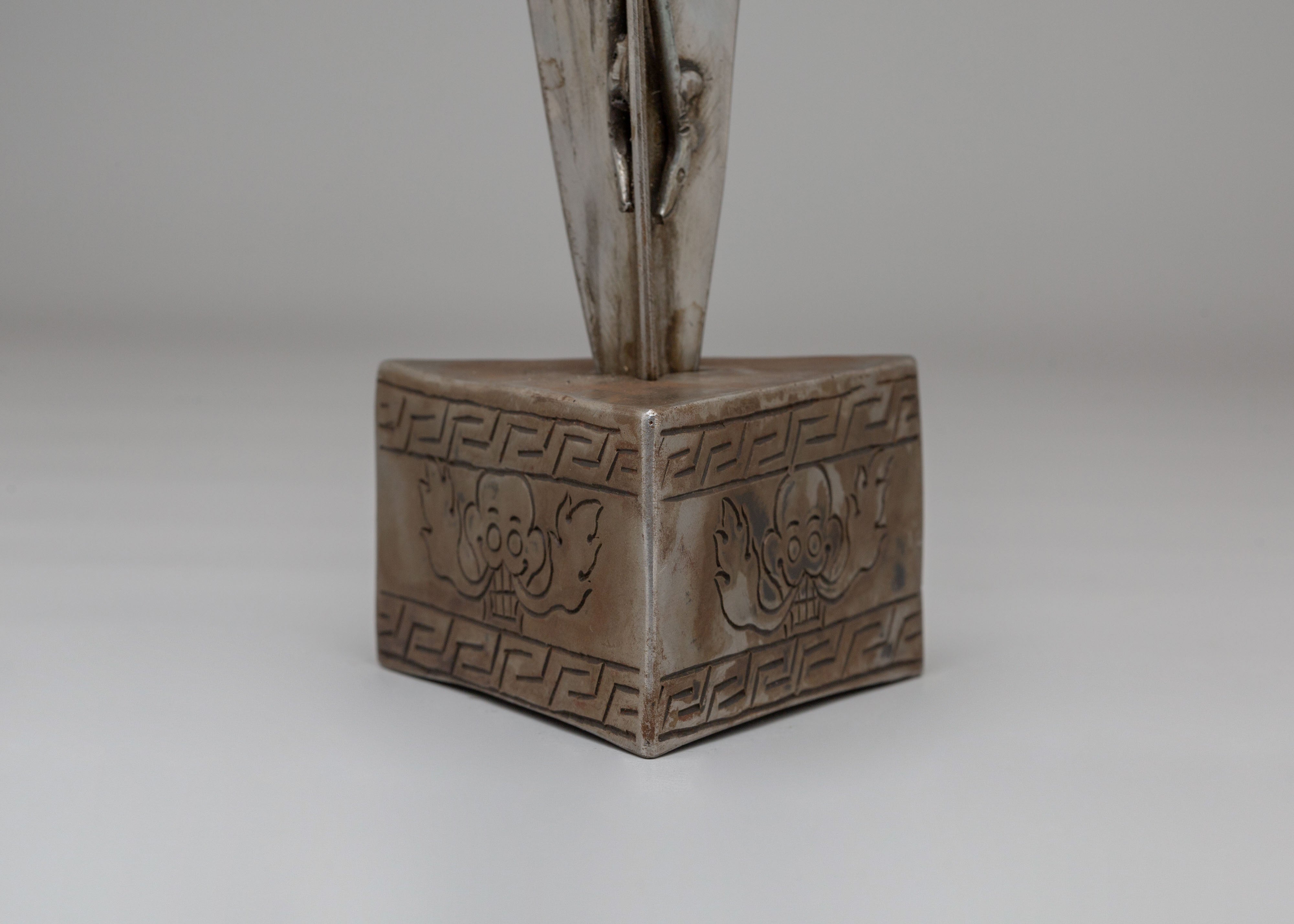 The Tibetan Kila Ritual Dagger measures 41.5cm in height and 10cm in width, with a weight of 1.29kg. Crafted from iron, this sacred tool, known as a Phurba, is deeply rooted in Tibetan Buddhist rituals. The dagger features intricate details designed to invoke divine protection, eliminate negative energies, and aid in spiritual practices. The iron material lends the phurba a strong, grounding presence, enhancing its connection to the Earth and its power to protect during rituals.