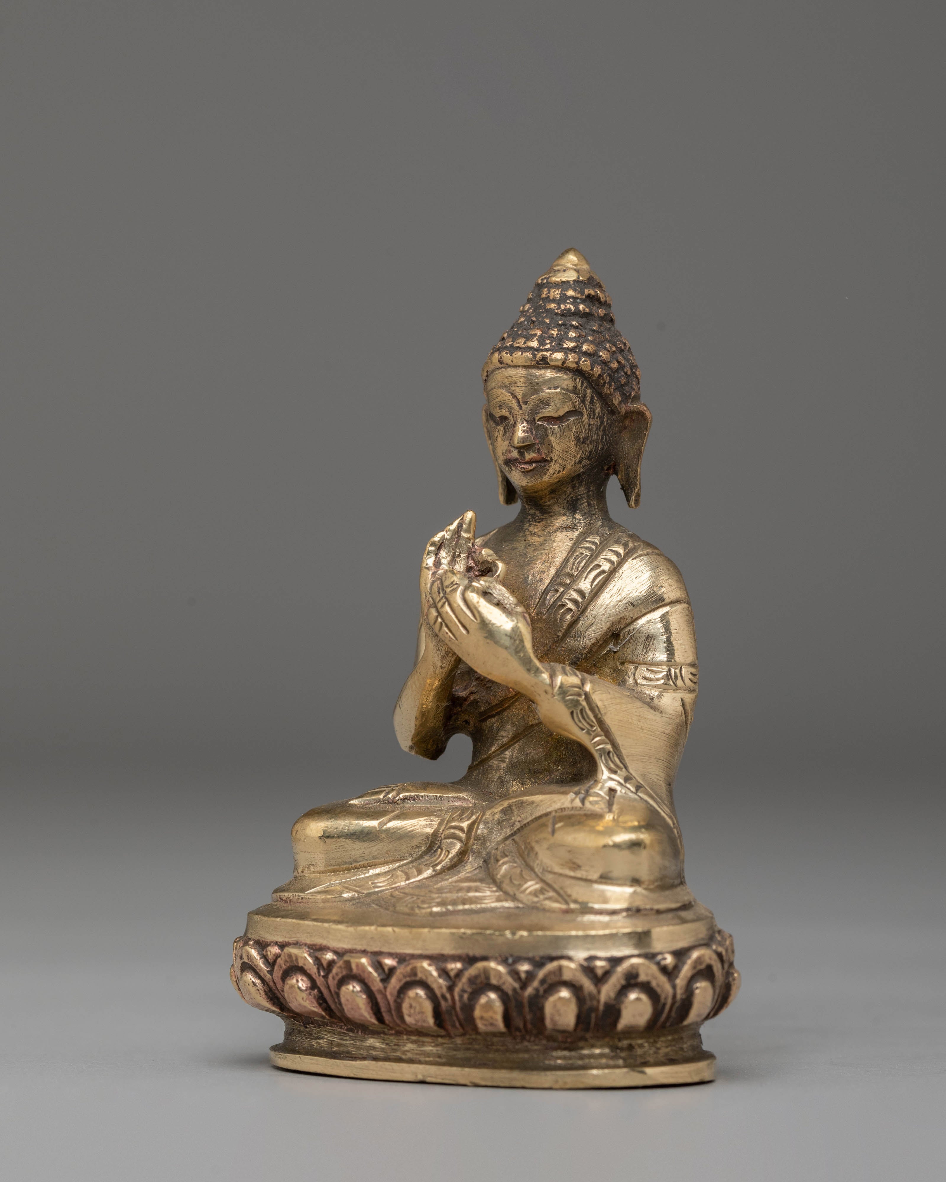 This Handmade Vairocana Statue is a magnificent representation of Vairocana, the Buddha of universal light, who embodies the essence of enlightenment and the wisdom that dispels ignorance. The statue is carefully crafted from copper, a material known for its reflective qualities, symbolizing the illumination of wisdom and spiritual awakening. At 8cm in height and 5.5cm in width, it is an ideal size for personal altars or meditation spaces, serving as a reminder of the Buddha's teachings on the path to inner peace. The serene face and intricate details of the statue highlight Vairocana’s all-encompassing presence, inspiring devotees to seek enlightenment.