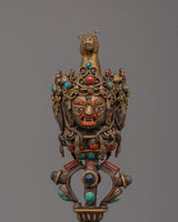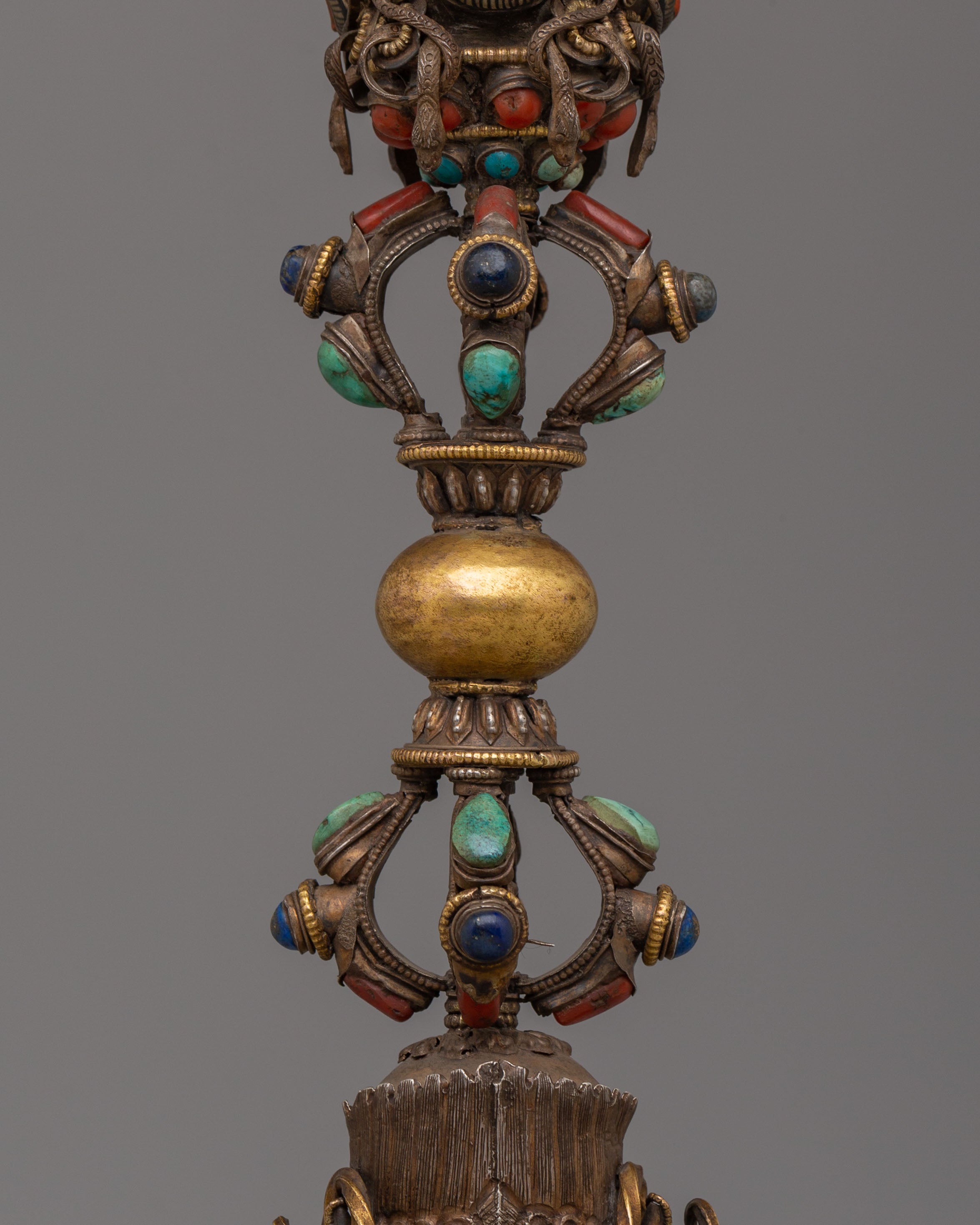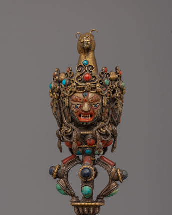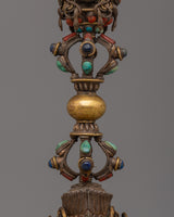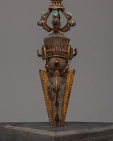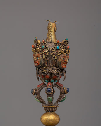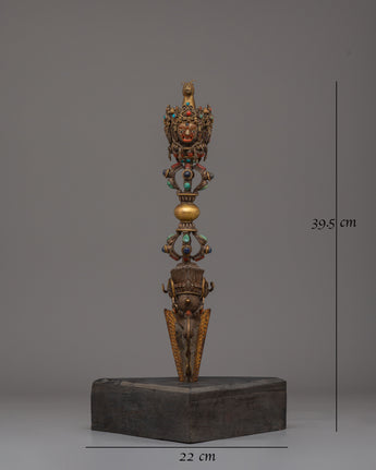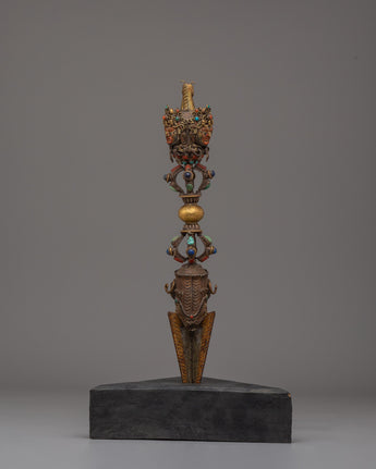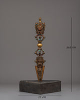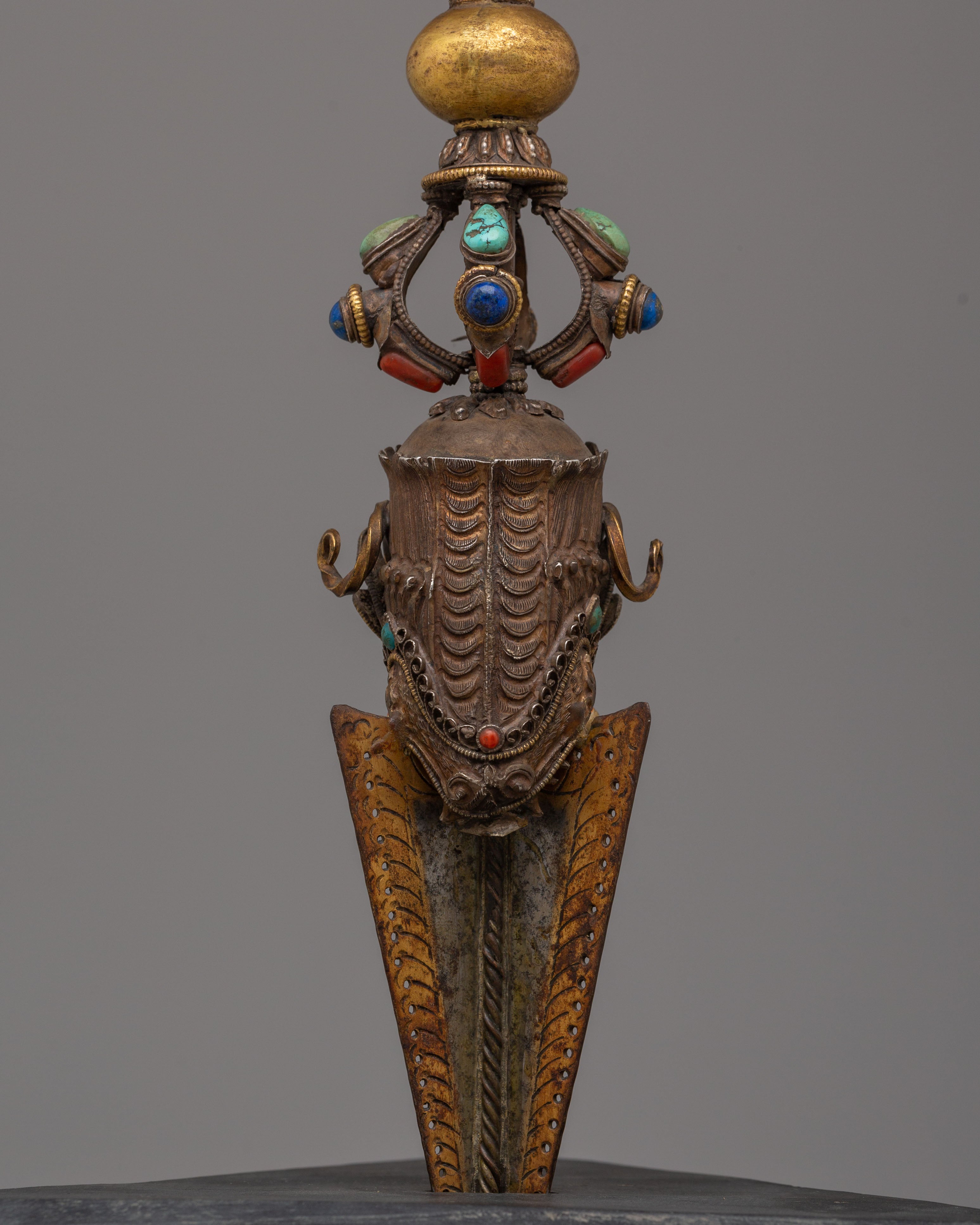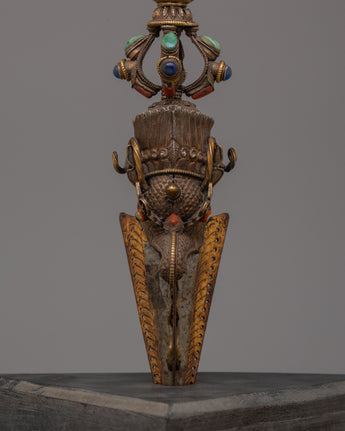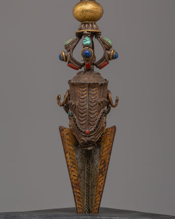 The Handmade Phurba with Vajra, adorned with gemstones, enhances the spiritual energy of any ritual. With Hayagriva as the central deity, the Phurba embodies the protection, wisdom, and compassion necessary for spiritual practice and meditation. The copper and silver materials, along with the vibrant gemstones, complete the craftsmanship, offering both a functional ritual object and a beautiful spiritual art piece. This Phurba is perfect for use on an altar, in Buddhist rituals, or as a sacred gift, serving as a reminder of spiritual strength, peace, and the destruction of negativity.