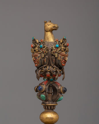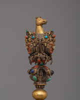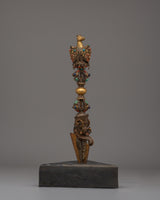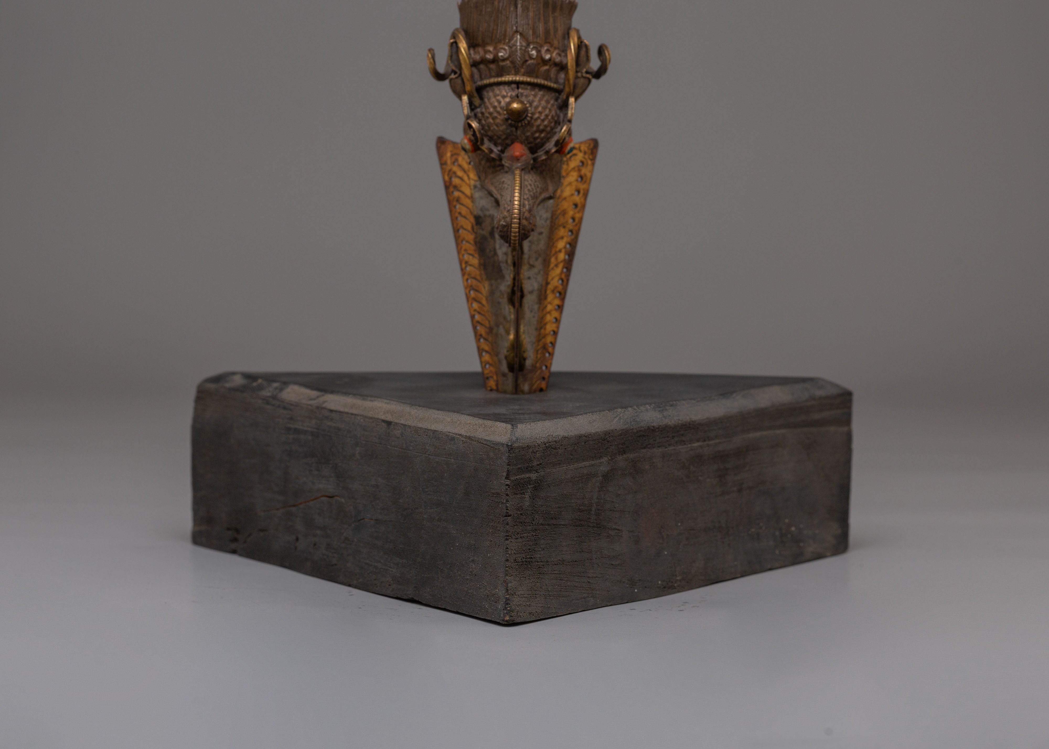 The Vajra at the top of the Handmade Phurba with Vajra is not only a symbol of divine power but also represents the symbol of enlightenment in Buddhism. Often referred to as the thunderbolt or diamond weapon, it signifies the unshakable nature of Buddha's teachings. The Phurba itself is associated with the deity Hayagriva, a powerful tantric deity known as the Horse-headed Wisdom Lord. Hayagriva is revered for his ability to destroy obstacles and purify spiritual blockages, making this Phurba with Vajra an essential tool for spiritual purification and empowerment.