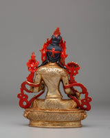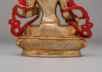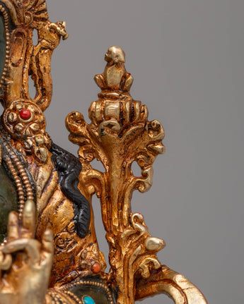 The Green Tara Statue is a representation of the Tibetan goddess of compassion and protection, designed to bring peace and blessings into your life. Standing at 21.5 cm in height and weighing 1.29 kg, this exquisite statue is crafted from a unique blend of Murgus, gold plating, gemstones, and acrylic color, resulting in a work of spiritual art. Green Tara is renowned for her ability to bring swift protection, remove obstacles, and provide spiritual relief to those in need. Her compassionate nature and powerful energy are perfectly captured in this statue.