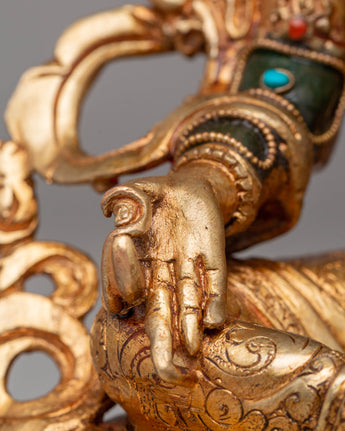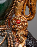 Green Tara's iconography is rich with symbolism, each gesture and element representing her attributes of compassion, protection, and swift action. Her right hand is positioned in varadha mudra, the gesture of offering, which signifies her willingness to grant blessings, assistance, and compassion to all beings. Her left hand is held in the three-jeweled mudra, symbolizing the Three Jewels of Buddhism: the Buddha, the Dharma (teachings), and the Sangha (community), representing her role as a protector and guide on the path to enlightenment. The right leg extended forward indicates her readiness to act swiftly, a key attribute of Green Tara, who is often called upon for her swift intervention and help in times of need. Her crown represents her enlightened state, symbolizing her wisdom and spiritual sovereignty. The right leg holding a utpala flower signifies her purity and the blossoming of spiritual potential. Finally, the lotus base upon which Green Tara stands symbolizes her emergence from the depths of samsara (the cycle of birth, death, and rebirth), embodying her purity, spiritual awakening, and the potential for all beings to attain enlightenment. Each element in her iconography reinforces Green Tara’s role as a powerful force of compassion and protection.