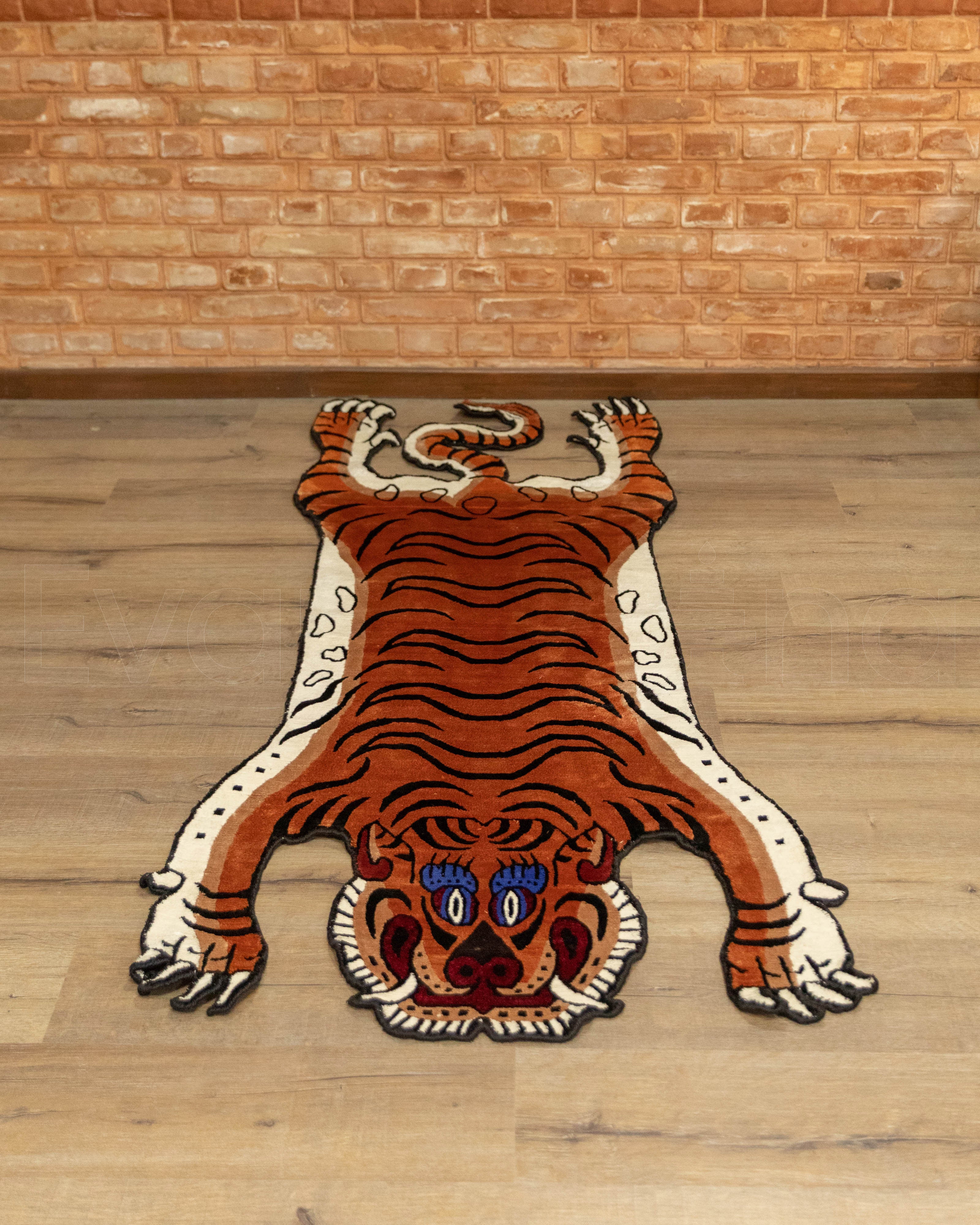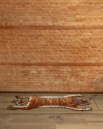 The Handwoven Boho Style Tiger Rug is a stunning and unique addition to any living space, blending bold style with cultural artistry. Crafted with care, this rug is made from 100% Tibetan and New Zealand wool, combined with viscose to add a luxurious sheen. Measuring 192 cm in length and 91 cm in width, this striking tiger design rug brings vibrant color and texture into your home. The handwoven technique ensures that each rug is one-of-a-kind, showcasing intricate craftsmanship and attention to detail. The powerful tiger motif, with its sharp lines and fierce presence, symbolizes unconditional confidence, disciplined awareness, kindness, and modesty. The tiger is also associated with dominance over the forest and the air element, making this rug a symbol of strength and spiritual protection.