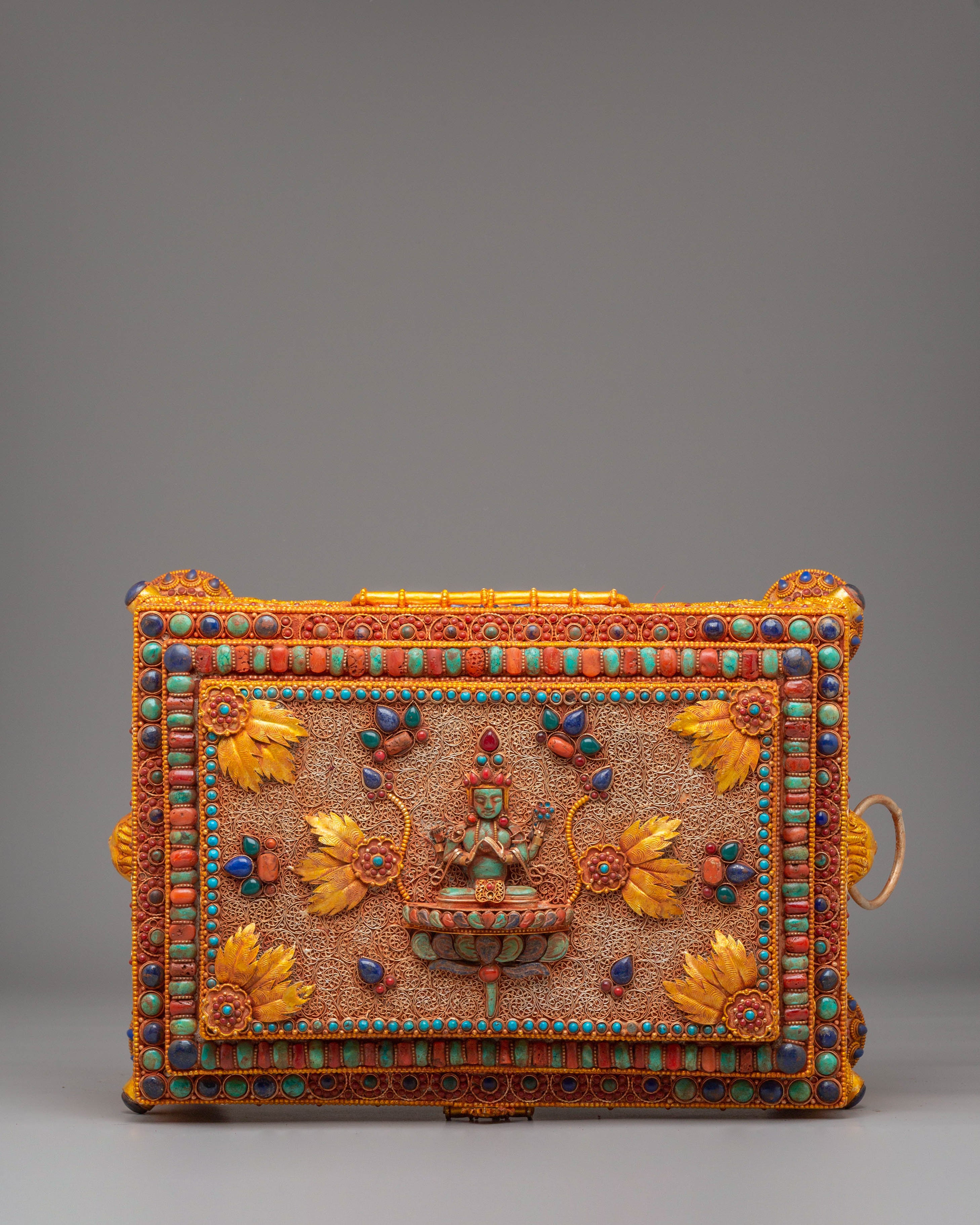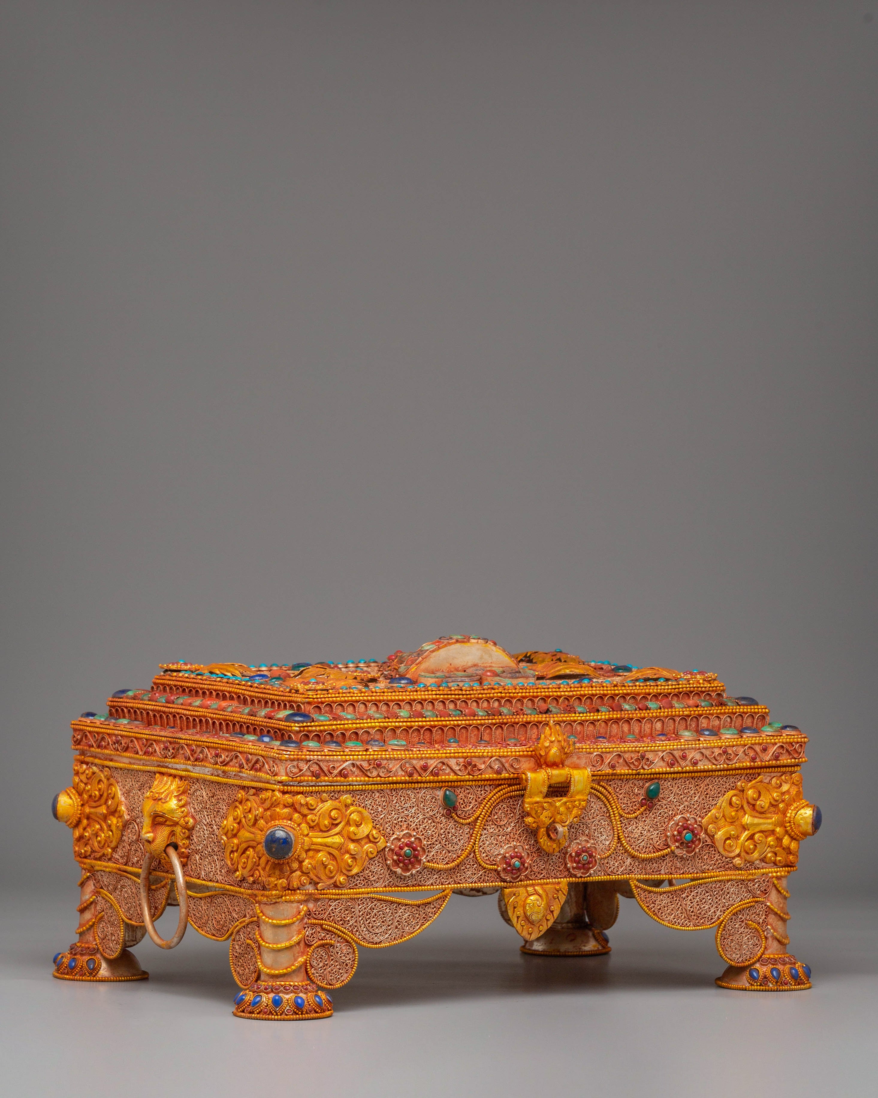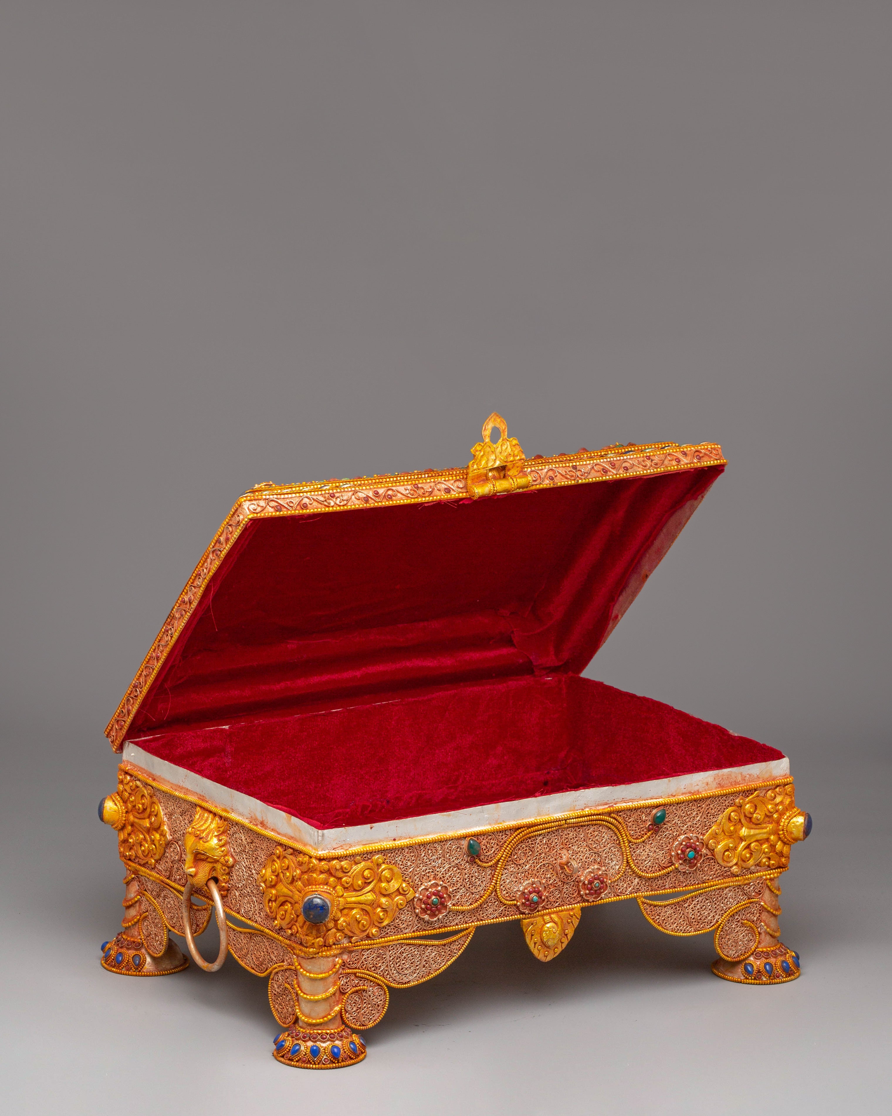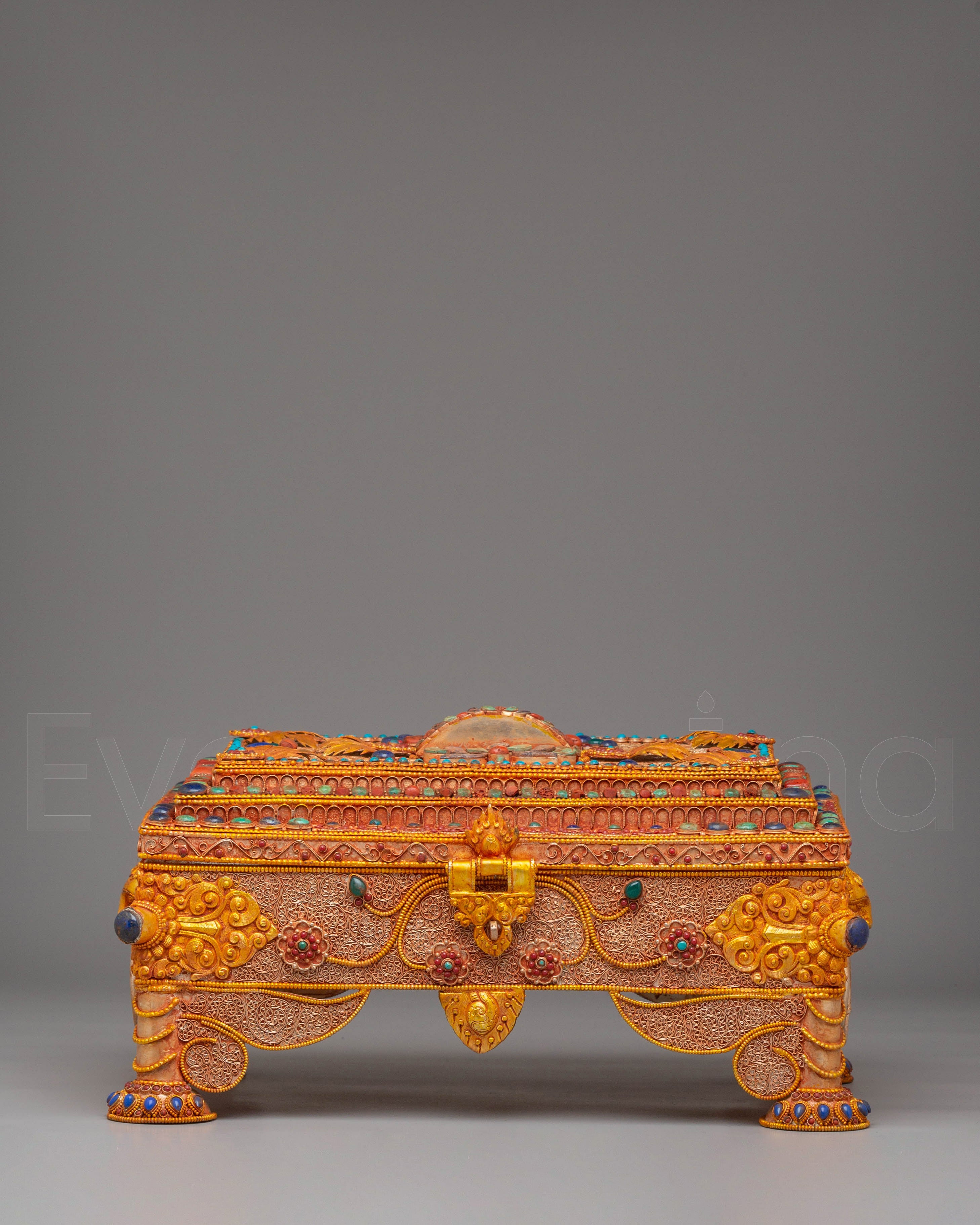Handcrafted with attention to detail, the box’s sturdy copper body is enhanced by an electro-gold-plated finish, giving it a rich, luxurious appearance. The silver elements and colored stones are delicately applied, ensuring that each box is a unique work of art. Weighing 4.31kg, this piece combines beauty and functionality, making it a perfect addition to your home or temple as a symbol of spiritual wealth and protection.