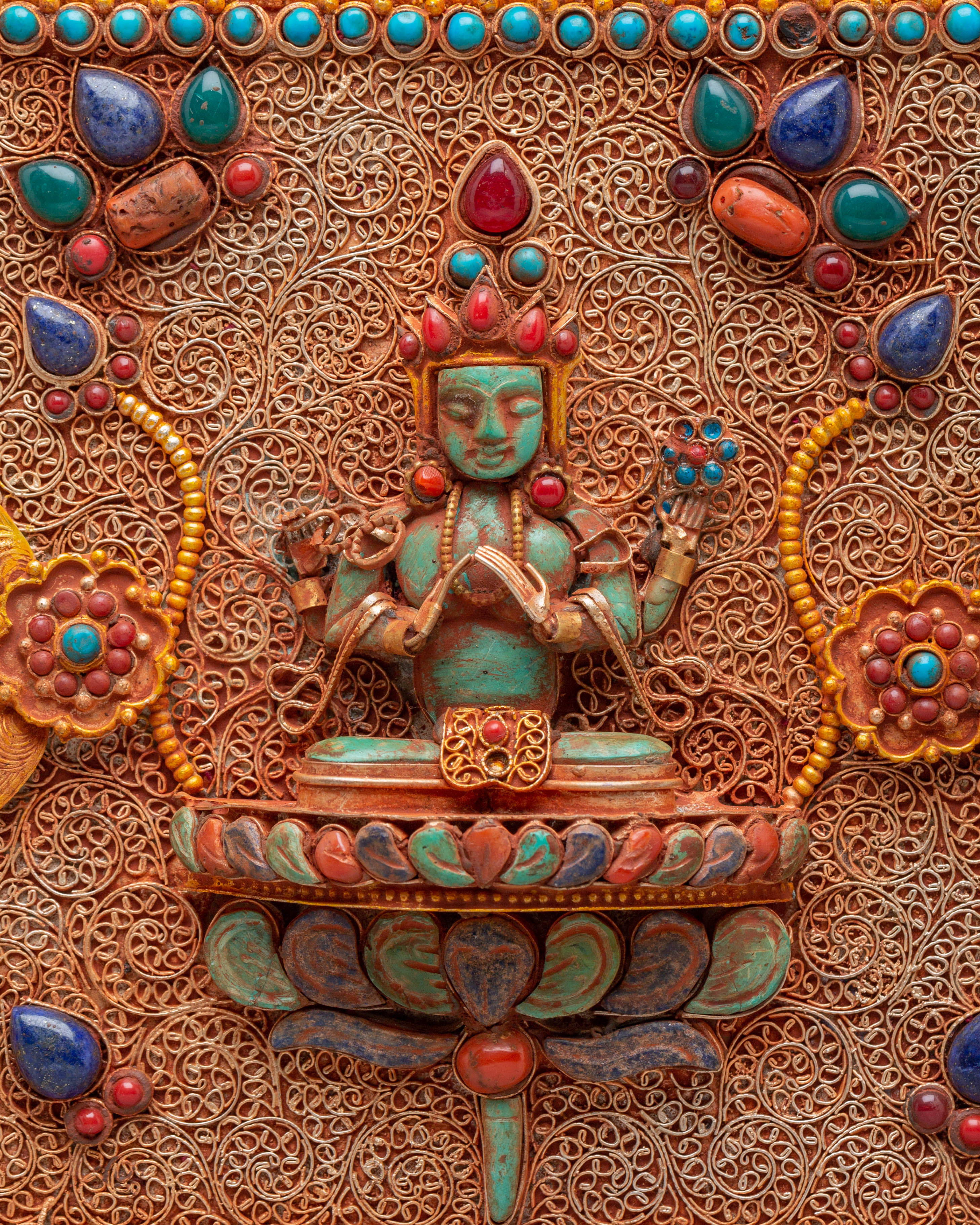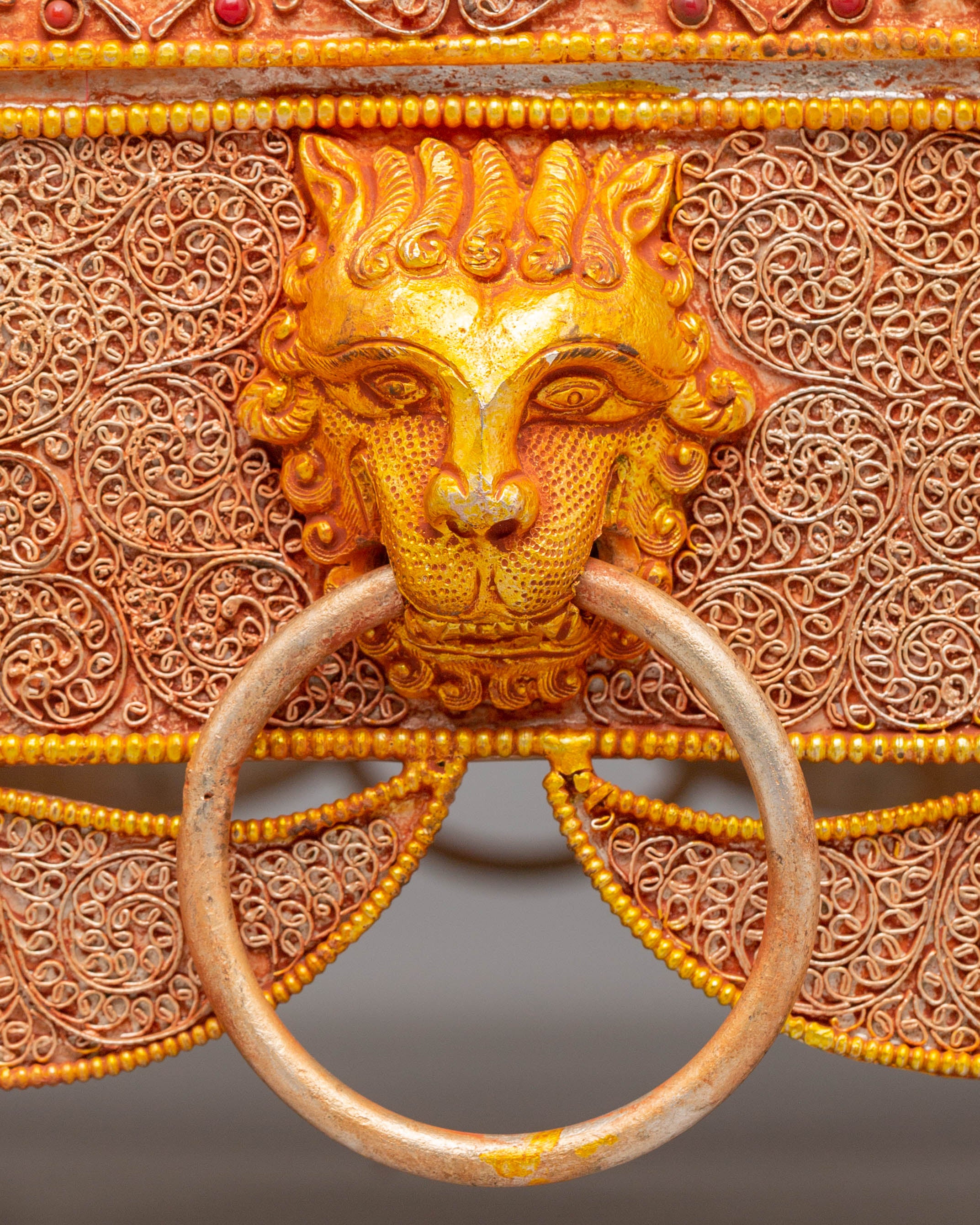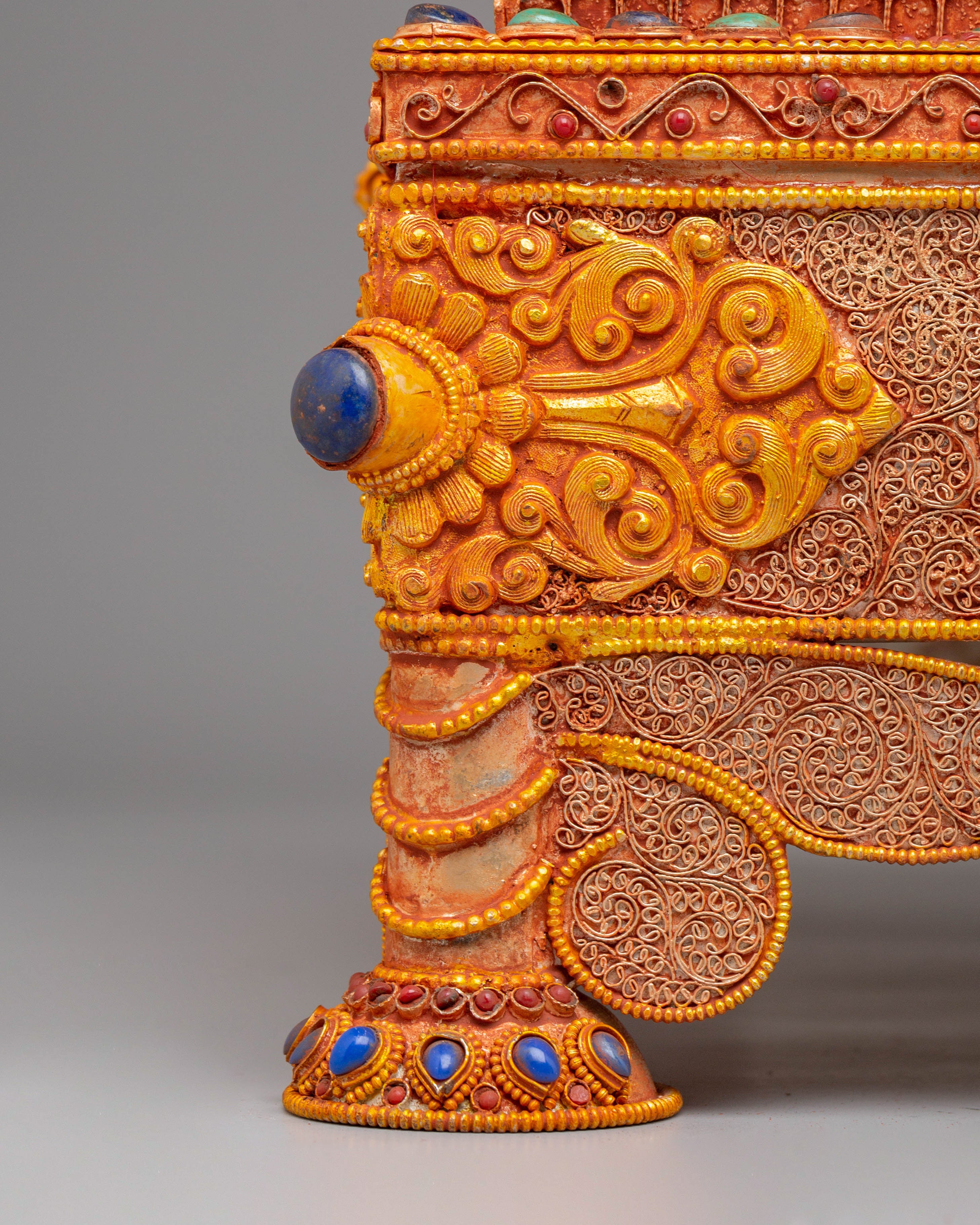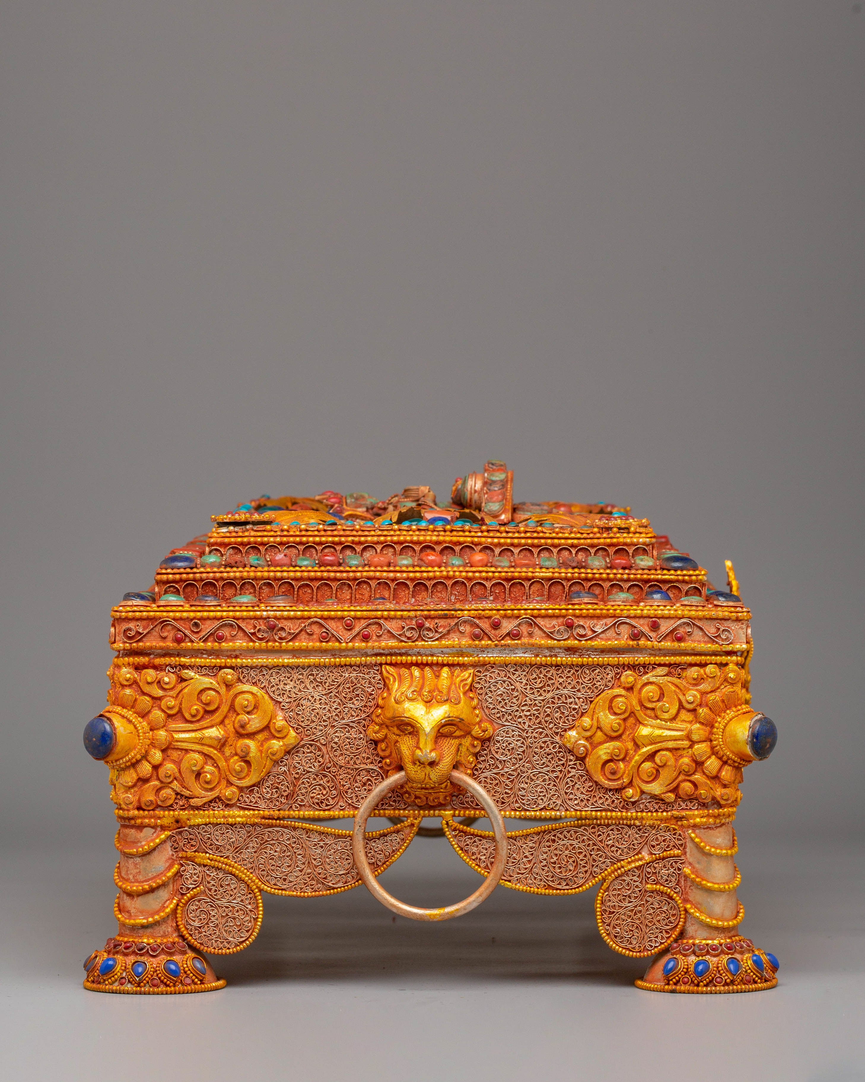Handcrafted with attention to detail, the box’s sturdy copper body is enhanced by an electro-gold-plated finish, giving it a rich, luxurious appearance. The silver elements and colored stones are delicately applied, ensuring that each box is a unique work of art. Weighing 4.31kg, this piece combines beauty and functionality, making it a perfect addition to your home or temple as a symbol of spiritual wealth and protection.