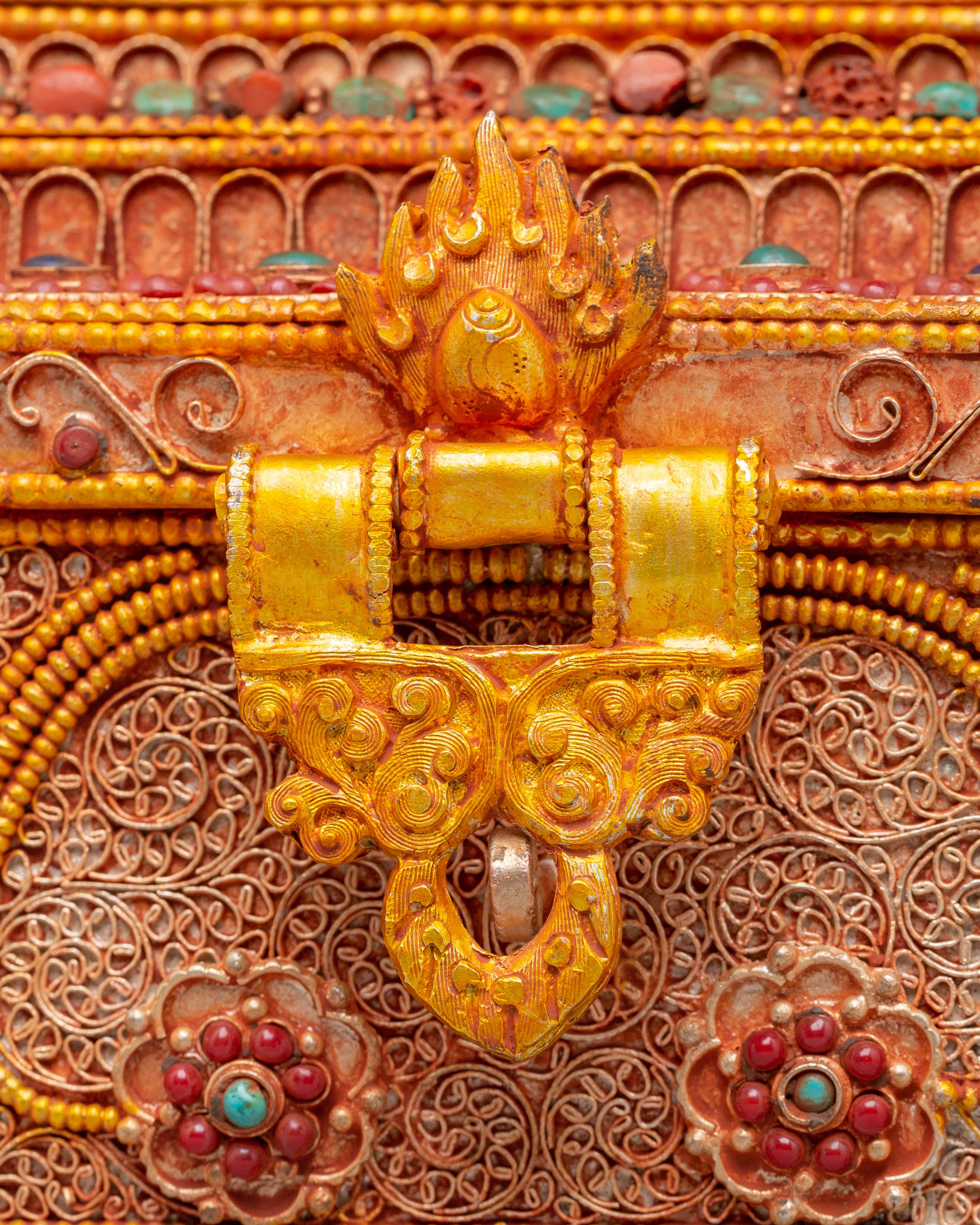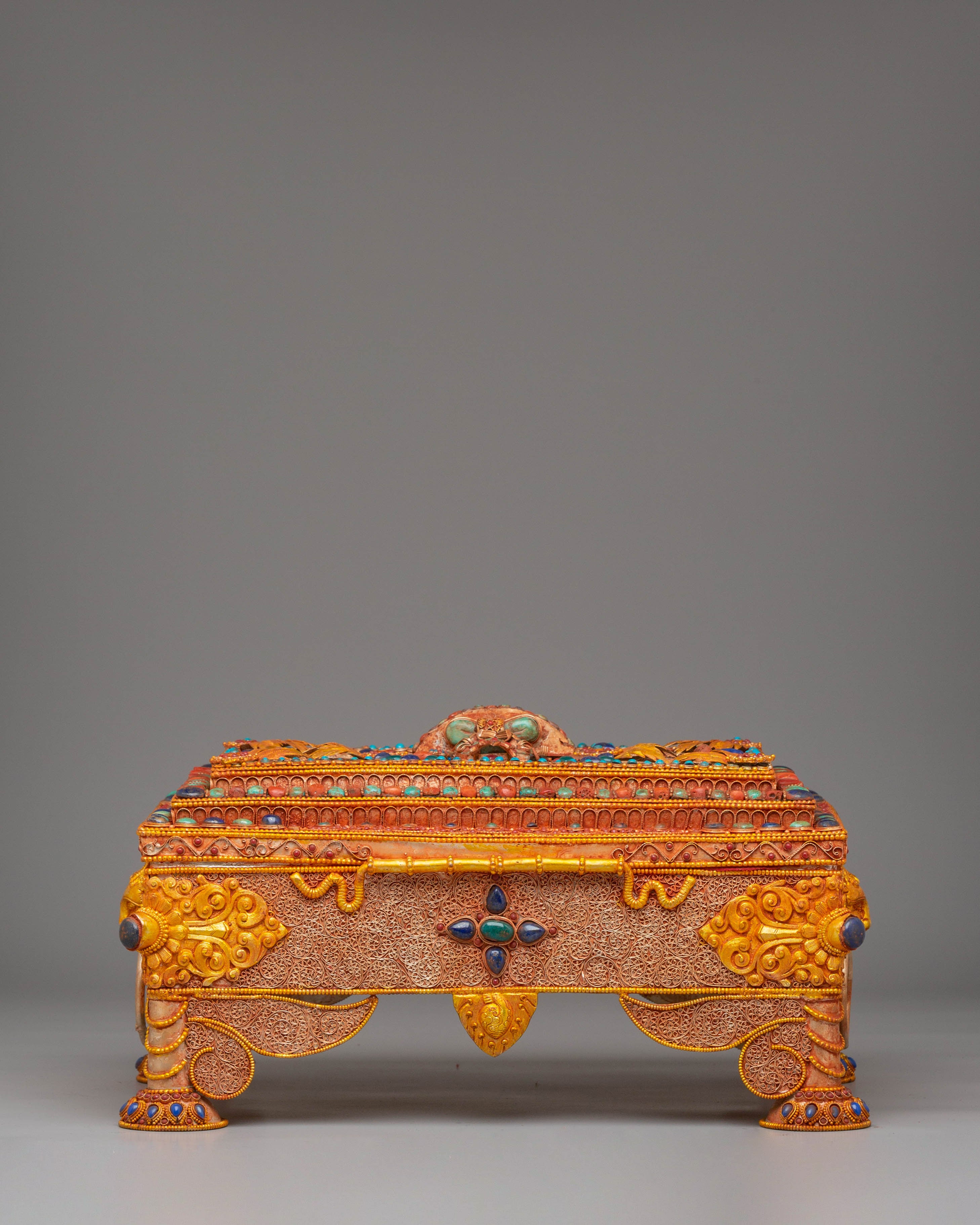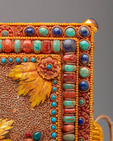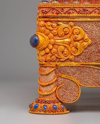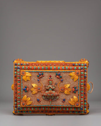 This treasure box features an elegant and detailed motif inspired by Tibetan Buddhist symbolism. The ornate carvings and decorative elements surrounding the box represent prosperity, protection, and harmony. The use of turquoise and coral, two highly regarded stones in Tibetan Buddhism, adds a layer of meaning, symbolizing peace and balance. Whether used for storing small valuables or as a spiritual focal point, this box serves as a reminder of your journey toward enlightenment and inner peace.