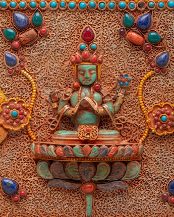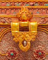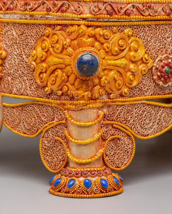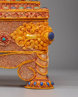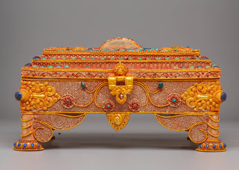 The Himalayan Buddhist Treasure Box is a stunning example of traditional Tibetan craftsmanship, designed to enhance your spiritual space. Made with a rich copper body and electro gold plating, this treasure box is adorned with silver detailing and vibrant artificial stones, including turquoise and coral. These stones are carefully placed to symbolize protection and vitality, making this piece both visually striking and spiritually significant. The box’s intricate design, standing at 19cm tall, reflects the craftsmanship and artistry of the Himalayas, a beautiful addition to any collection.