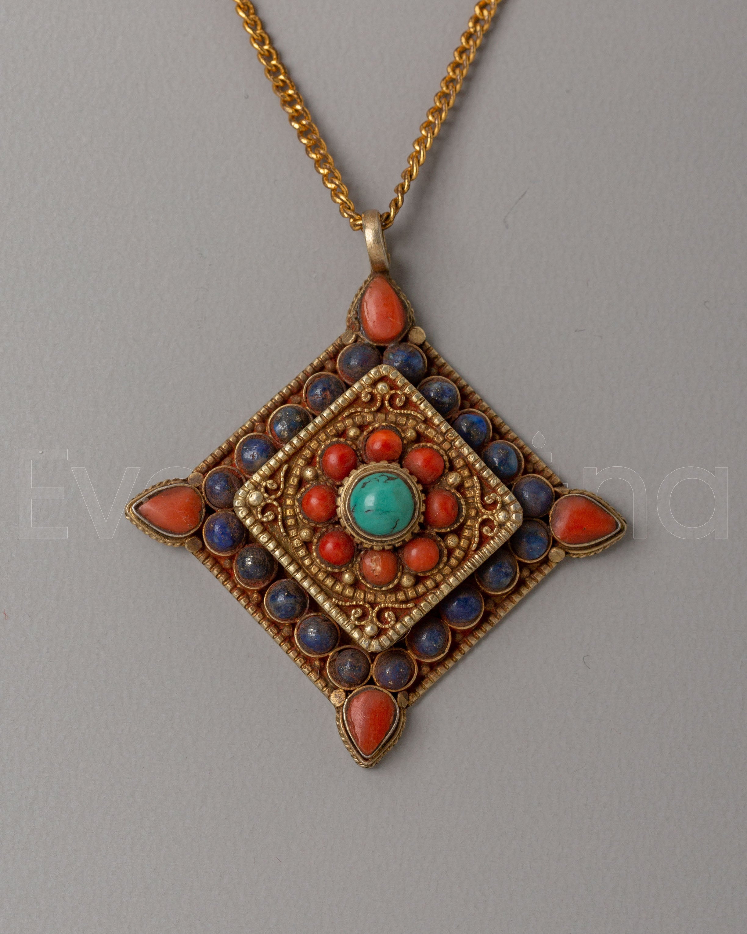 This Handcrafted Himalayan Locket features a central motif of a turquoise stone, surrounded by vibrant coral-colored stones, which symbolize balance, protection, and spiritual healing. The geometric arrangement represents harmony and the interconnectedness of all elements. The copper base and gold plating reflect sacred energy and divine protection, while the intricate design is rooted in traditional Himalayan artistry, embodying spiritual symbolism that enhances meditation and connection to higher energies. The overall pattern is both a decorative and symbolic representation of unity, strength, and peace.