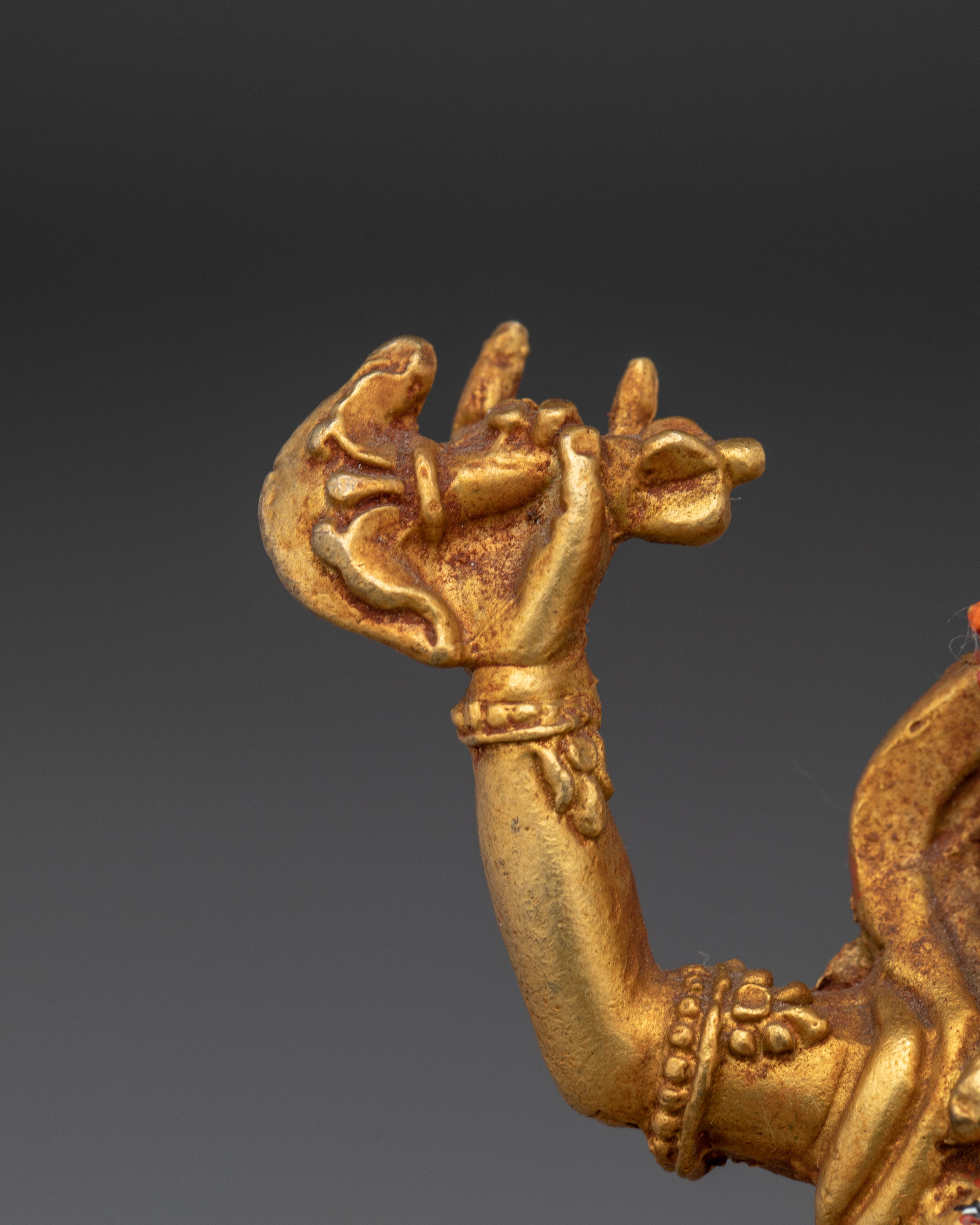 The Sacred Dorje Phagmo Statue is a powerful and intricate representation of the Tibetan Buddhist protector deity, Dorje Phagmo. Standing at 18cm tall and weighing 0.42kg, this handcrafted statue features a copper body with gold plating and vivid acrylic colors. Dorje Phagmo, often depicted in a fierce and dynamic pose, is a goddess of wisdom and protection who embodies the ability to overcome obstacles and destroy ignorance. The statue’s design captures her in a commanding stance, holding a vajra and sword, representing her power to protect practitioners from negative influences.