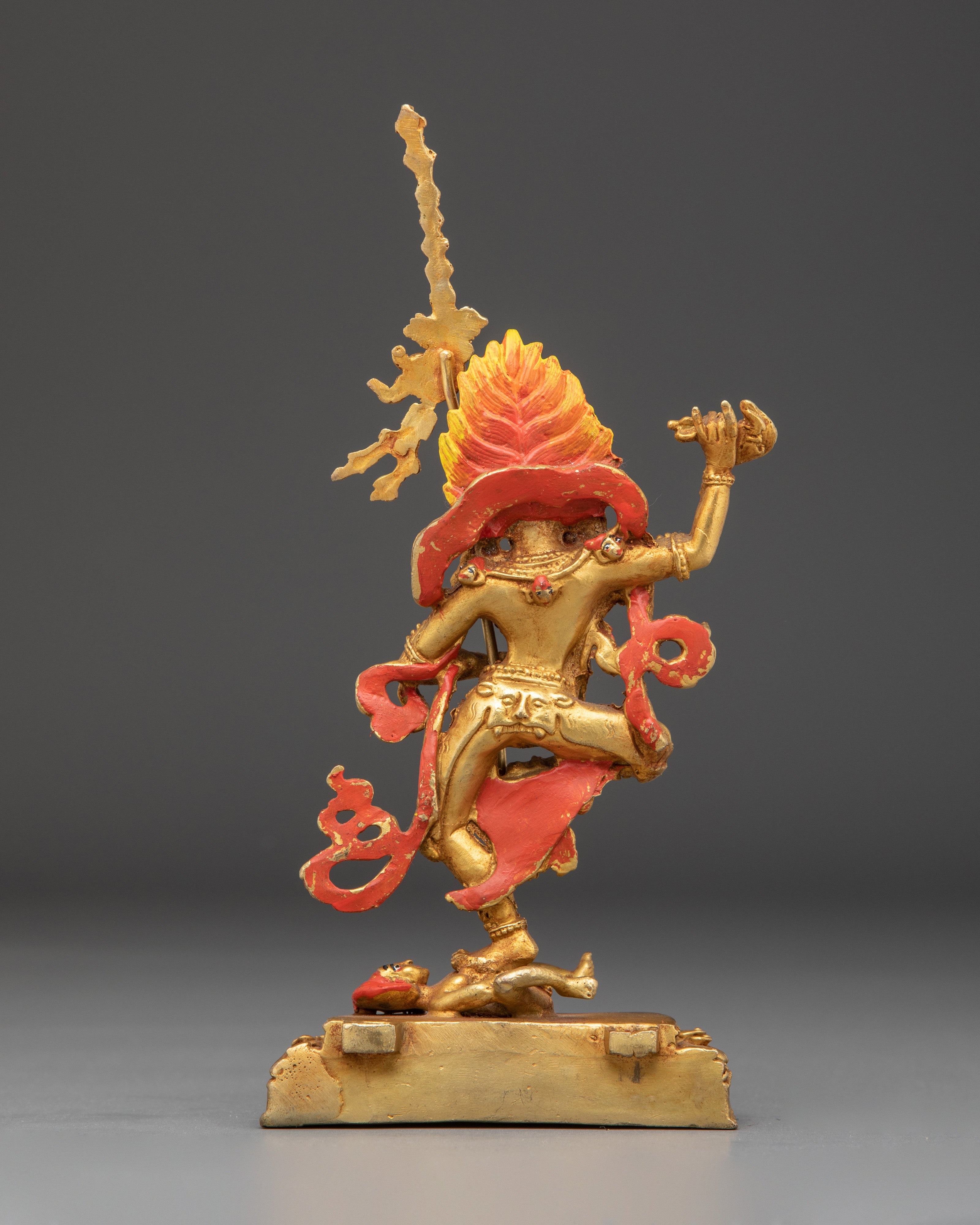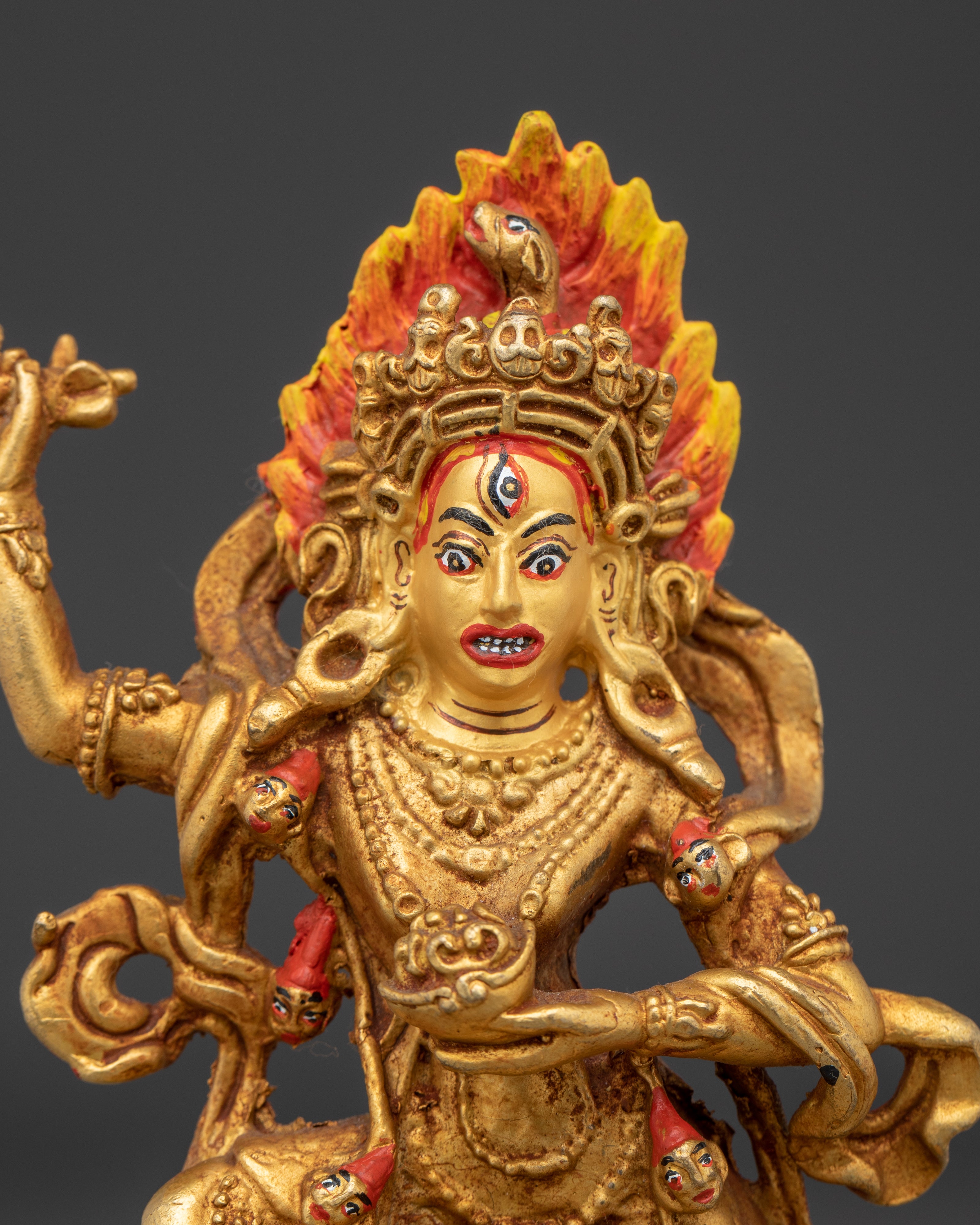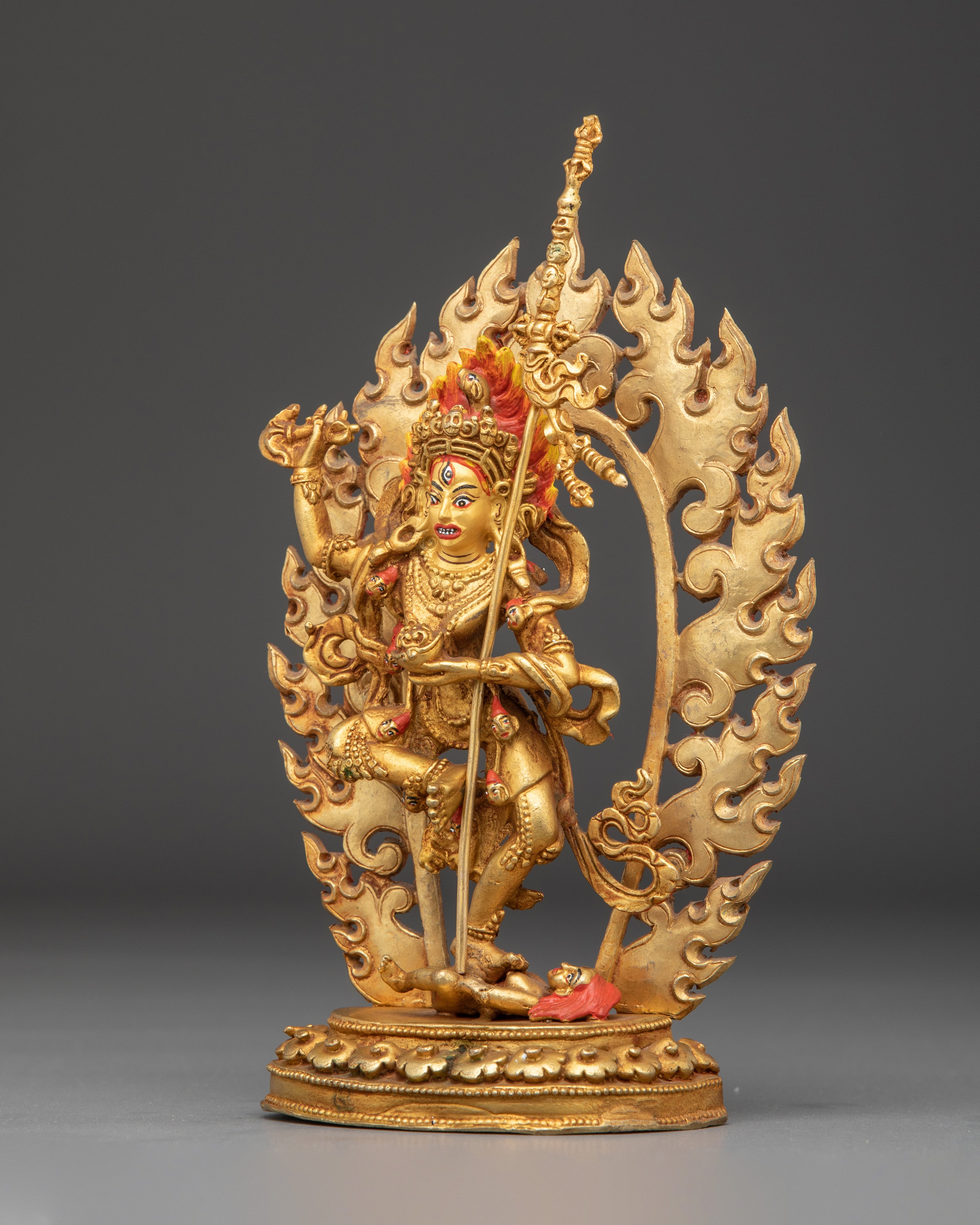 The symbolism in the design of the Dorje Phagmo Statue is rich and profound. The fiery flames surrounding her signify the burning away of harmful energies and the transformation of darkness into light. Her fierce expression and posture symbolize the strength needed to protect spiritual practitioners on their path to enlightenment. The combination of gold plating and vibrant acrylic colors enhances the statue’s divine presence, creating a sense of spiritual power and protection. The intricate details of her clothing and accessories, along with the circular flames behind her, reflect the depth of Tibetan Buddhist symbolism and artistry.