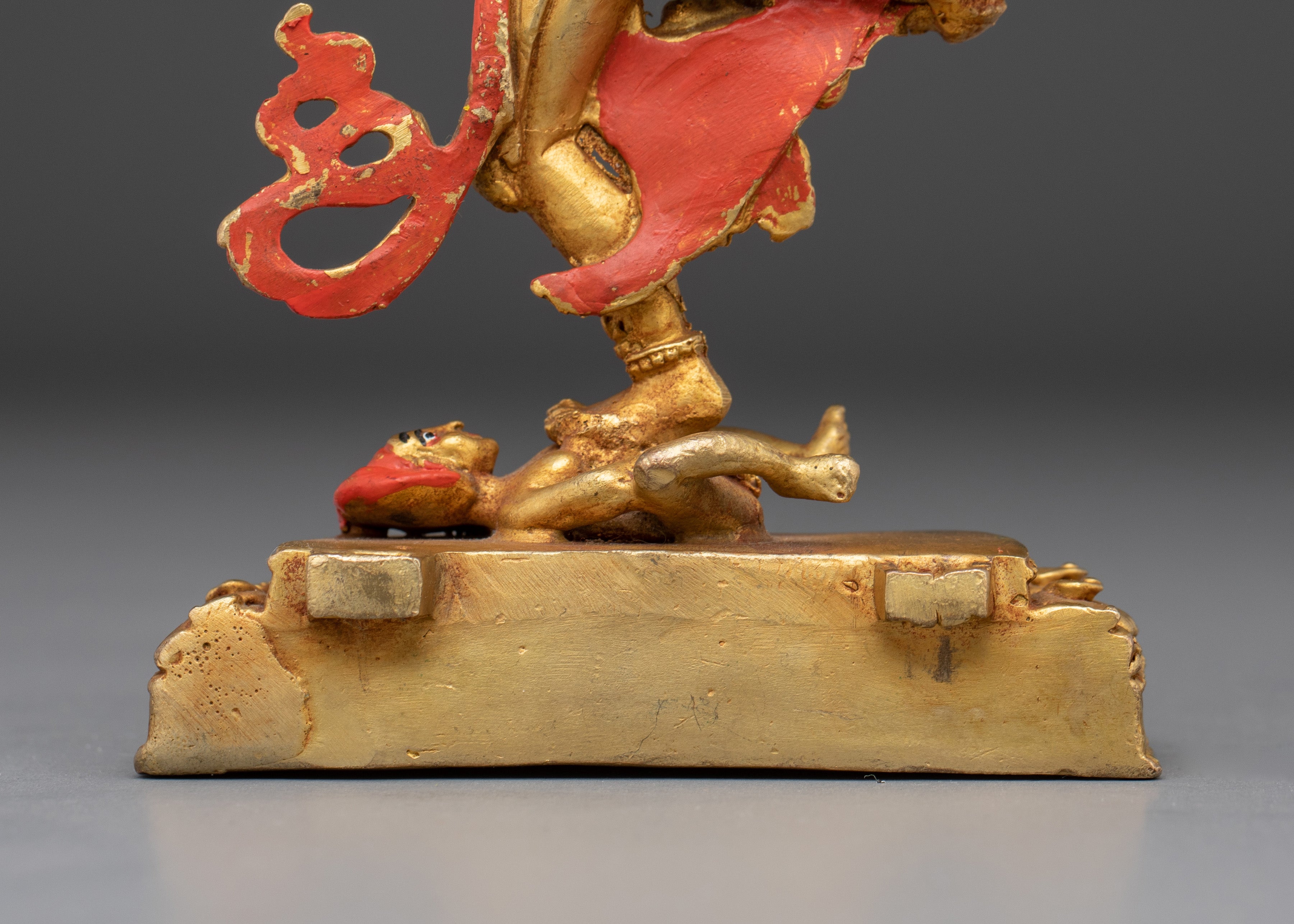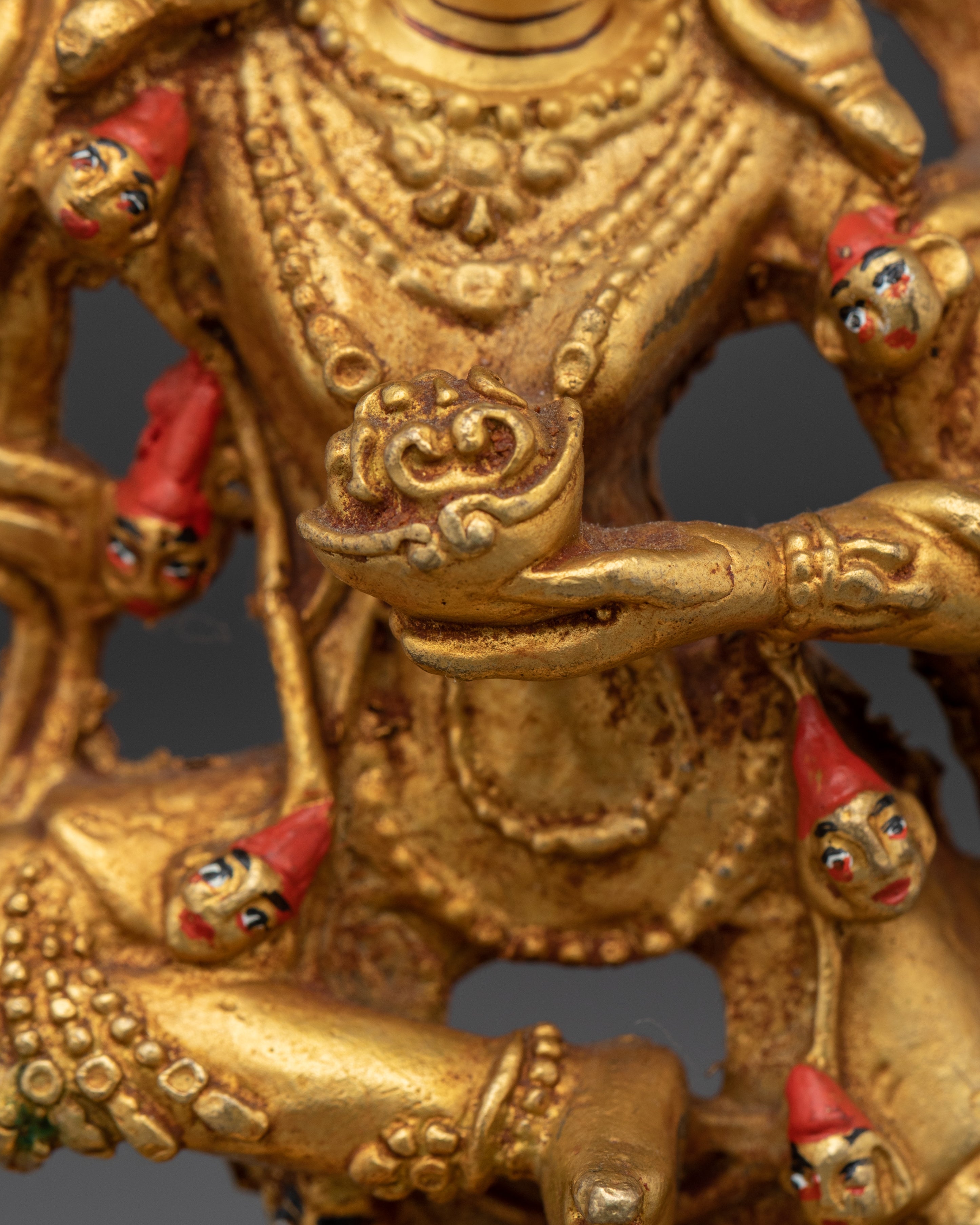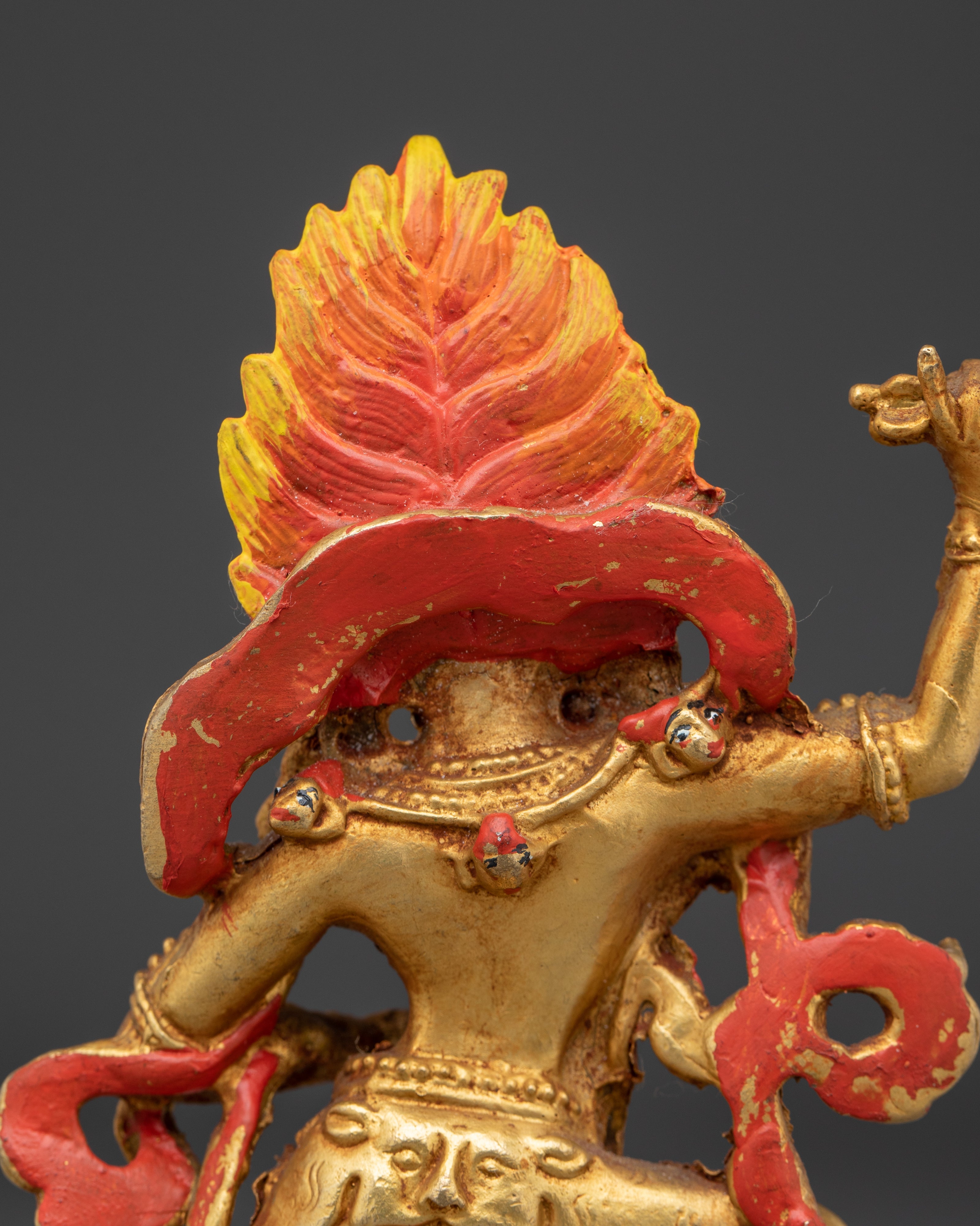 The symbolism in the design of the Dorje Phagmo Statue is rich and profound. The fiery flames surrounding her signify the burning away of harmful energies and the transformation of darkness into light. Her fierce expression and posture symbolize the strength needed to protect spiritual practitioners on their path to enlightenment. The combination of gold plating and vibrant acrylic colors enhances the statue’s divine presence, creating a sense of spiritual power and protection. The intricate details of her clothing and accessories, along with the circular flames behind her, reflect the depth of Tibetan Buddhist symbolism and artistry.