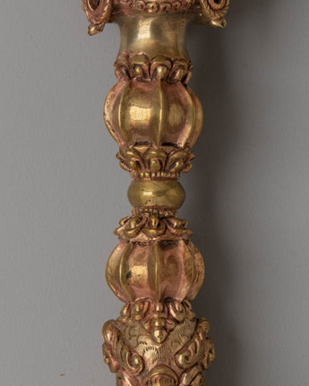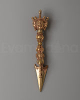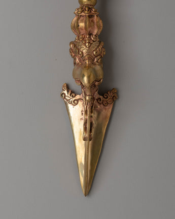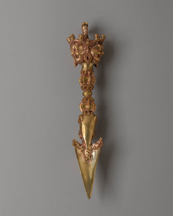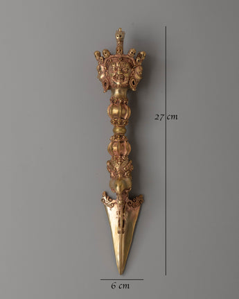 This Sacred Tibetan Phurba Dagger is a revered ritual instrument in Tantric Buddhism, symbolizing strength, wisdom, and spiritual power. Crafted from copper and water gold, this ceremonial dagger measures 27 cm in height and 6 cm in width, weighing 0.79 kg, making it both a powerful spiritual tool and a beautiful piece of art. The Phurba, also known as a kila, holds deep significance in Tibetan spiritual practices, embodying the power to overcome obstacles and transform negative energies into positive ones.