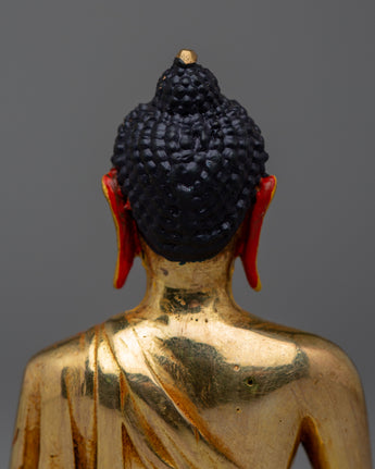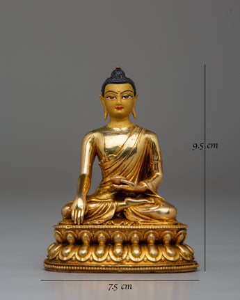 The Shakyamuni Buddha Sculpture of Knowledge and Wisdom is a beautifully crafted, small yet powerful representation of the Buddha's teachings. Standing at 9.5 cm in height and 7.5 cm in width, this statue weighs 0.24 kg and is made with a copper body, coated in 24K gold plating, and accented with acrylic color to enhance its detail and spiritual energy. The Buddha’s serene and composed expression captures the essence of Shakyamuni Buddha, the historical Buddha, revered for his profound wisdom and compassion.