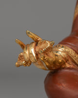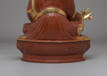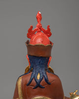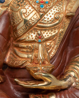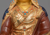The Guru Rinpoche statue depicts the master seated in a serene, regal posture, symbolizing enlightenment and the power of compassion. Holding a ritual object in one hand and a lotus in the other, the figure represents the balance between wisdom and purity. The 24K gold gliding creates an aura of divine light, emphasizing the revered figure’s sacred status. The intricate details of the copper body, combined with the vibrant acrylic colors and gemstones used to decorate the robes, crown, and jewels, further elevate this statue’s spiritual significance.