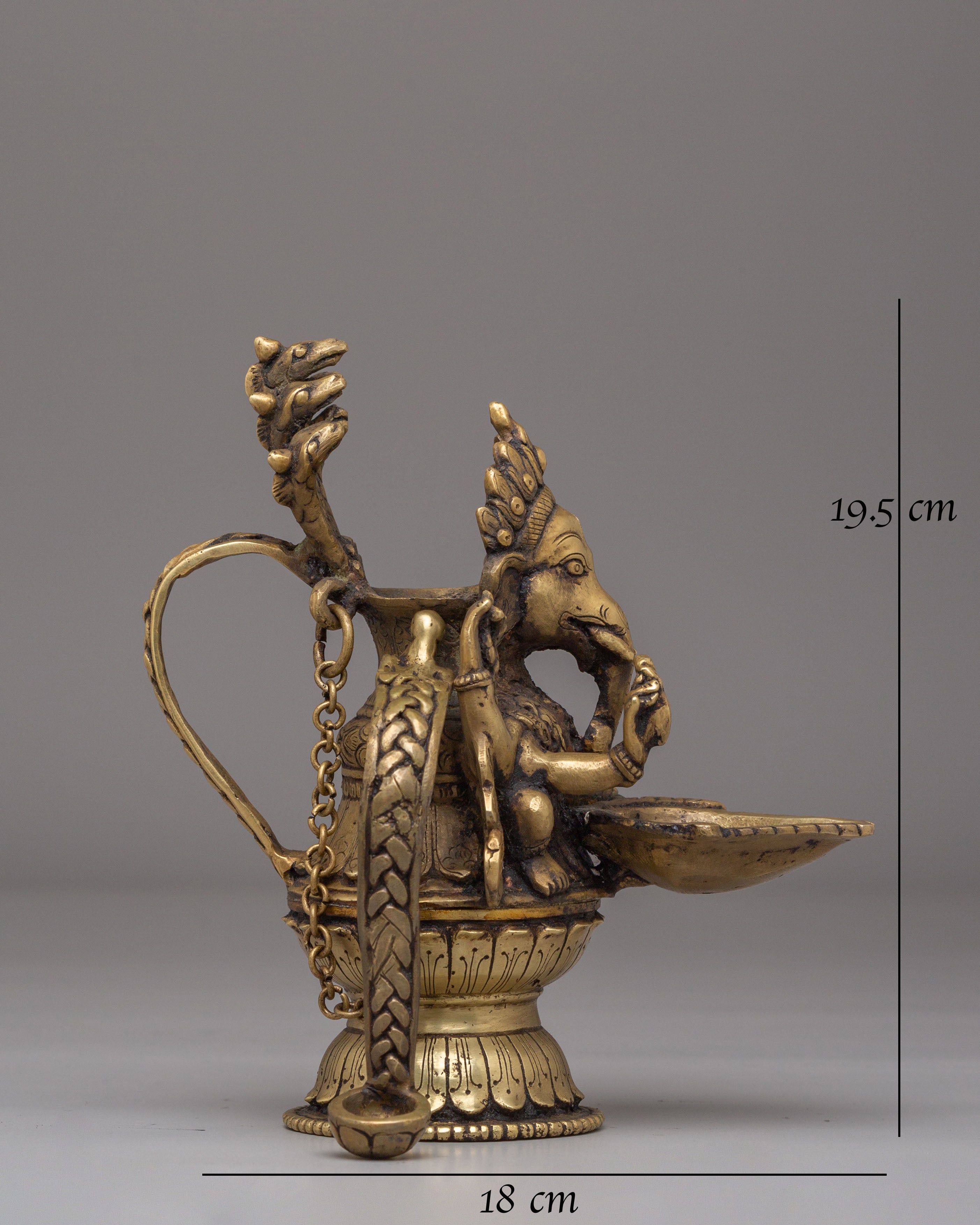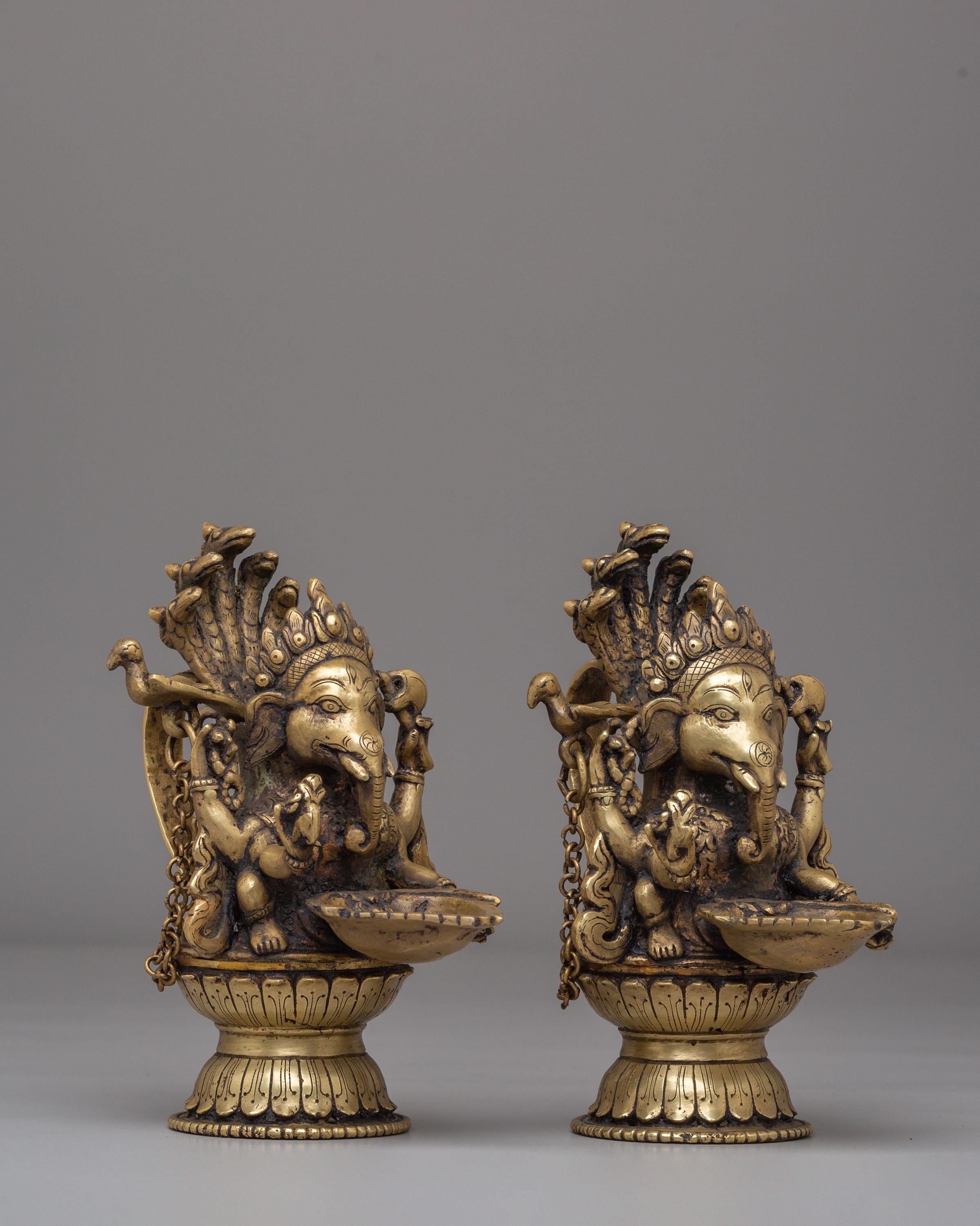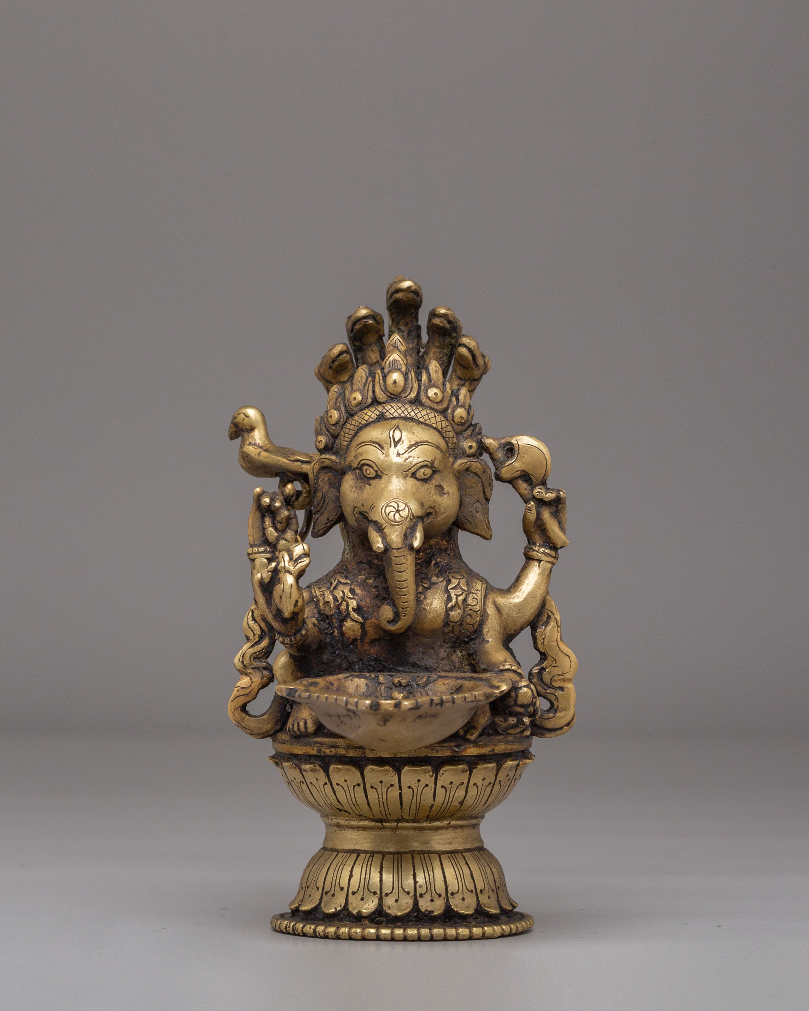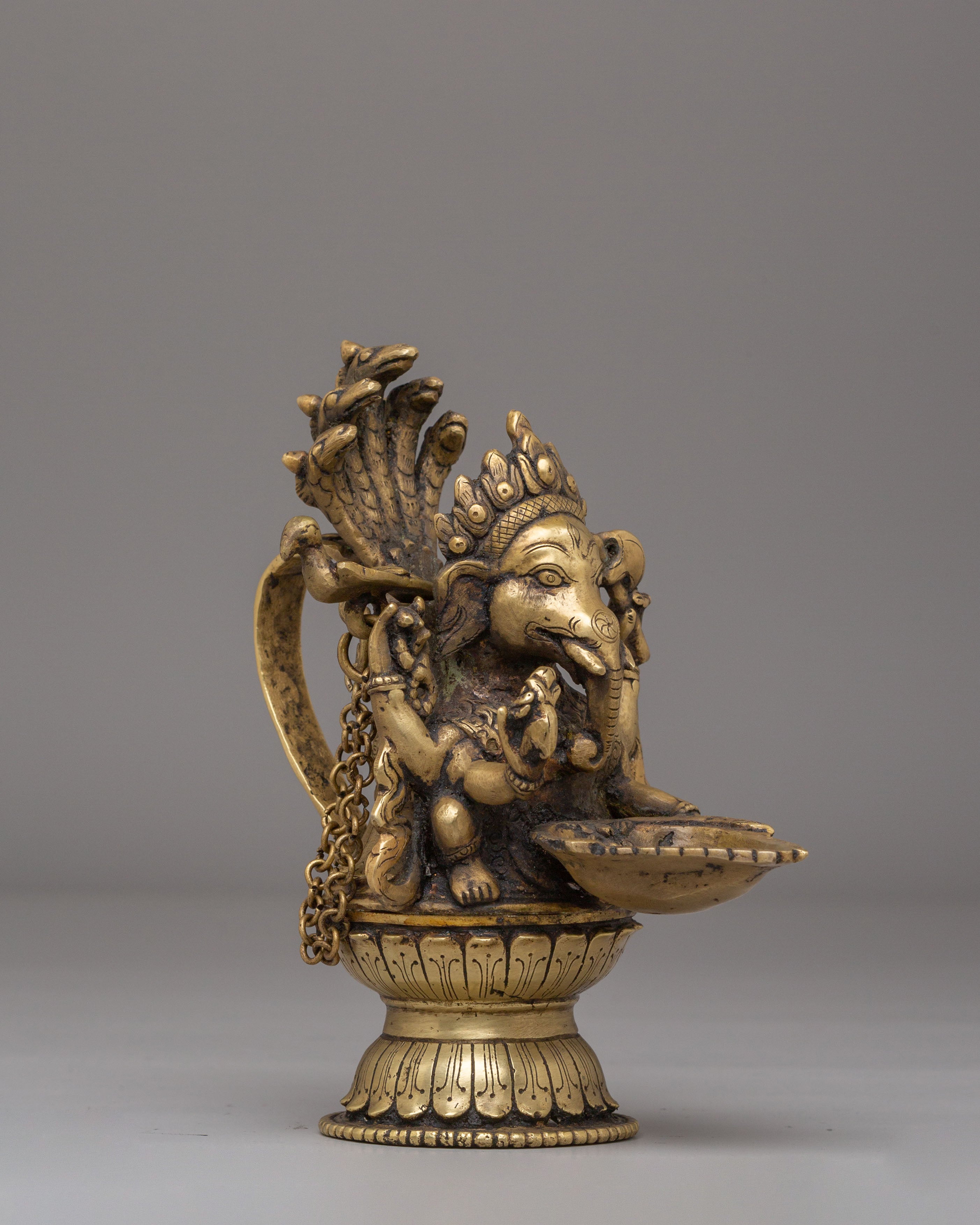 In terms of iconography, Lord Ganesha is positioned at the top of each Sukunda, symbolizing the remover of obstacles and the bringer of auspicious beginnings. Below, the lamp section represents illumination and spiritual clarity. The back of Ganesha’s head is adorned with Shesh Naag, the cosmic serpent, signifying protection and continuity, while Ganesha holds a parashu (axe) in his right hand, symbolizing the cutting away of ignorance and attachments. Together, these elements make the Sukunda not only a ritual object but a deeply symbolic presence in sacred practice.