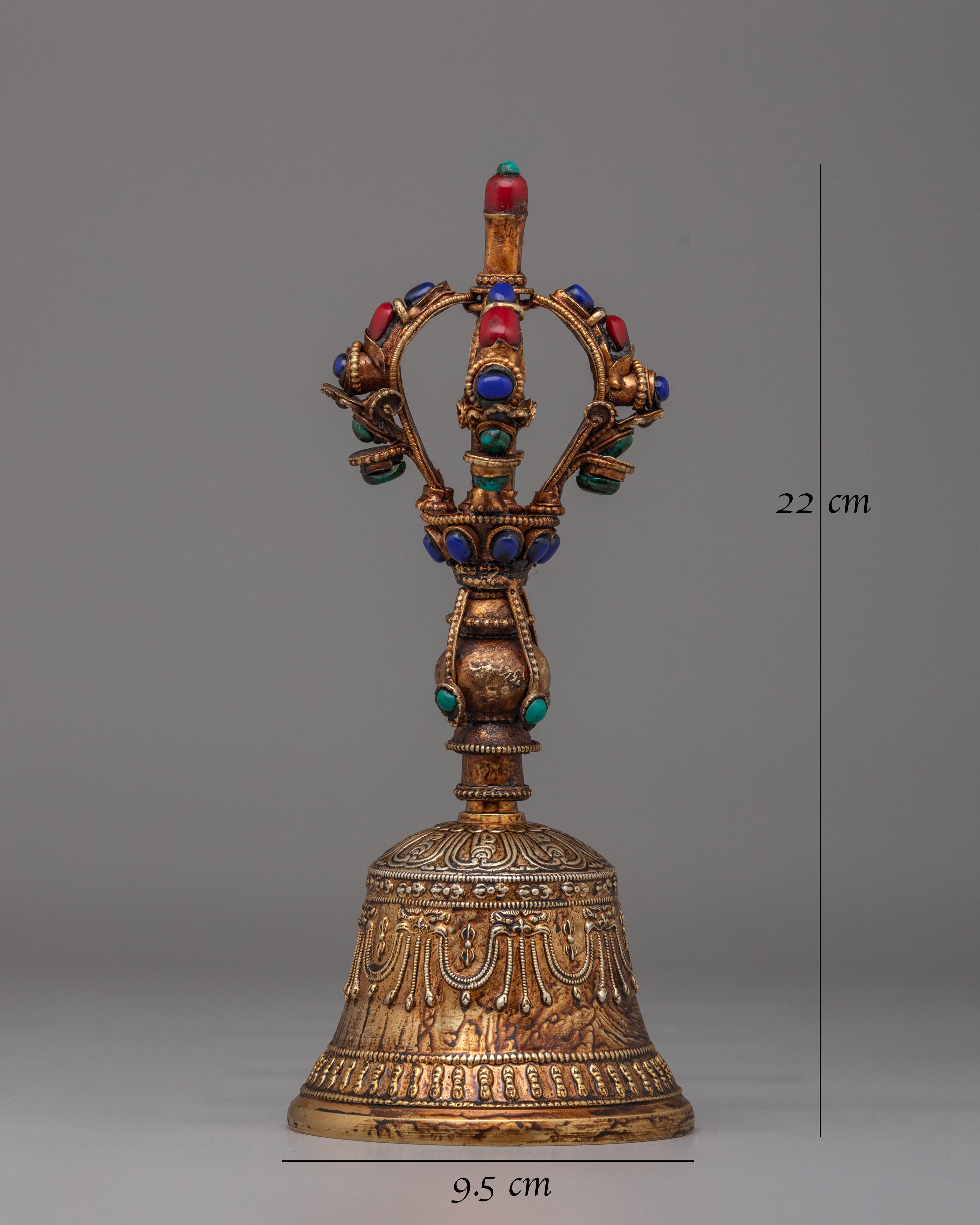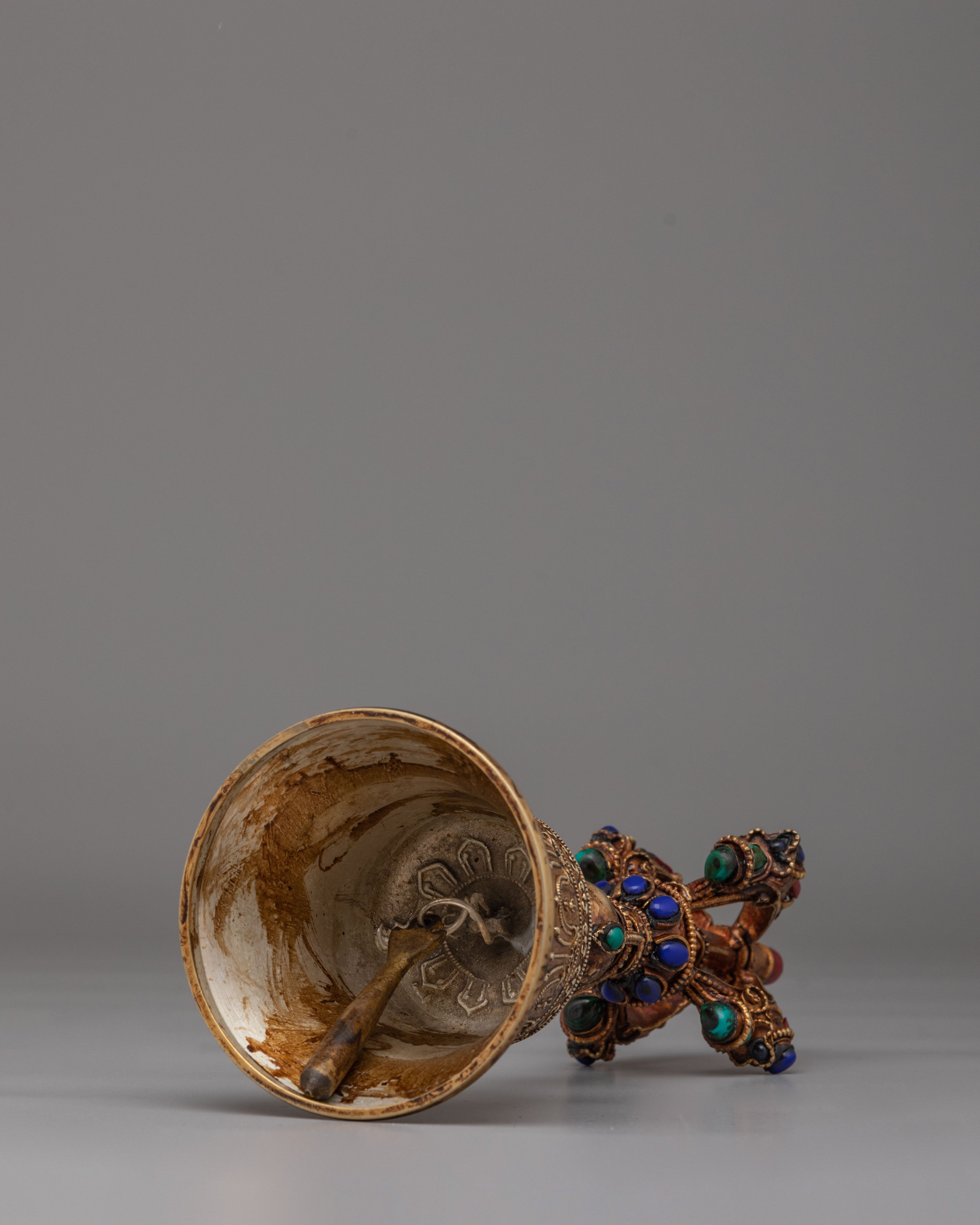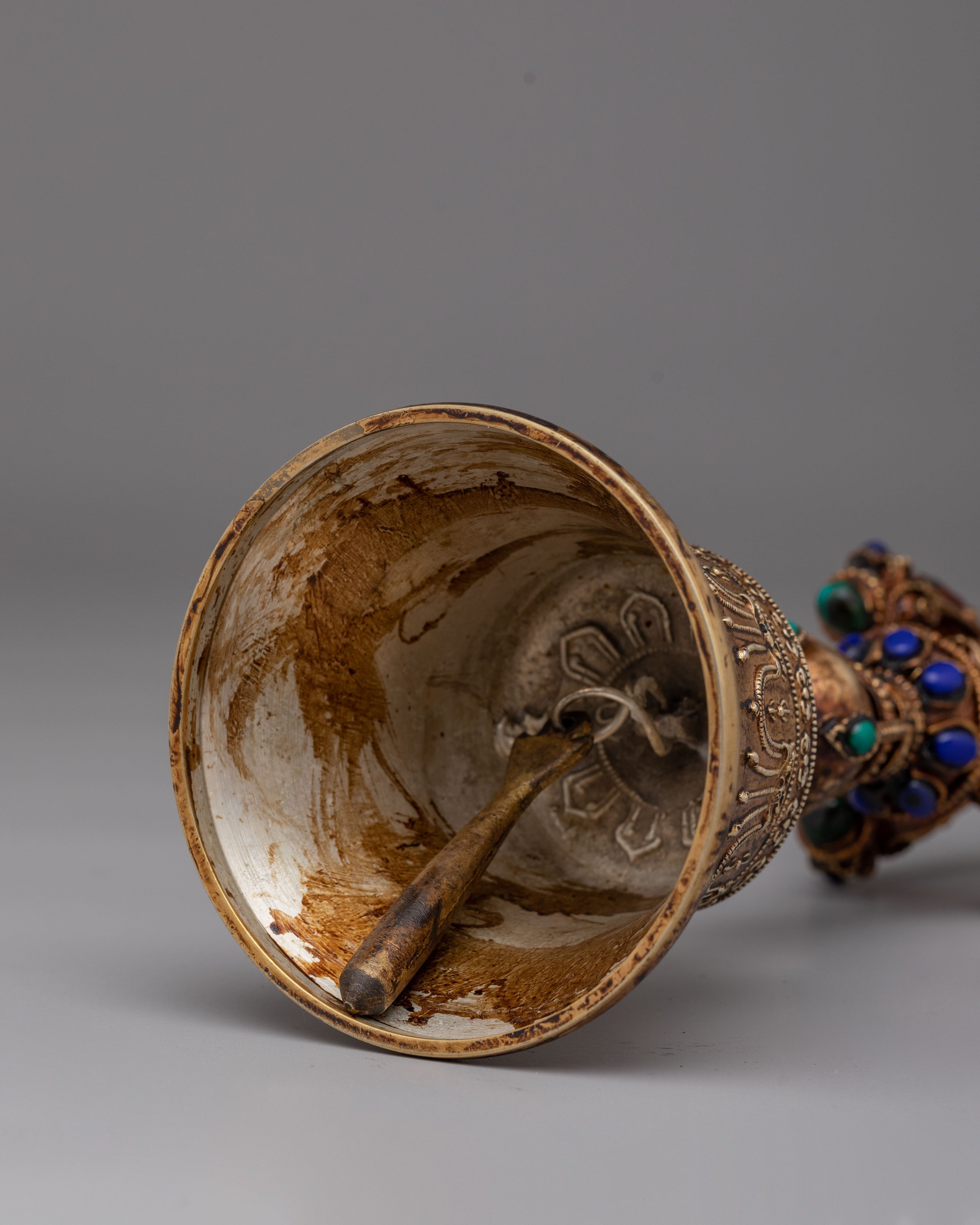 The copper body of the bell is beautifully detailed with traditional motifs, and the gemstones coral, turquoise, and lapis lazuli are strategically placed to add both beauty and significance. Coral is believed to offer protection and vitality, turquoise enhances communication and healing, and lapis lazuli promotes wisdom and spiritual clarity. Together, these stones infuse the bell with powerful energies, making it an essential tool in meditation, prayer, and sacred rituals.