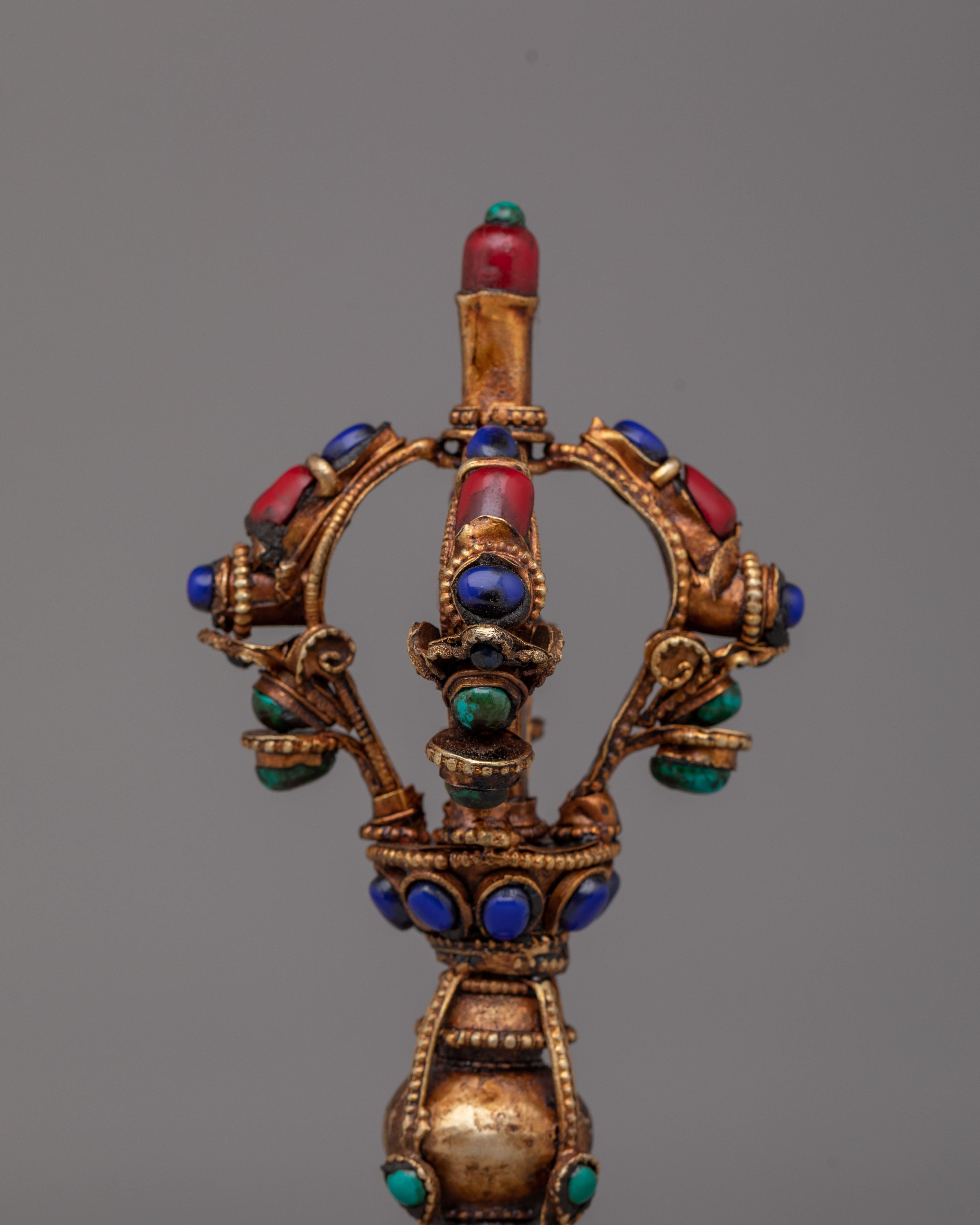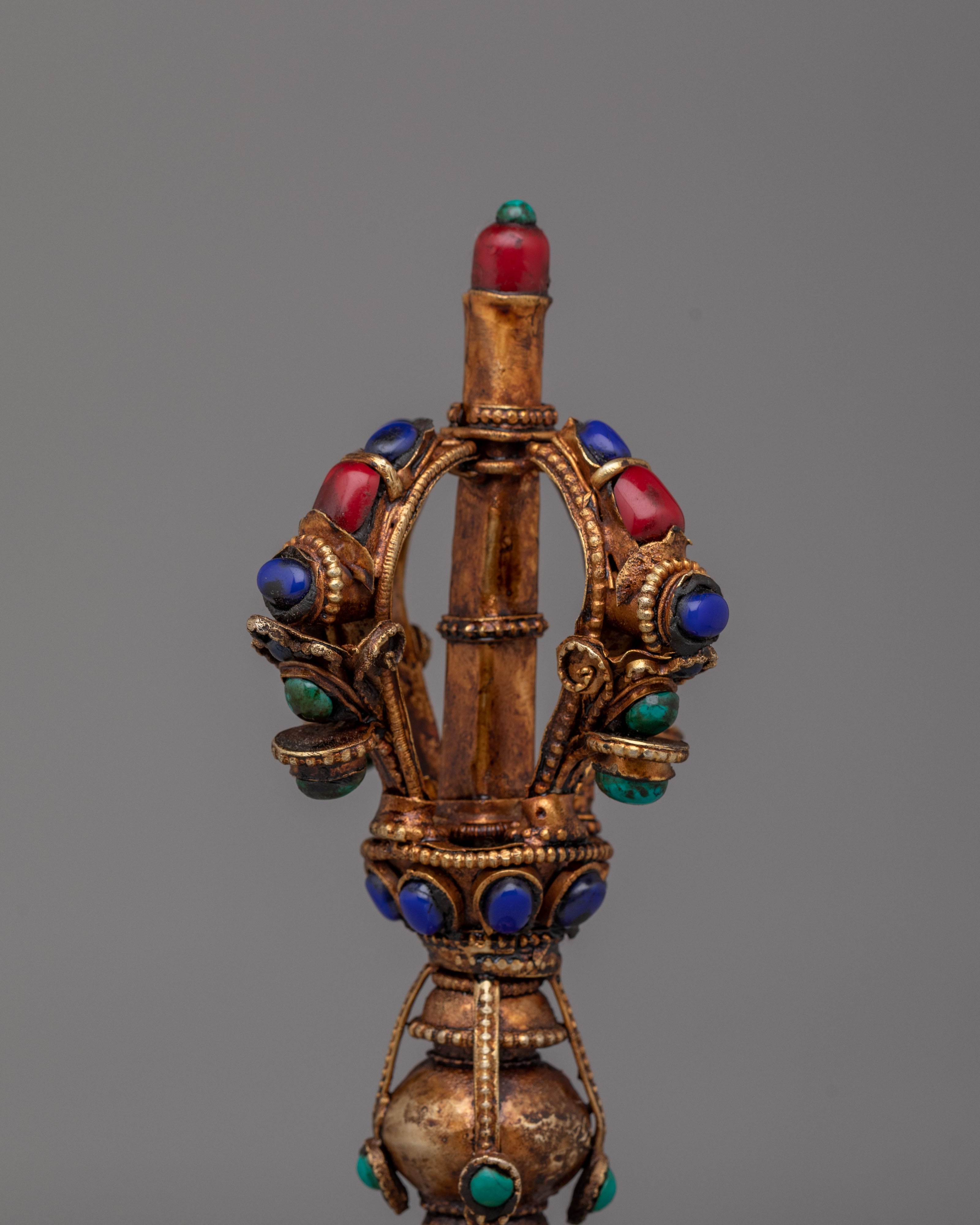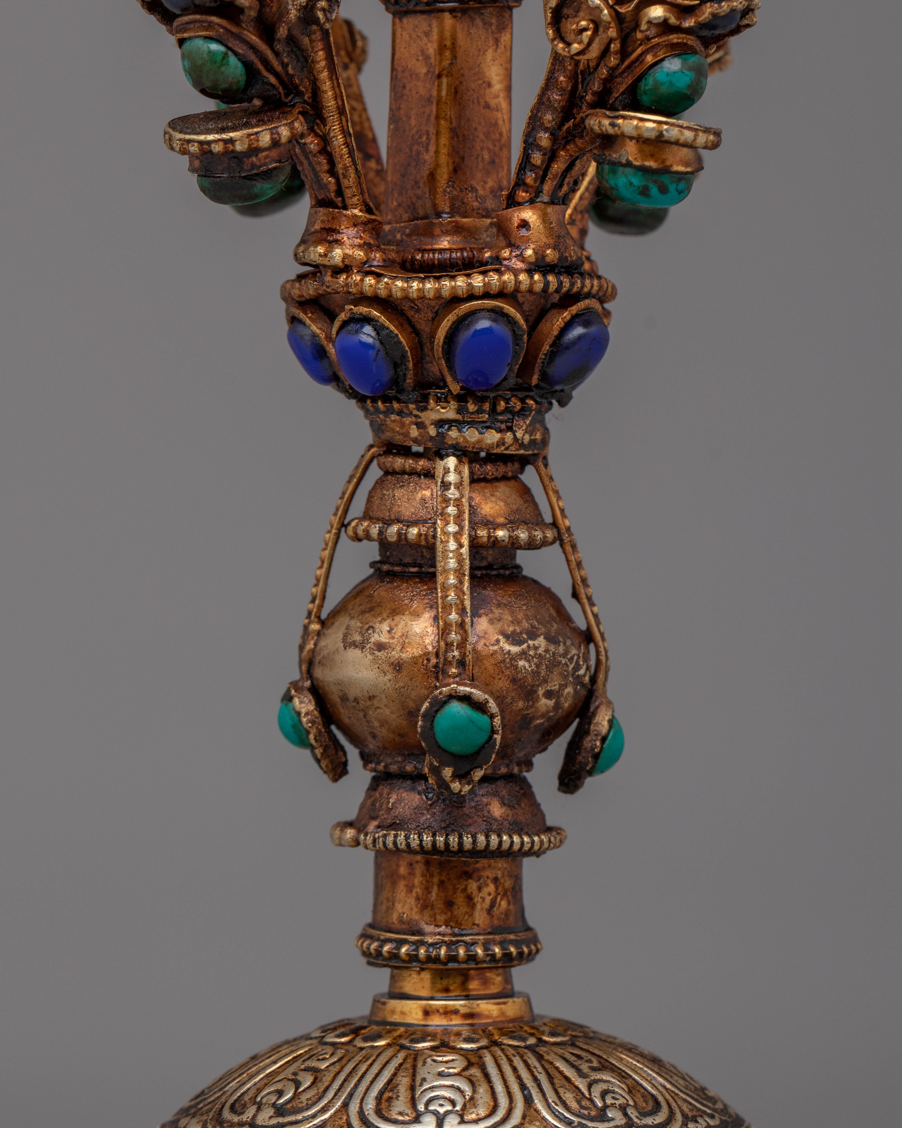 The copper body of the bell is beautifully detailed with traditional motifs, and the gemstones coral, turquoise, and lapis lazuli are strategically placed to add both beauty and significance. Coral is believed to offer protection and vitality, turquoise enhances communication and healing, and lapis lazuli promotes wisdom and spiritual clarity. Together, these stones infuse the bell with powerful energies, making it an essential tool in meditation, prayer, and sacred rituals.
