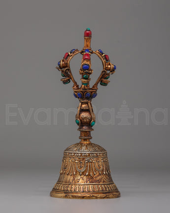 This Tibetan Bell for Ritual is a sacred and exquisite artifact, expertly crafted from copper and adorned with coral, turquoise, and lapis lazuli gemstones. Standing at 22 cm in height and 9.5 cm in width, this bell is not only a functional item for Buddhist rituals but also a work of art. The bell is designed with intricate carvings and gemstone accents that enhance its spiritual power. In Tibetan Buddhism, the bell is used as a symbol of wisdom, representing the feminine aspect of the spiritual path, and it is often paired with a vajra to invoke the divine energy during rituals.