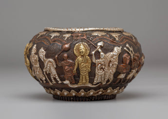 The Tibetan Golpa Handcrafted Art is a striking piece of traditional Tibetan craftsmanship, standing at 8 cm in height and 13 cm in width. This exquisite artwork is created with a copper and iron body, which is then electroplated with gold and silver for a rich, radiant finish. The fine details are enhanced with acrylic colors, adding vibrancy to this spiritually significant piece. It’s a perfect addition to any collection of Tibetan art or as a unique centerpiece in a meditation or sacred space.
