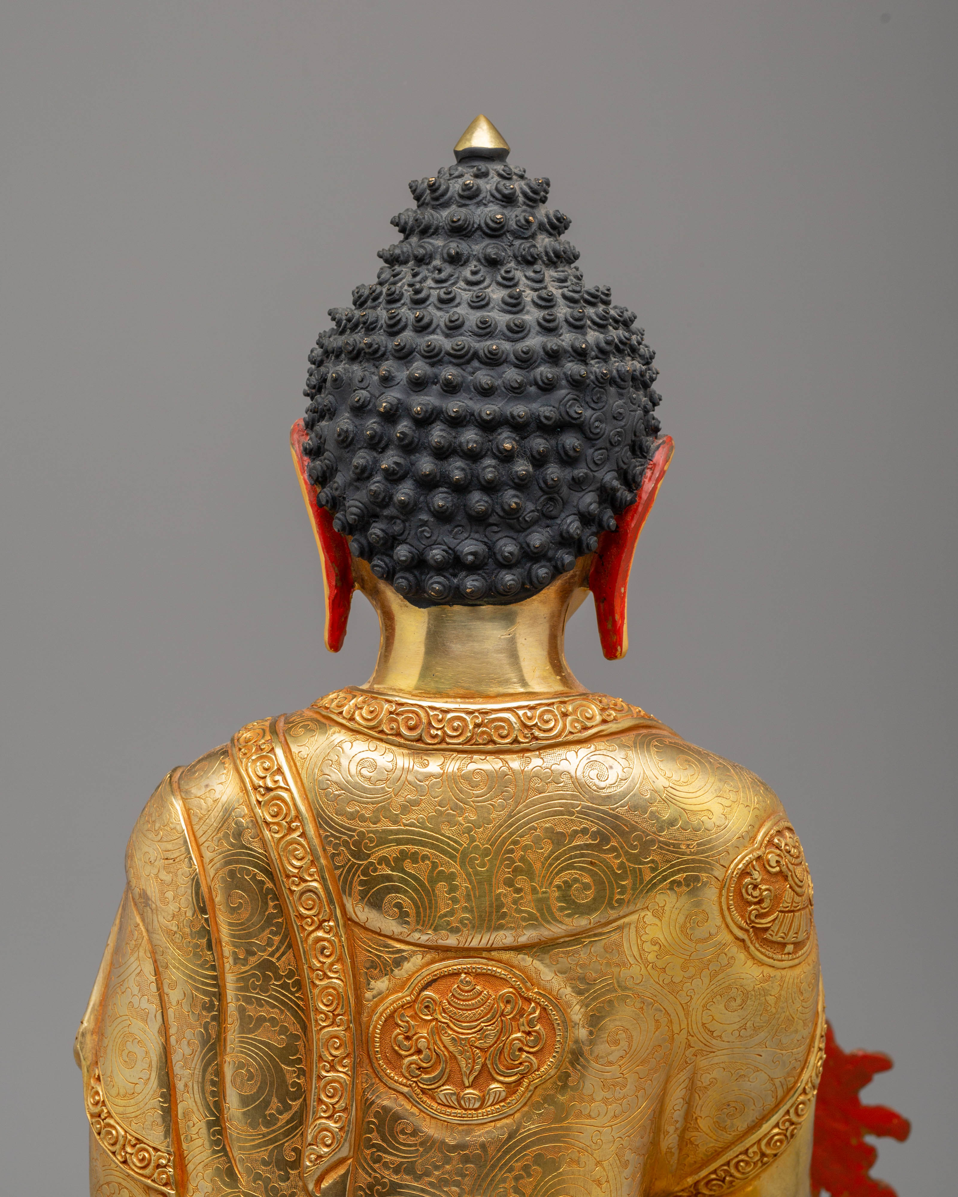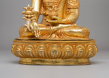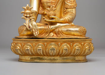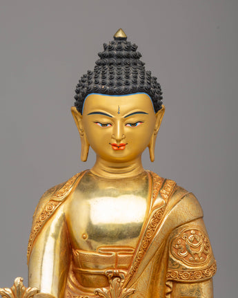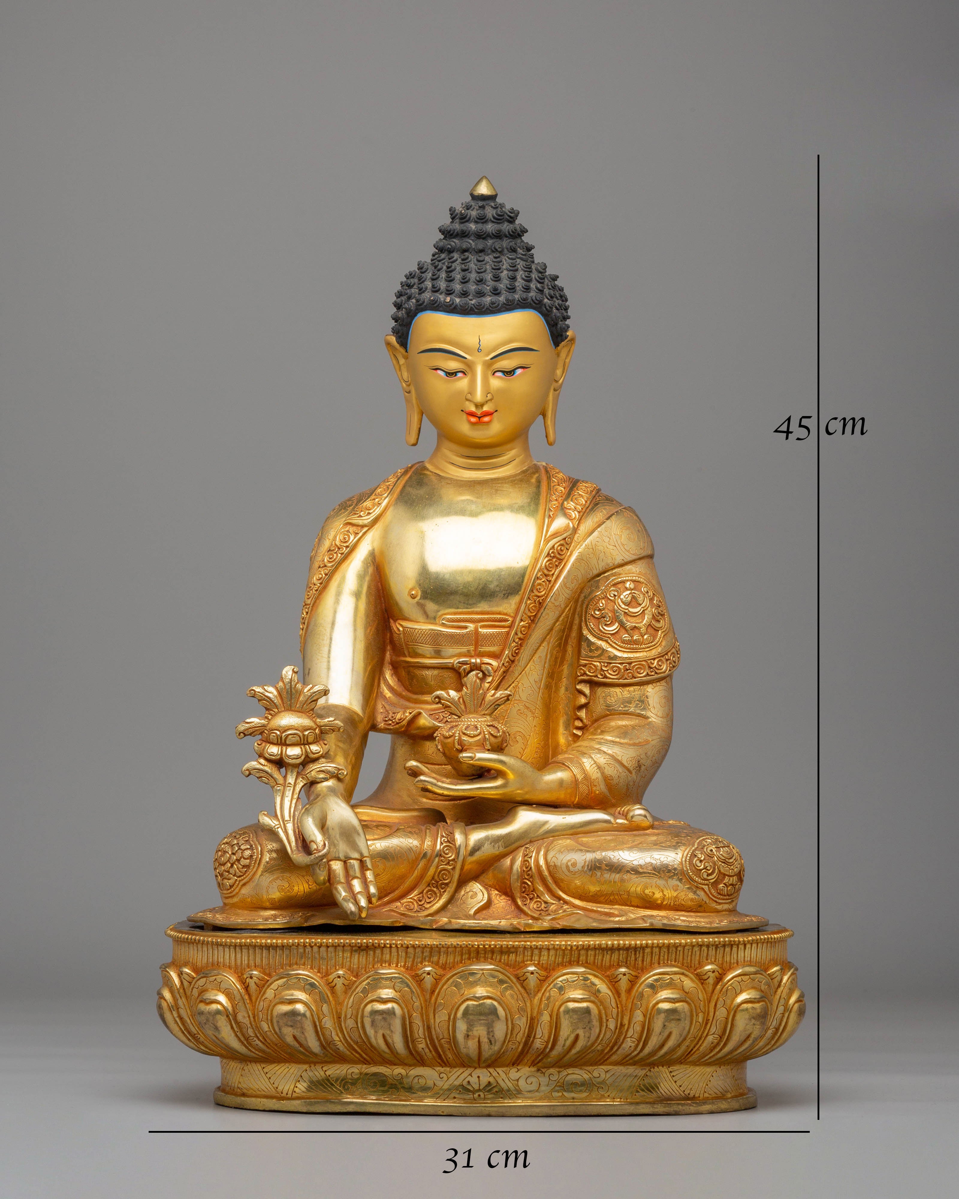 This magnificent Tibetan Medicine Buddha statue is crafted from copper, plated with 24K gold, and enhanced with acrylic color. Standing at 45 cm tall and 31 cm wide, it radiates divine healing energy and spiritual grace. The detailed design captures the serene presence of the Medicine Buddha, revered for his power to heal physical, emotional, and spiritual ailments.