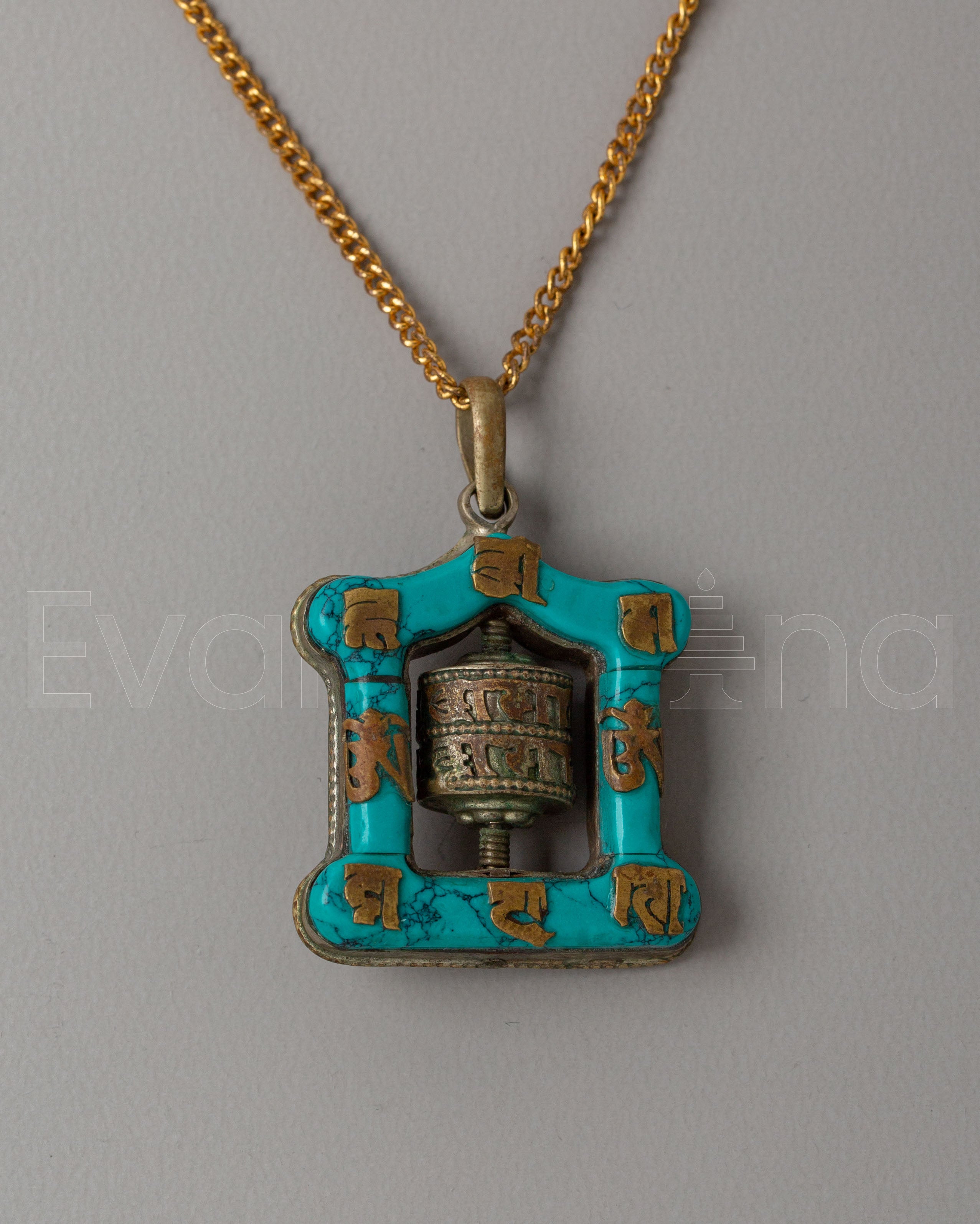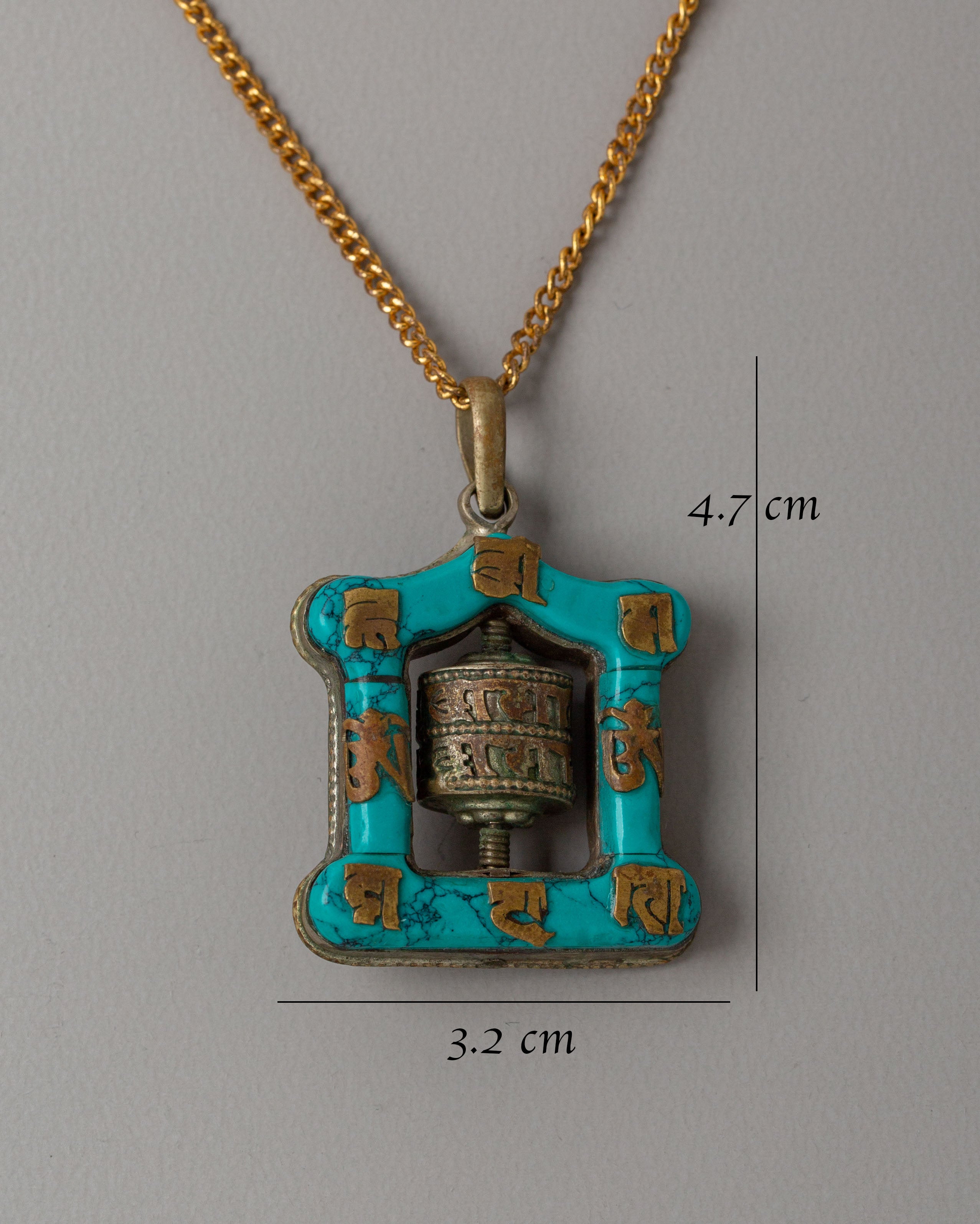 The turquoise color on the frame is symbolic of healing and balance, while the Tibetan mantras inscribed around the wheel add an extra layer of spiritual significance. This design is a representation of how the repetition of mantras can bring peace, clarity, and positive energy into your life. The rotating prayer wheel within the locket is a functional element, allowing the wearer to feel the continuous flow of energy, symbolizing the ongoing journey of mindfulness and meditation.