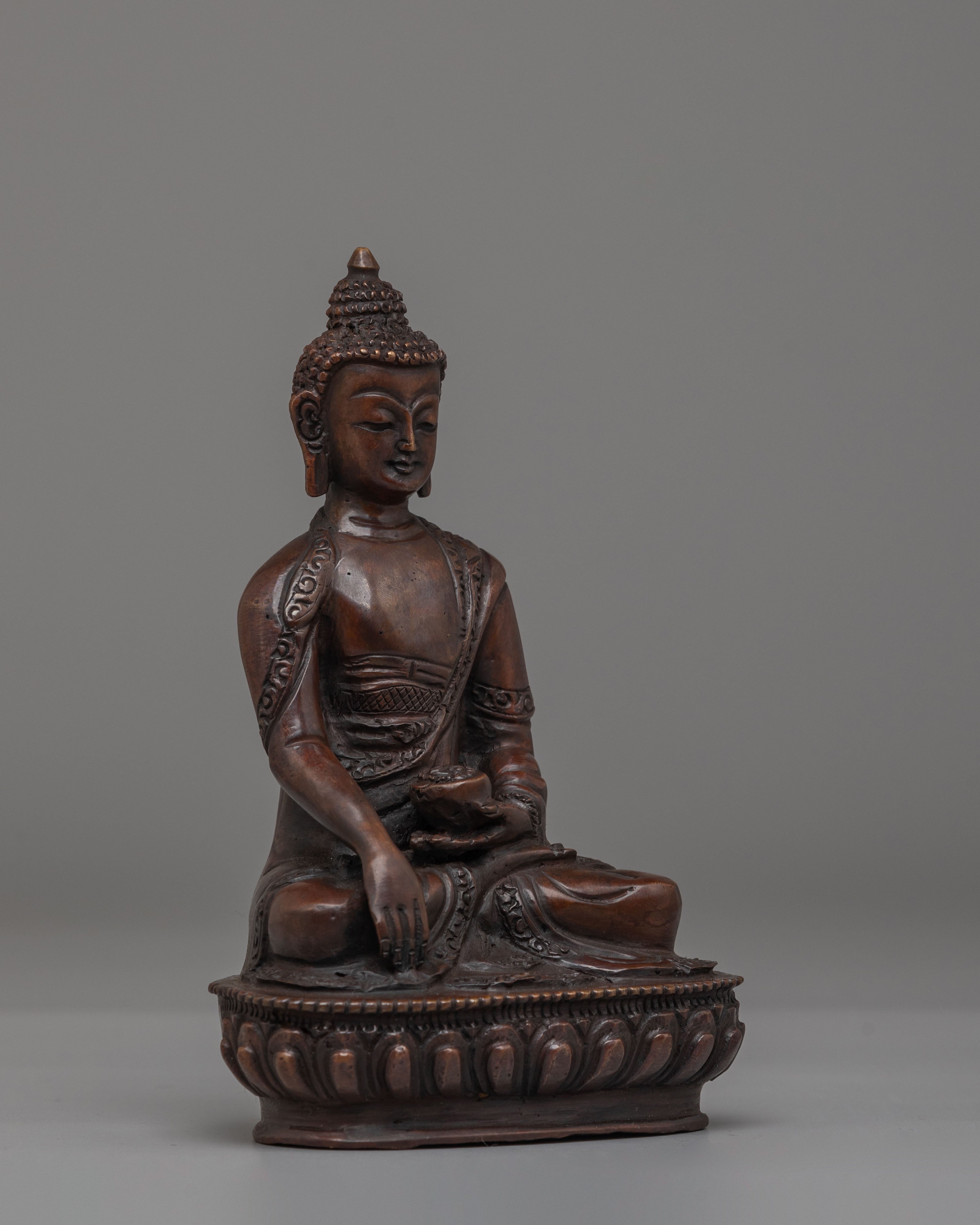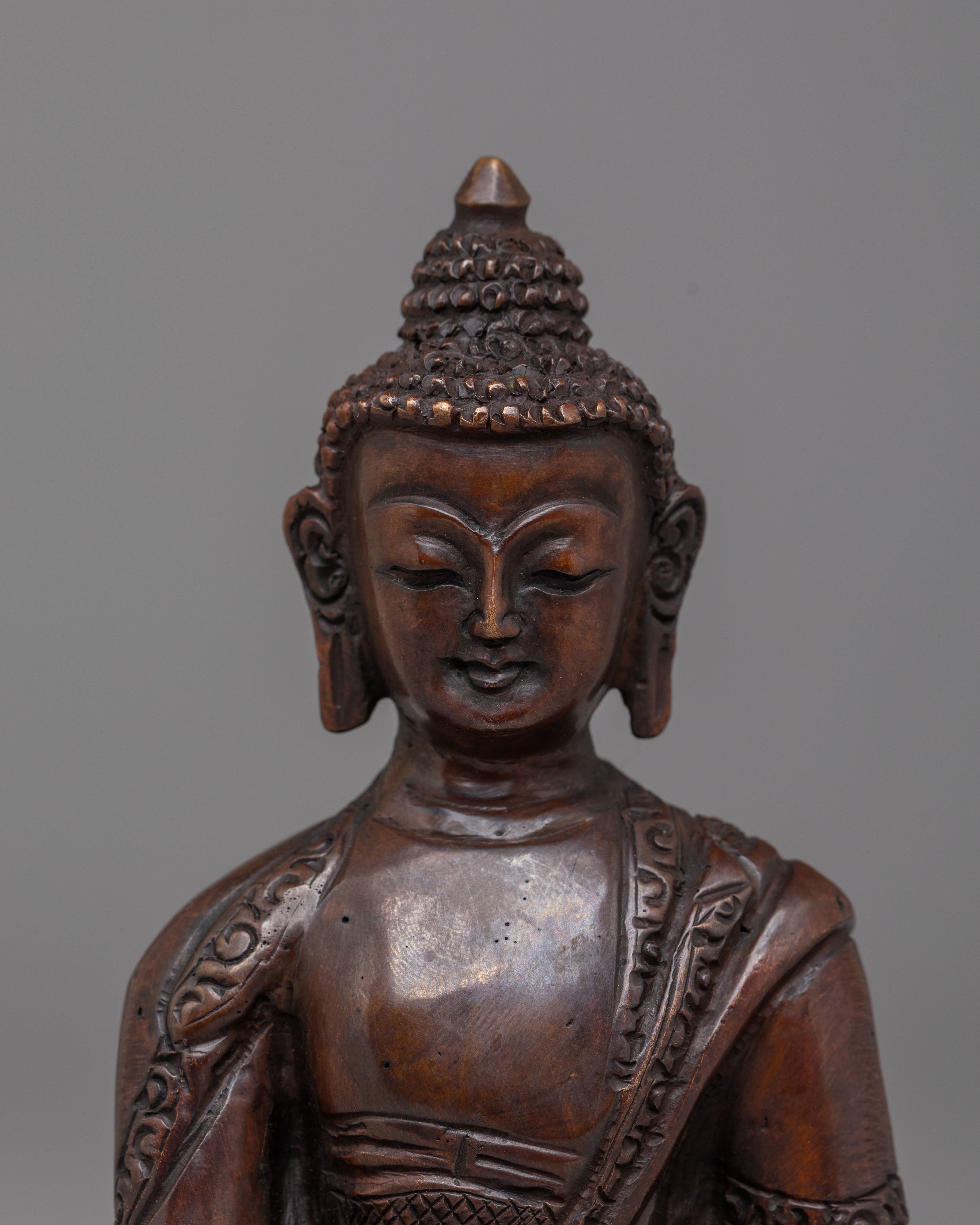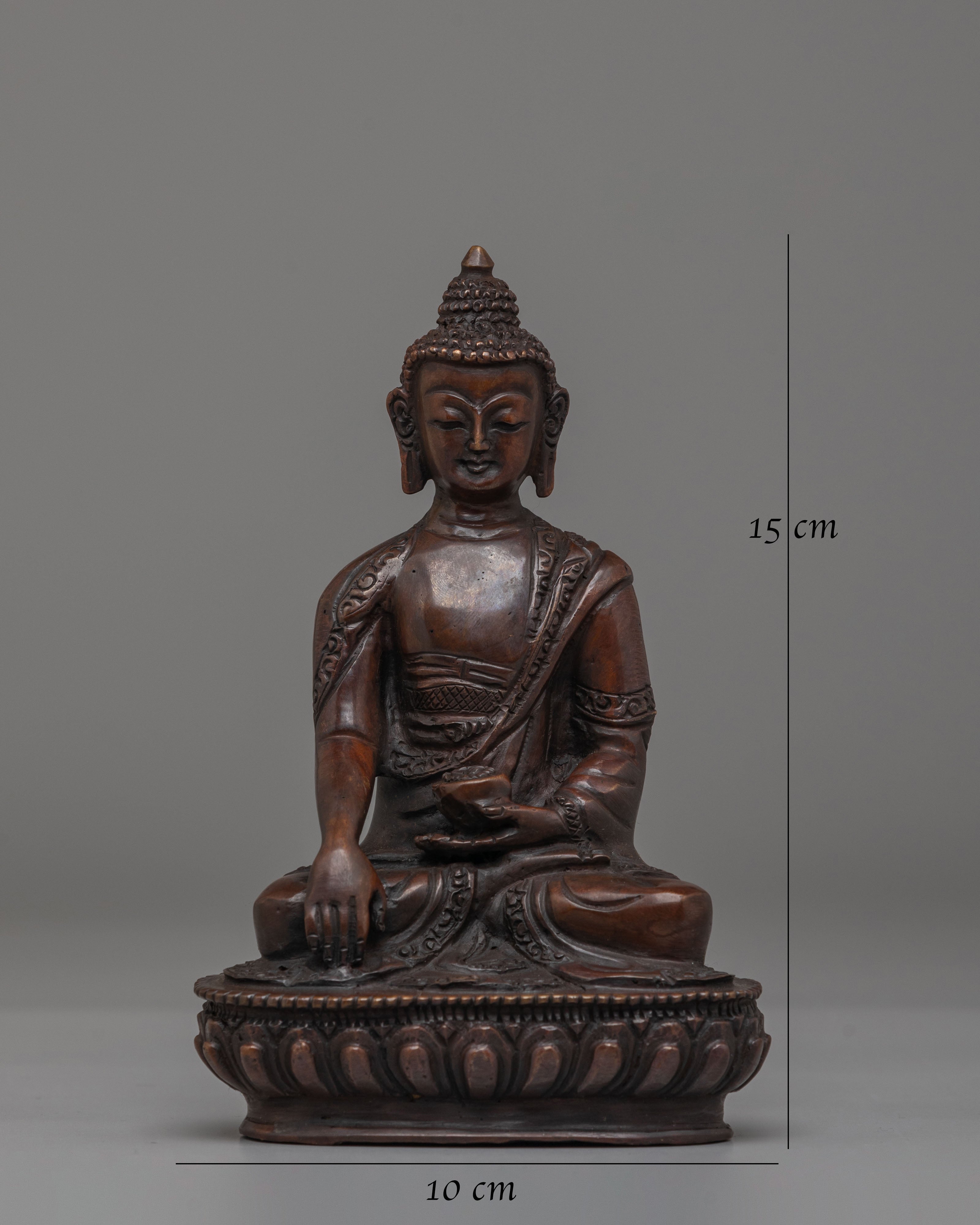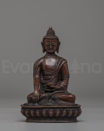 Shakyamuni Buddha represents the embodiment of enlightenment and spiritual awakening. This statue serves as a reminder of his teachings on suffering, compassion, and the pursuit of wisdom. The oxidized copper material adds an element of depth and connection to ancient Buddhist traditions, while also creating a calming, grounding presence in your home or sacred space.