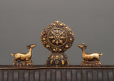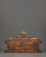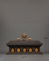 The Bodhisattva Figures with Wooden Altar will provide a peaceful touch to your space. This finely created set includes complex gold-plated copper Bodhisattva figurines representing wisdom, compassion, and enlightenment. The statues stand gracefully on a wooden altar, bringing a pleasant and quiet feeling to any environment. With a height of 29 cm and a width of 49 cm, this set is ideal for meditation rooms, altars, or any room seeking a peaceful, spiritual presence.