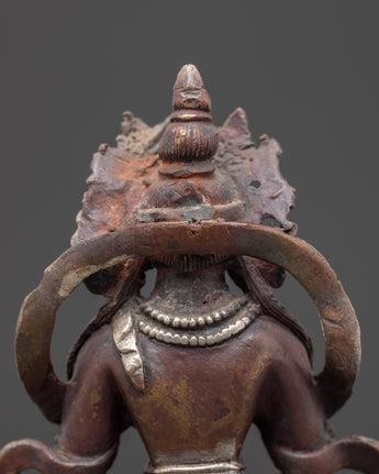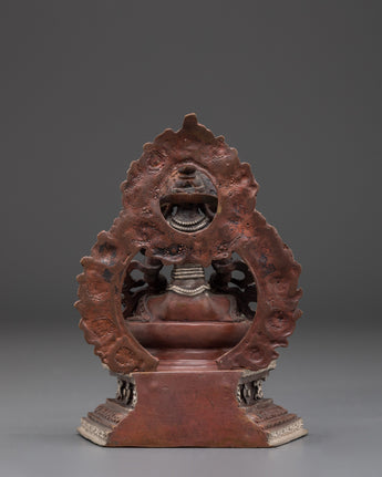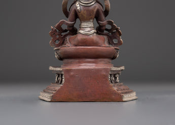 The statue's rich details are accentuated by the oxidized copper body, and Amitayus's robes, crown, and expression are highlighted by the silver plating. The lotus seat he sits on symbolizes purity and enlightenment, while his action of holding the vase symbolizes the constant flow of vitality. This statue is a sacred item for Buddhist art practitioners and collectors because of its exquisite craftsmanship, which symbolizes traditional Tibetan artwork. An important addition to any Buddhist altar, meditation area, or interior design is the Buddhist Longevity Icon Amitayus Statue. It is the perfect emblem for prayer and meditation since it represents the benefits of long life, good health, and spiritual development.