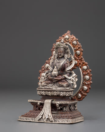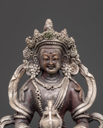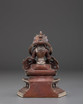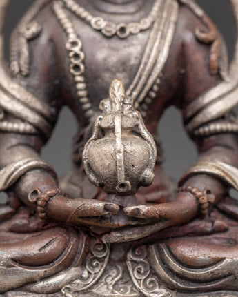 The Buddhist Longevity Icon Amitayus Statue captures the serene essence of the Buddha of Eternal Life with stunning detail. Standing 13 cm tall, this sculpture is crafted from oxidized copper and finished with a striking silver plating, giving it elegance. Amitayus holds a vase containing the nectar of immortality, symbolizing ongoing health, longevity, and deep spiritual insight. Its calm expression invites tranquility and inspiration, making this statue a meaningful addition to any space dedicated to mindfulness, healing, or spiritual growth. Embrace the powerful symbolism of Amitayus to enhance your environment with peace and vitality.