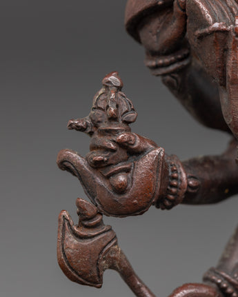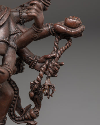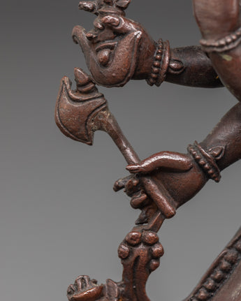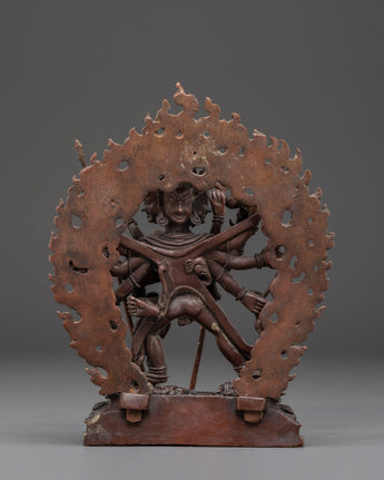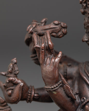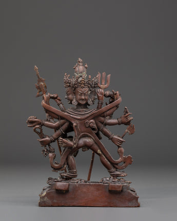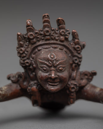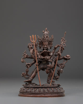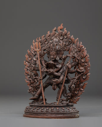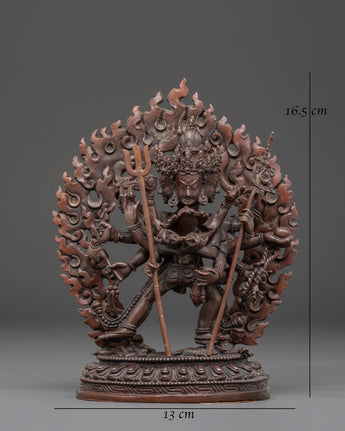 This powerful Chakrasambhara Protection Deity Statue represents a significant figure in Tibetan tantric Buddhism, revered for overcoming ignorance and inner struggles. Standing 16.5 cm tall and 13 cm wide, this finely detailed sculpture weighs 0.81 kg and captures Chakrasambhara in his fierce, multi-armed form holding ritual tools. Encircled by flames symbolizing transformation and clarity, the statue conveys his mastery over ego and illusion, inspiring energy and focused control. Crafted from oxidized copper, the statue’s rich patina adds depth and sacred presence.