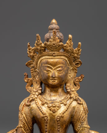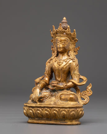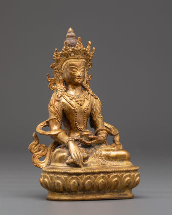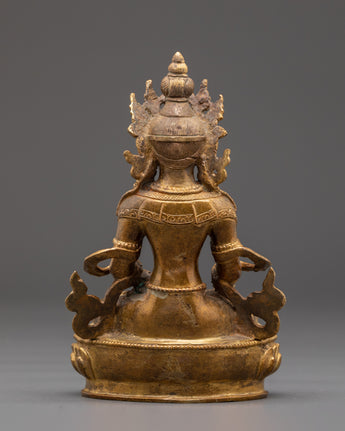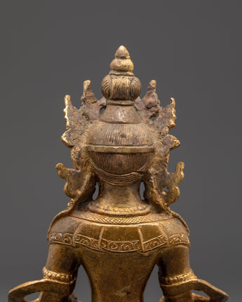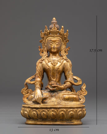 Handcrafted from copper and finished with bright gold plating, this Akshobhya Buddha sculpture exemplifies the artistry of talented Himalayan craftsmen. Every aspect, from the serene attitude to the beautiful clothing, is thoughtfully designed to honor Buddhist traditions. The statue's balanced size and weight make it appropriate for both personal altars and larger spiritual settings. Keeping this sacred statue in your environment not only improves meditation practice, but it also fosters a stronger connection to Buddhist wisdom and teachings.