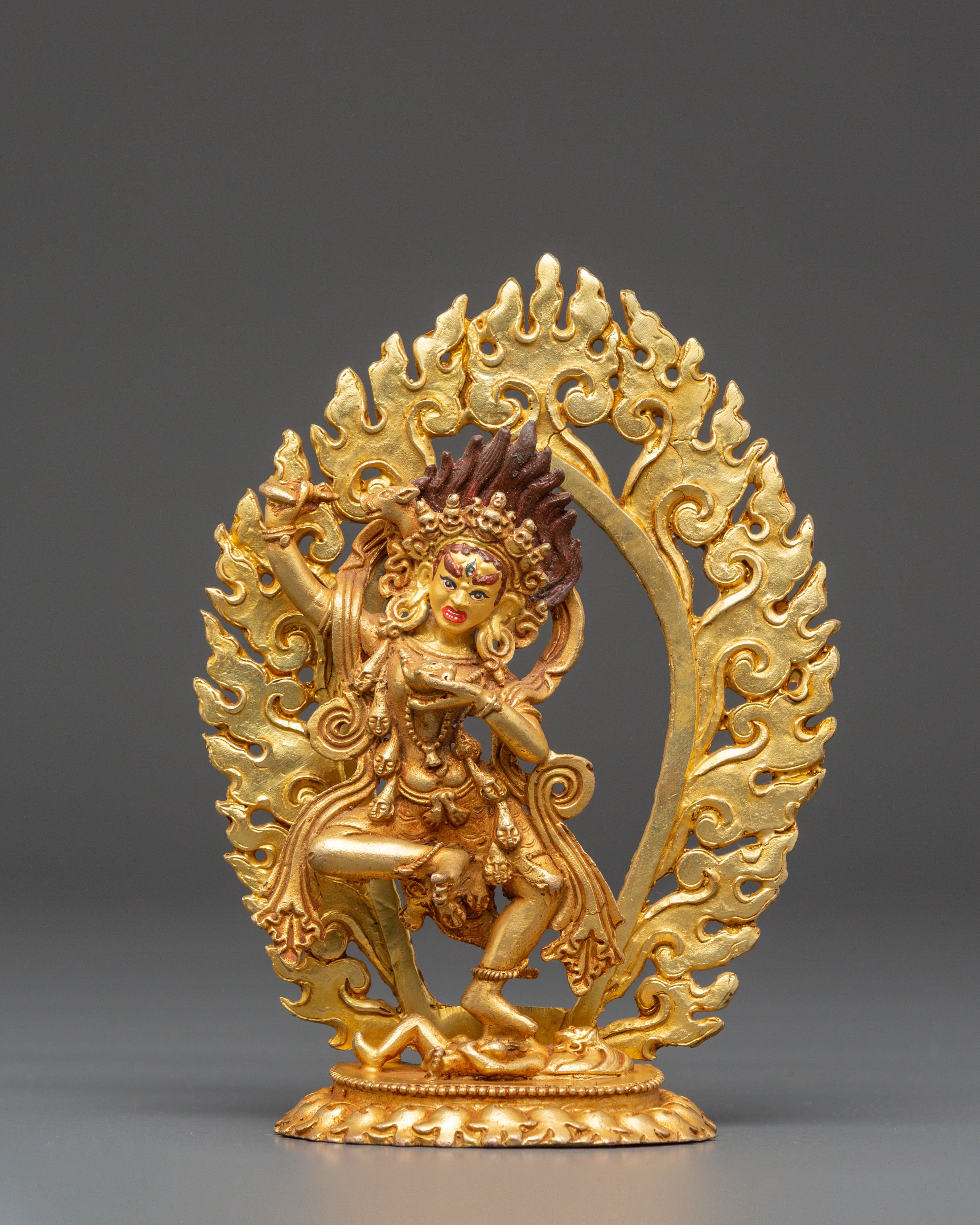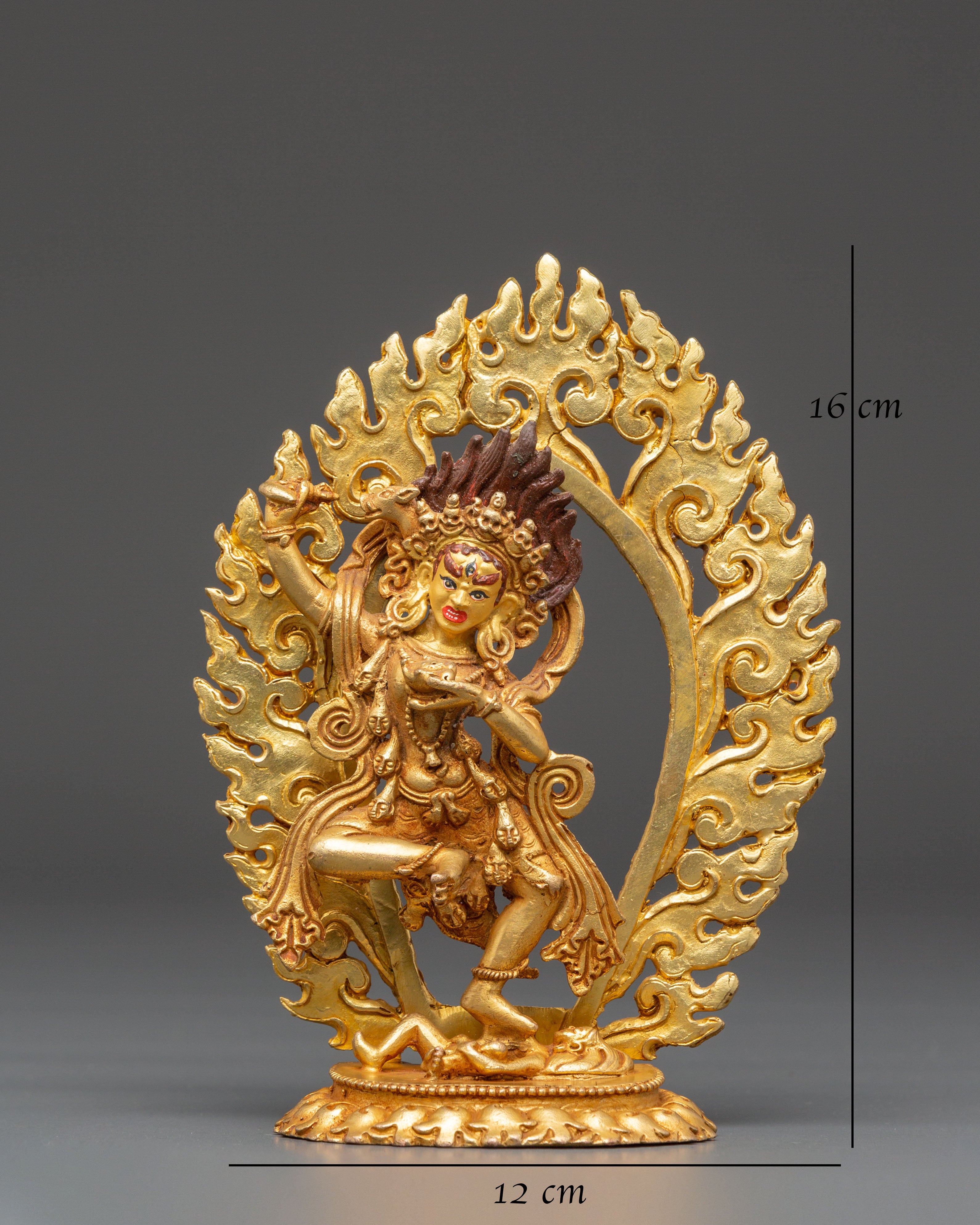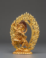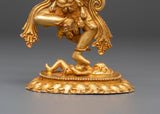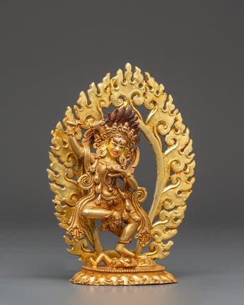 This Dorje Phagmo Fierce Female Deity Statue represents the fierce yet compassionate energy of Vajravarahi, the enlightened goddess of transformation and ultimate wisdom in Vajrayana Buddhism. This magnificent figure, 16cm tall and made from copper with a gold-plated finish, depicts Dorje Phagmo in her dynamic dance pose, symbolizing the eradication of ego and the awakening of genuine consciousness. Her meticulously carved fire halo represents the purifying flames of knowledge that remove ignorance and impediments from the spiritual path.