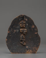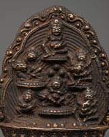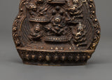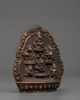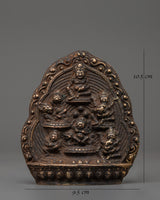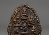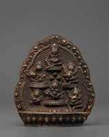 This stunning handcrafted brass sculpture has an antique polish that highlights its classic aesthetic and religious presence. The meticulous design emphasizes Dzambala's distinctive pose, which is seated with a precious mongoose, representing the never-ending flow of wealth. This sculpture, measuring 10.5 cm in height and 9.5 cm in breadth and weighing 0.35 kg, is excellent for altars, meditation rooms, or sacred areas. Whether used for personal devotion or as a thoughtful gift, this Tibetan Buddhist wall hanging exudes spiritual blessings and richness.