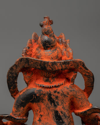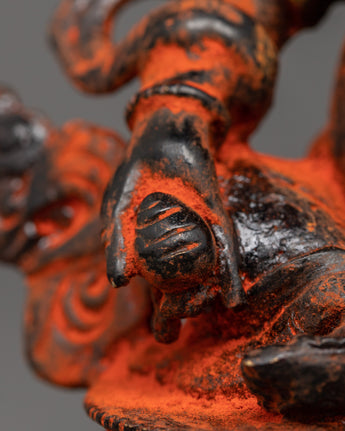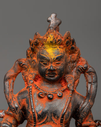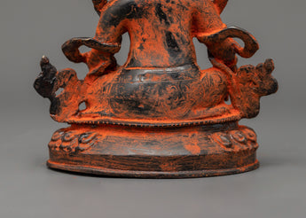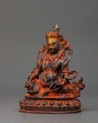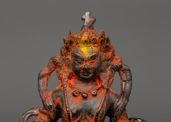 Dzambhala is shown seated, holding a mongoose in his left hand to represent the removal of material and spiritual impediments. In contrast, his right-hand rests in Granting Mudra with Citron Fruit. His crown, encrusted with magnificent gems, symbolizes the prosperity and plenty he bestows to his disciples. Dzambhala's strong yet sympathetic visage reminds practitioners of his protective nature and capacity to alleviate poverty by providing spiritual and practical gifts. This figurine is perfect for spiritual decor, attracting prosperity and positive energy.