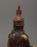 This oxidized copper figurine, expertly created by trained artisans, features the meticulous craftsmanship of Padmasambhava's tranquil yet intense visage while holding his distinctive staff and vase, symbolizing spiritual development and infinite compassion. This spiritual statue protects your home or temple from harm and gives serenity, wisdom, and heavenly blessings. This item is ideal for people seeking spiritual protection, wisdom, and enlightenment.