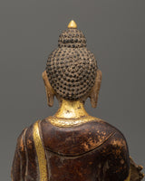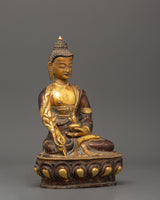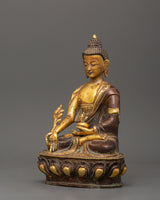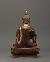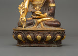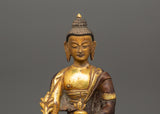 Medicine Buddha for Shrine, expertly created from oxidized copper with gold-plated embellishments, is a revered emblem of healing, knowledge, and spiritual development. Standing 22cm tall and weighing 1.57kg, this magnificent Tibetan Buddhist statue is prized for its ability to promote physical, mental, and spiritual well-being. Medicine Buddha, also known as Bhaisajyaguru, holds a medicine bowl and a myrobalan plant, symbolizing his ability to heal and restore balance to all beings.