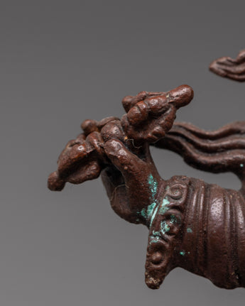 The Dorje Legpa Protector Deity Statue is a powerful representation of Tibetan Buddhist iconography and sacred energy. It is 14 cm tall and made of oxidized copper. It depicts the wrathful guardian seated on a snow lion, surrounded by a fiery halo. The dramatic flame pattern represents the eradication of ignorance and obstructions, while Dorje Legpa's fierce expression and uplifted vajra indicate protection, clarity, and everlasting devotion to the dharma. His dynamic attitude and intricate clothing symbolize the spiritual strength he bestows upon people who invoke him during meditation or ritual practice.
