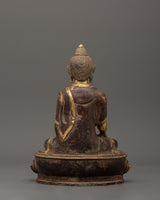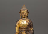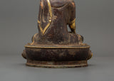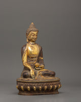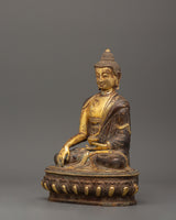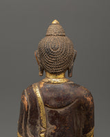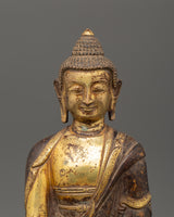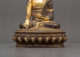 Handcrafted by expert artisans, this sacred Buddhist sculpture features delicate details such as Shakyamuni Buddha's tranquil expression and the flowing robes that signify his divine presence. The oxidized copper finish and subtle gold plating add to its beauty, making it an excellent altarpiece, meditation aid, or sacred decor for your home, temple, or spiritual sanctuary. This heavenly image of the Buddha brings calm, knowledge, and enlightenment into your area.