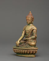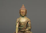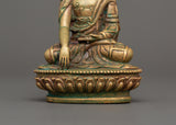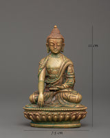 This 11 cm tall and 7.5 cm broad statue of Shakyamuni Buddha, revered as a spiritual teacher, embodies the Buddha's peaceful and profound teachings. Weighing just 0.29 kg, it is perfect for any altar, meditation space or as a gift to encourage spiritual growth. The statue is crafted from oxidized copper and features a stunning gold-plated finish, enhancing its elegance and timeless appeal. Shakyamuni Buddha, often regarded as the spiritual teacher, represents enlightenment and the path to inner peace.