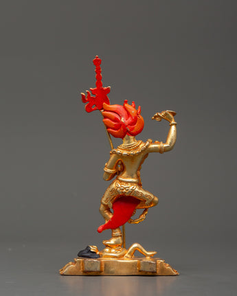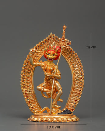 This Simhamukha Statue portrays the ferocious lion-headed goddess of Tibetan Buddhism, representing strength, protection, and the fierce force of compassion. This statue, which stands 15 cm tall and 10.5 cm wide, is finely constructed from copper with electro-gold plating and delicate acrylic details. Weighing 0.432 kg, it is an ideal ornamental object representing heavenly energy and spiritual protection.