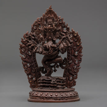 This Tantric Hevajra Sculpture is a remarkable portrayal of one of Tibetan Buddhism's most renowned deities, embodying deep spiritual meaning as well as creative ability. This handcrafted piece measures 13cm in height, 9cm in width, and weighs 0.40kg. It is made entirely of oxidized copper, giving it a rich and antique feel. Hevajra, a powerful tantric deity, is revered as a fierce defender and a representation of wisdom, transformation, and enlightenment. This statue is a valuable addition to meditation rooms, yoga studios, and home altars, encouraging spiritual practice and inner clarity.