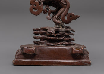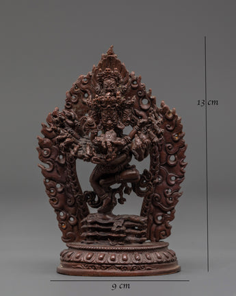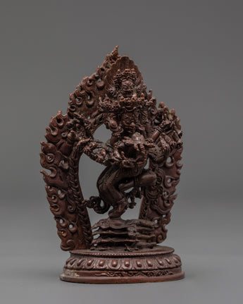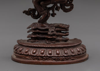 Each detail in this sculpture exemplifies the complexities and devotion of traditional Tibetan craftsmanship, portraying the deity's dynamic energy and sacred meaning. The corroded copper body provides depth and character, making it an ideal focal point for spiritual areas. Whether used for meditation, prayer, or as part of a broader Buddhist art collection, this sculpture is an authentic representation of the Vajrayana Buddhist tradition, contributing to a tranquil, deliberate environment.