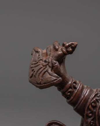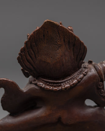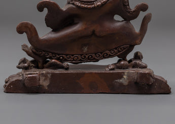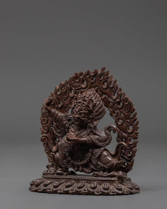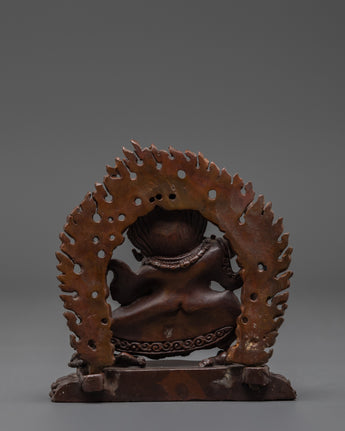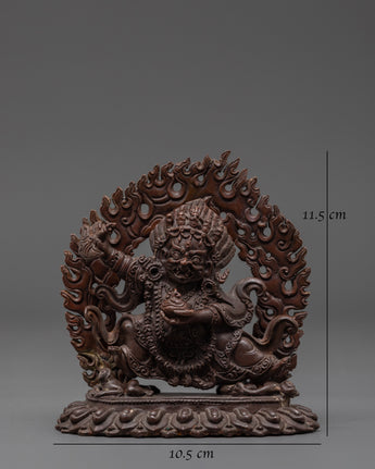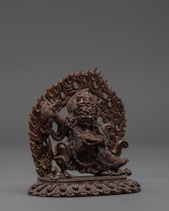 The craftsmanship pays homage to traditional Tibetan iconography, emphasizing the deity's expressive countenance, skull crown, and dynamic posture. The oxidized finish gives the piece a rich, aged appearance that heightens its presence and ritual importance. This Mahakala protector statue is ideal for use in meditation, ceremonial settings, or as a significant spiritual gift. It promotes transformation, strength, and protection. Tags: Mahakala Bernakchen statue, Tibetan protector deity sculpture, oxidized copper Buddhist art, wrathful altar décor, guardian deity figurine.