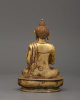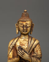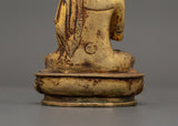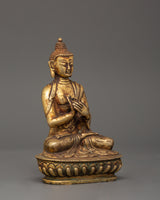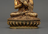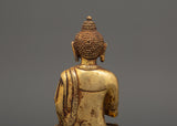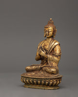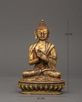 The handcrafted Vairochana Buddha statue is a strong image of universal truth and transcendence in Tibetan Buddhism. This gold-plated copper figurine, measuring 15cm tall and 10cm broad, represents the Dharma and the realization of emptiness, making it an essential spiritual artifact for altar adornment, meditation, and Buddhist practice. Vairochana, also known as the Primordial Buddha, is the focal point of the Five Dhyani Buddhas, disseminating light and wisdom over all realms.