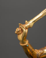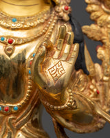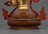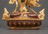 This magnificent Tibetan Wisdom Deity Manjushri Statue, crafted from oxidized copper and gold-plated, stands 34 cm tall and 24 cm wide. This powerful deity is renowned for granting clarity, insight, and the ability to discern truth from illusion. Having Manjushri in your environment will enhance knowledge and spiritual enlightenment, helping to remove obstacles and confusion on the path to wisdom.